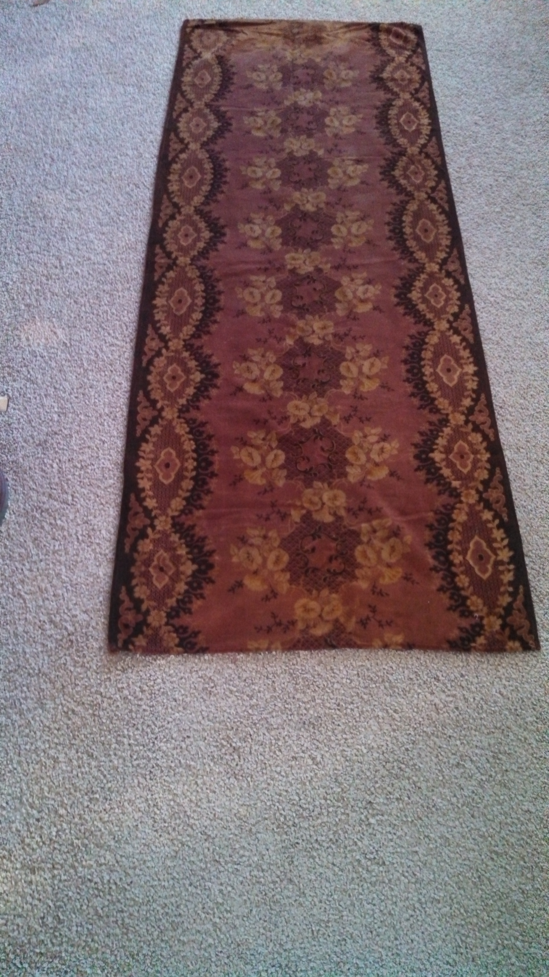 This is a runner probably from the 1950's.  It has a floral design and is in great condition.  It is 7 by 2.5 feet.  The colors are brown tones with gold.