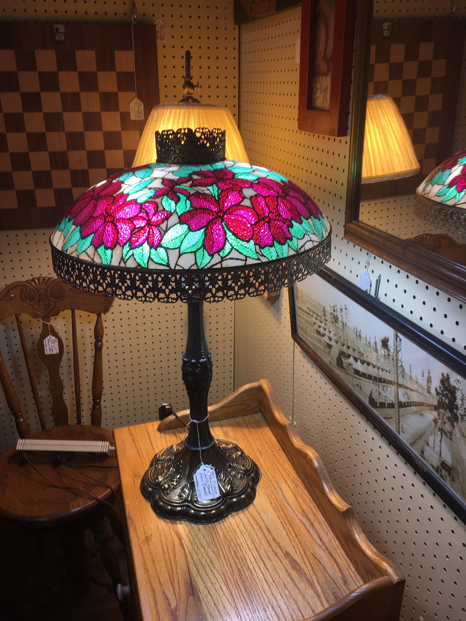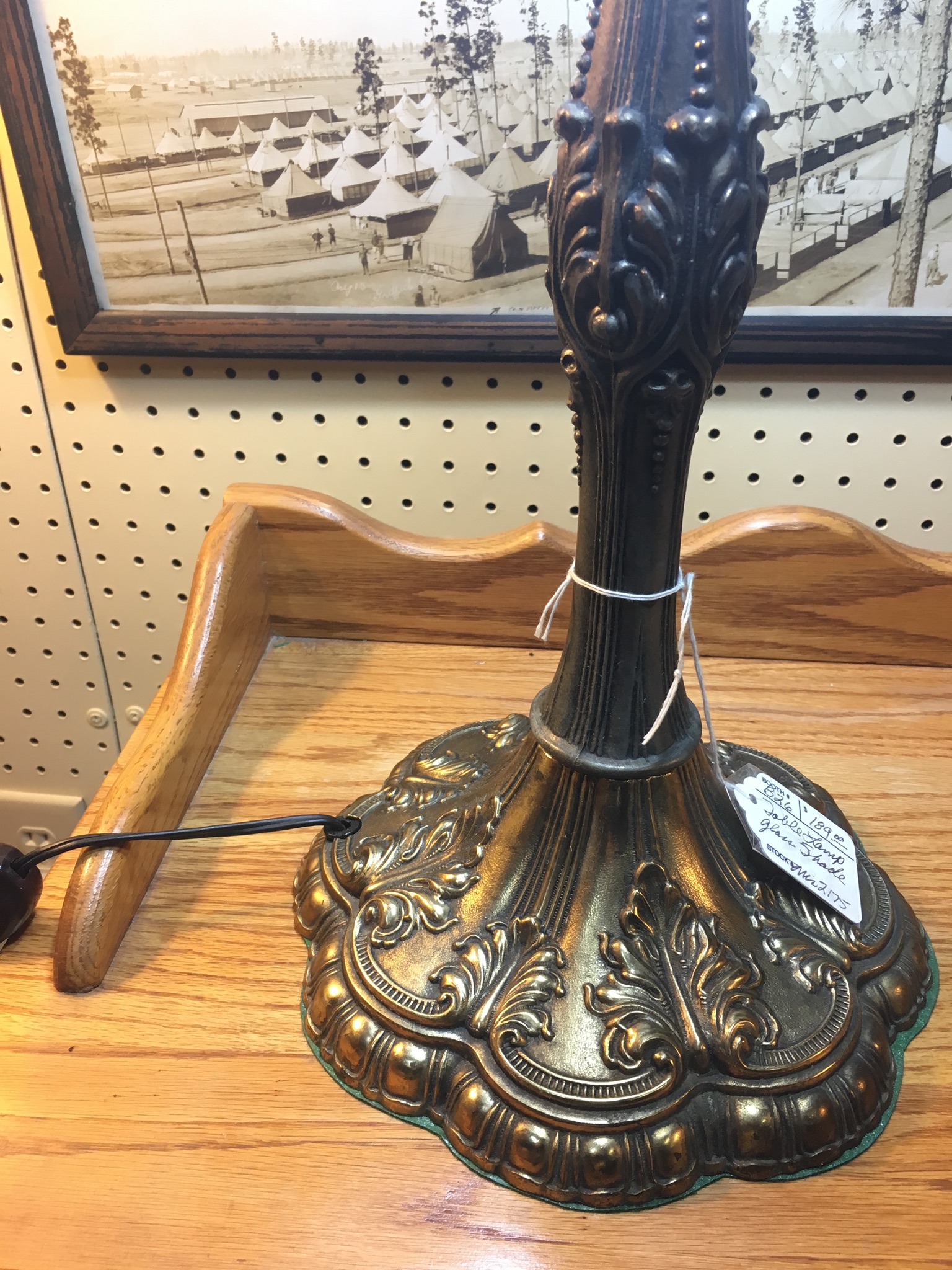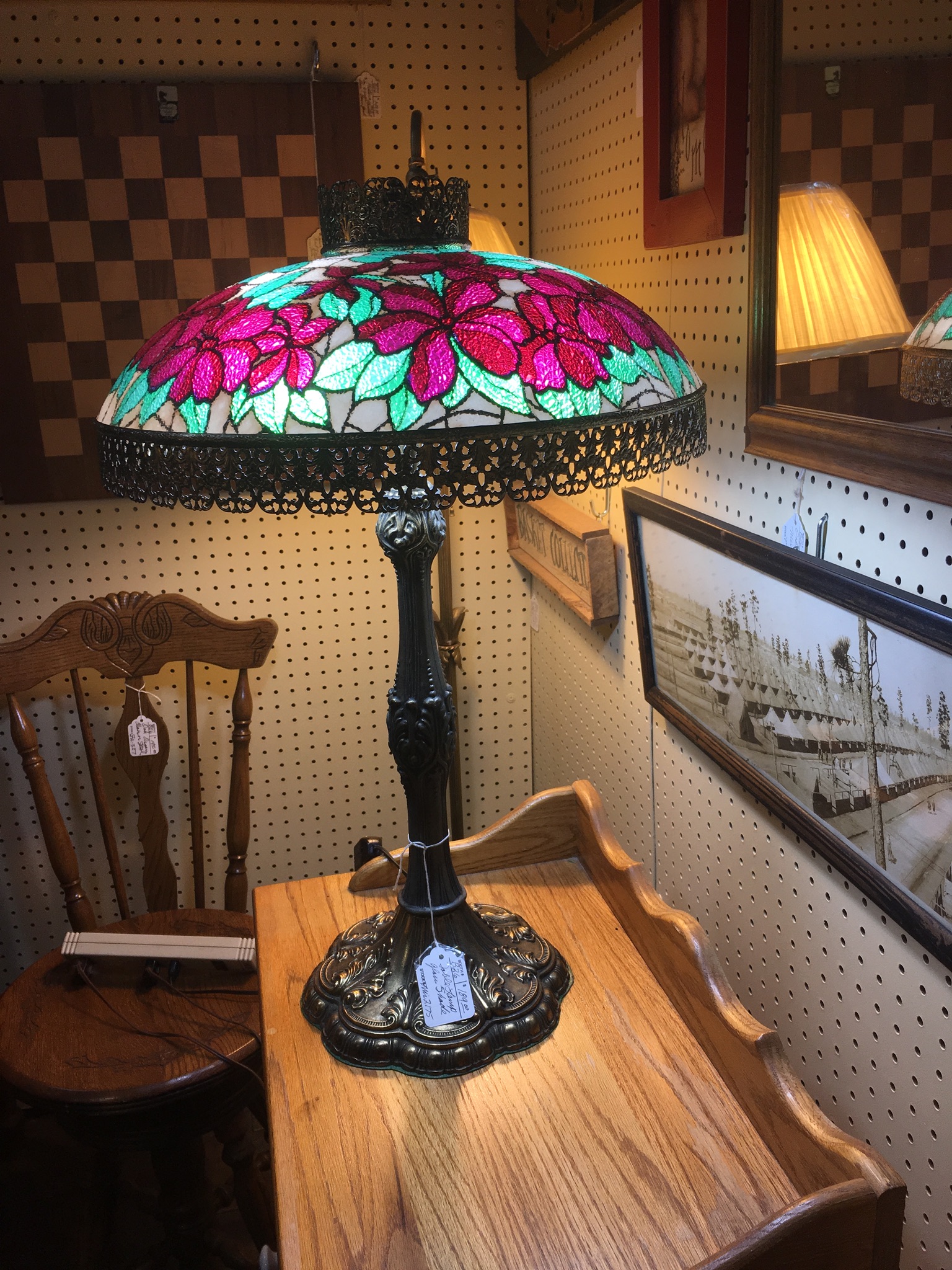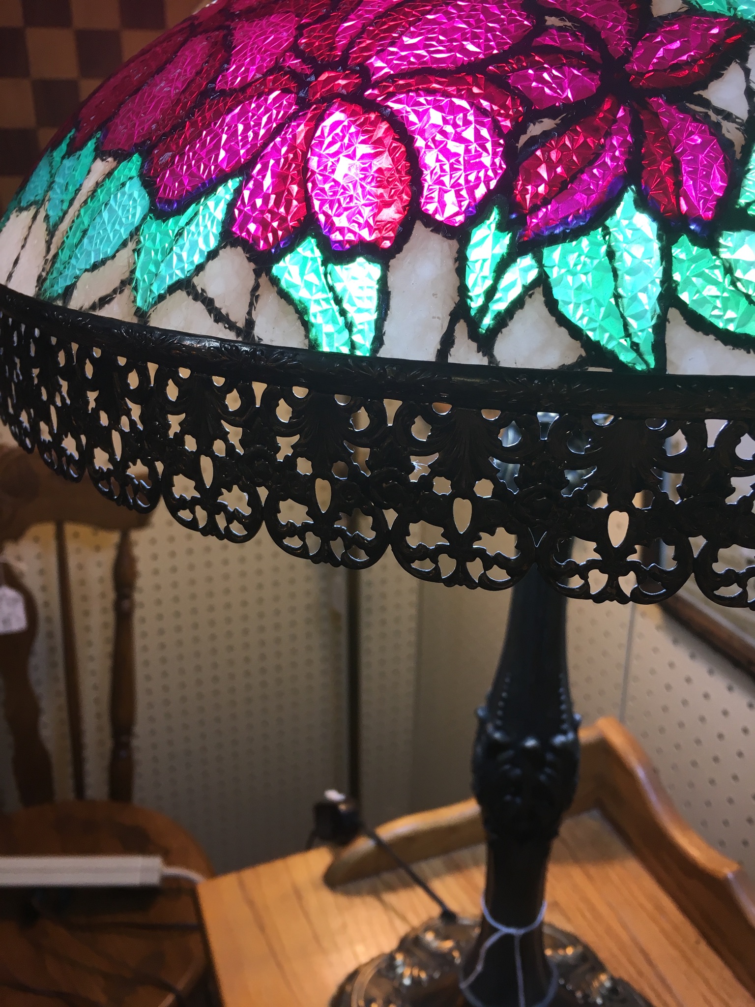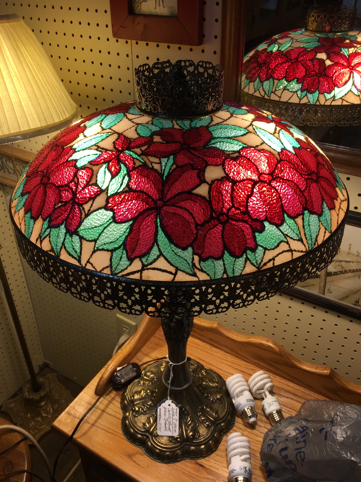The base if lamp is quite light, the on and off switch for it is on the cord of the lamp. The on off switch says " Eagle ". Lamp shade doesn't show the welding lines like other lamps but rather is "laminated in glass. Not sure if it is actually made up of individual stained glass pieces. listed at $189 at an antique store. I think it may be too high.