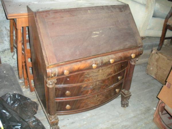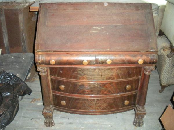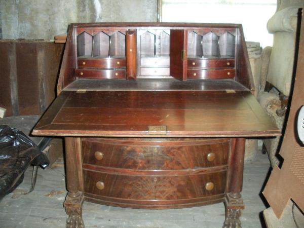 This is a wooden antique desk, with a flip down face, and hidden drawers.