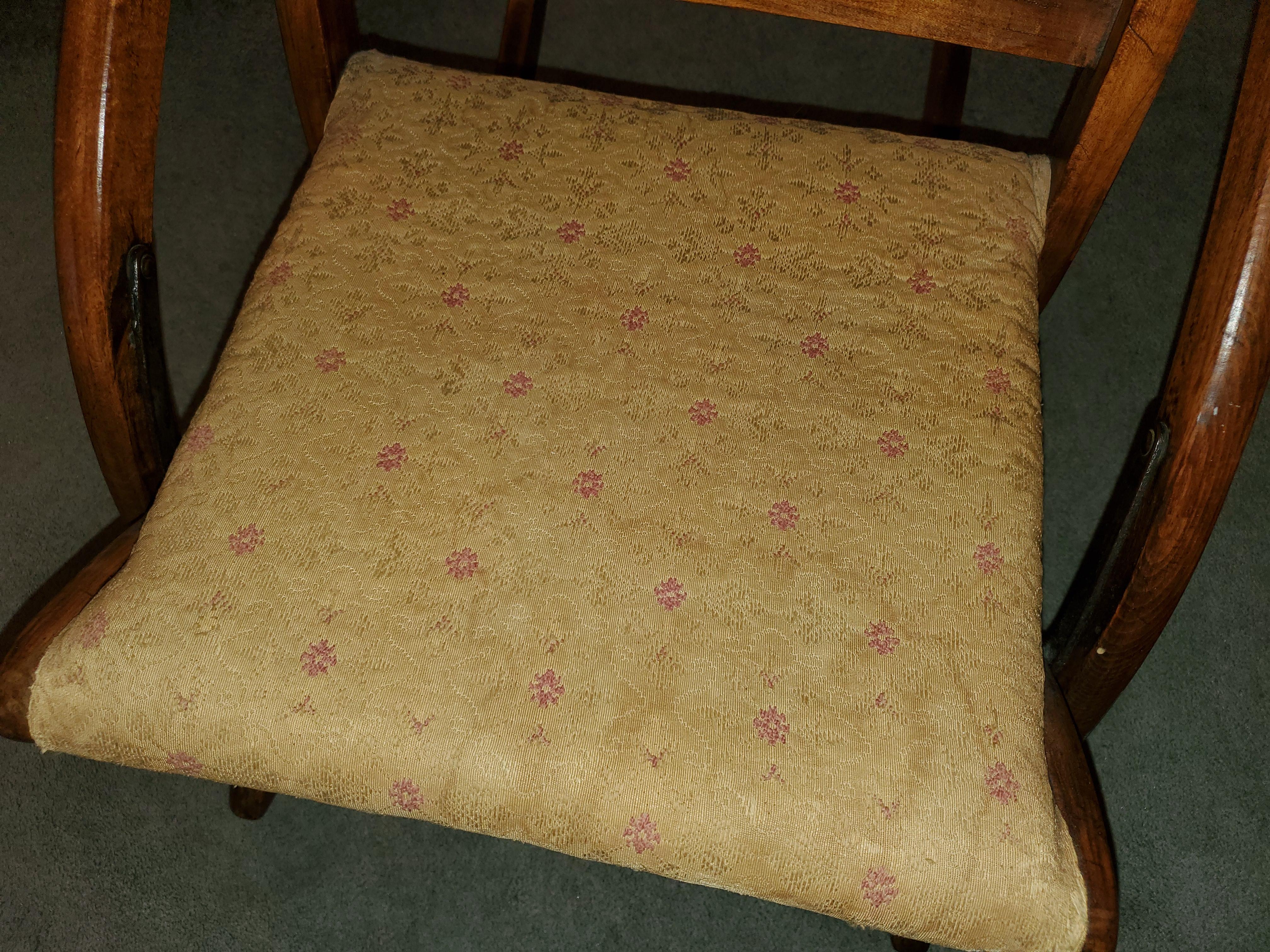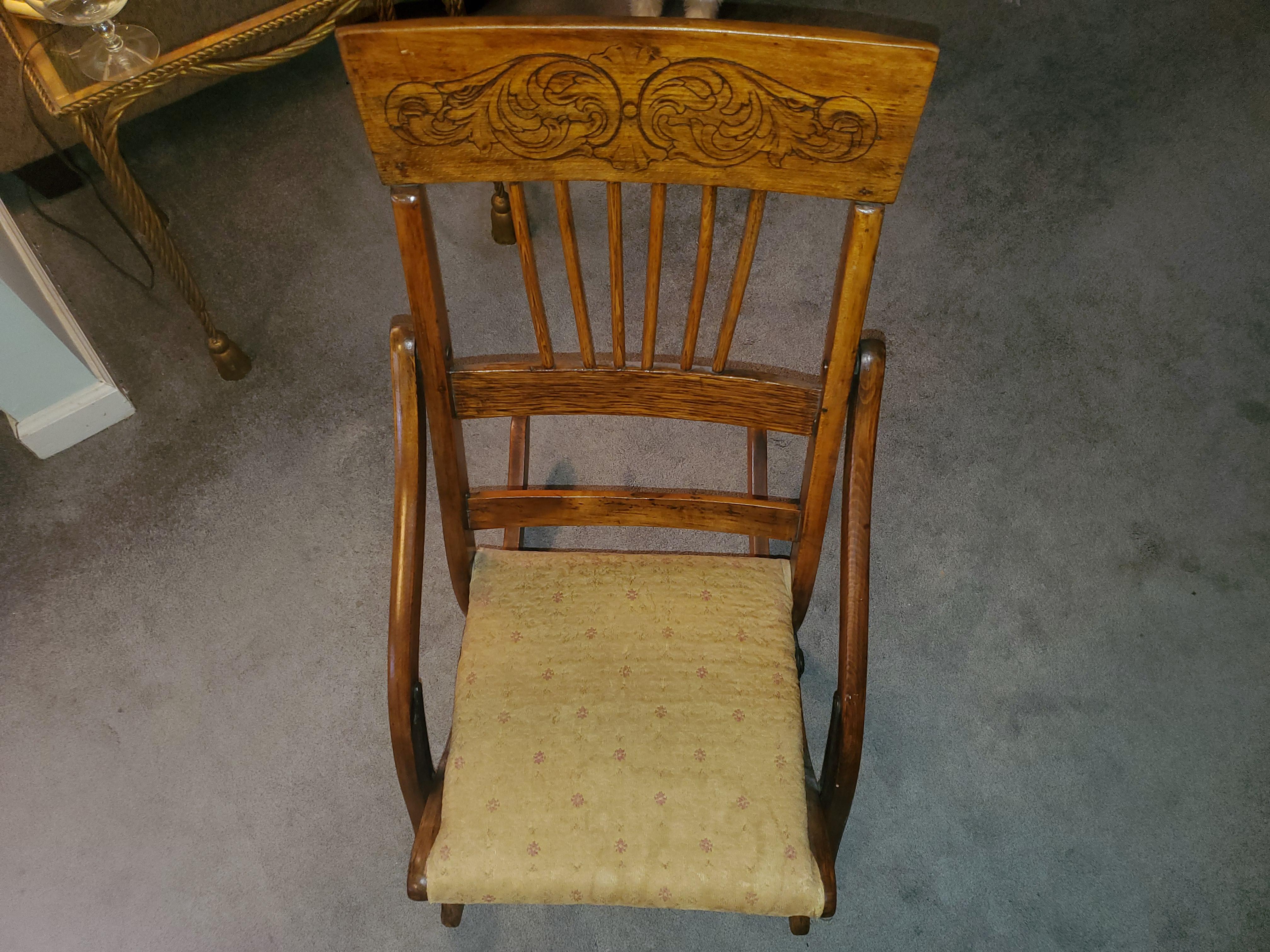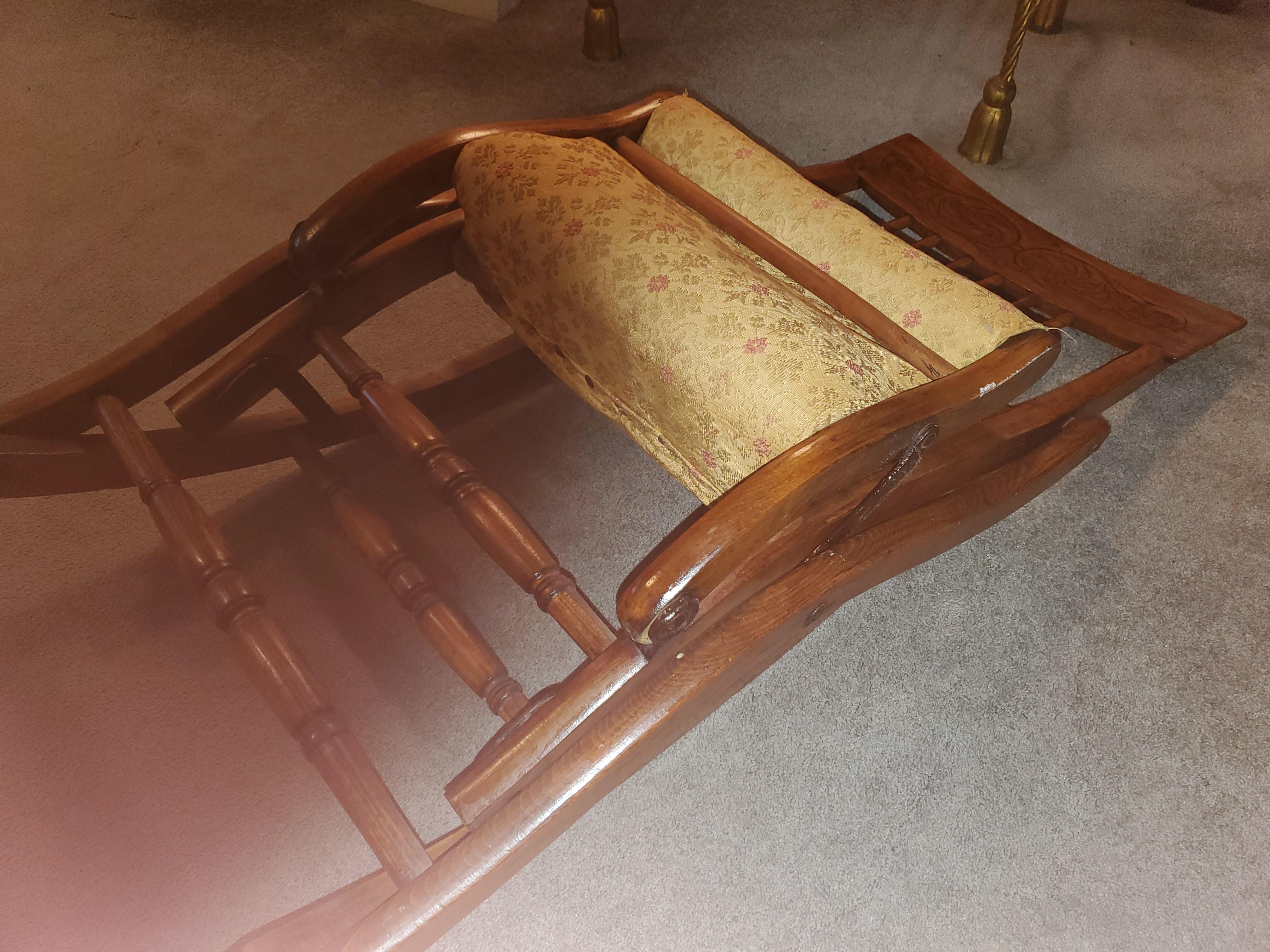 This antique folding rocking chair has been in my family for at least a few generations, maybe more. It is very well built and sturdy. I'm hoping someone might have an idea of it's age/origin, perhaps by the type of fabris over the seat (?).
