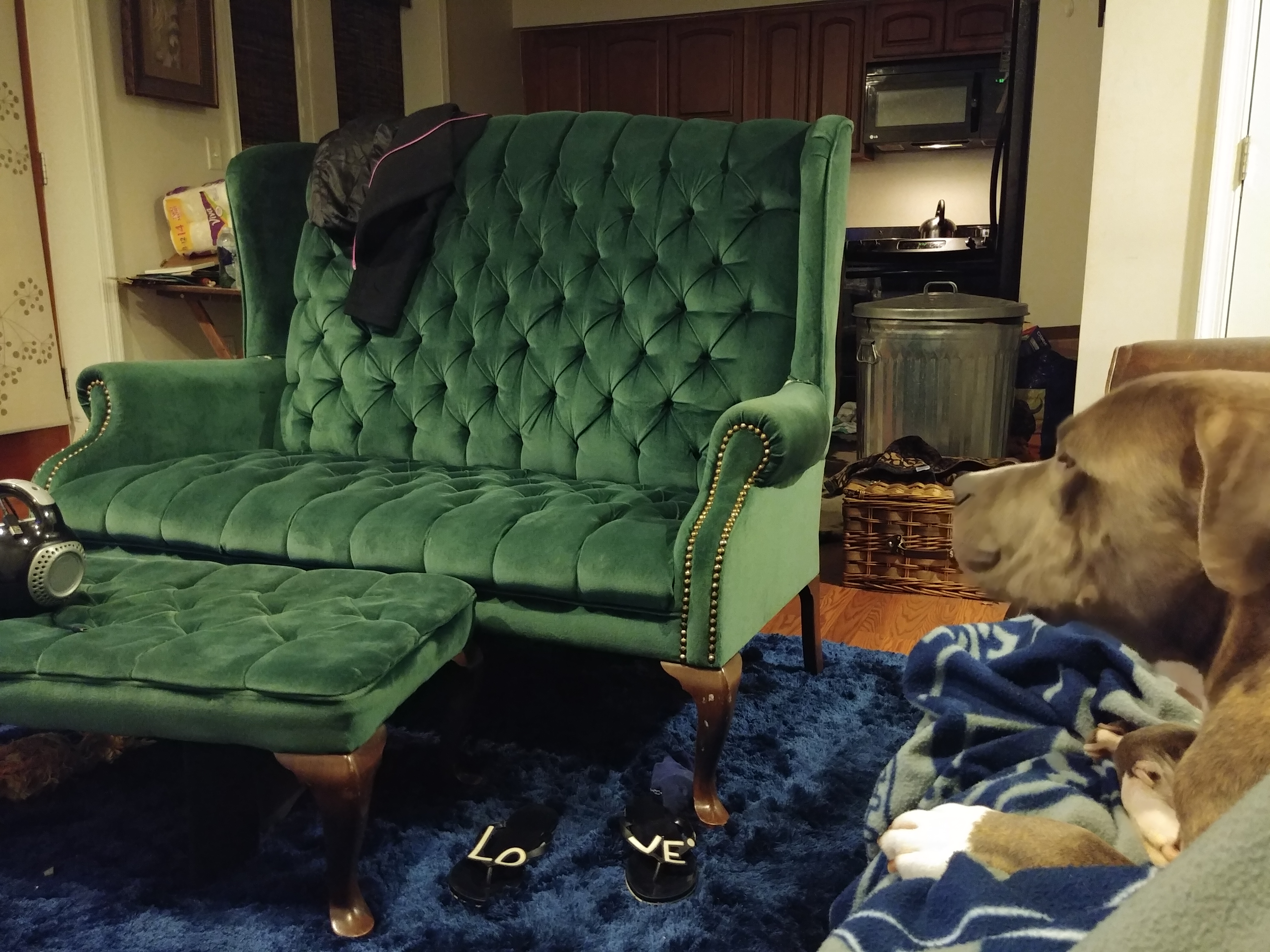 Green velvet antique living room set: One large loveseat, two chairs (each about half the size of the loveseat), and one ottoman. Unsure of other details... Please advise!