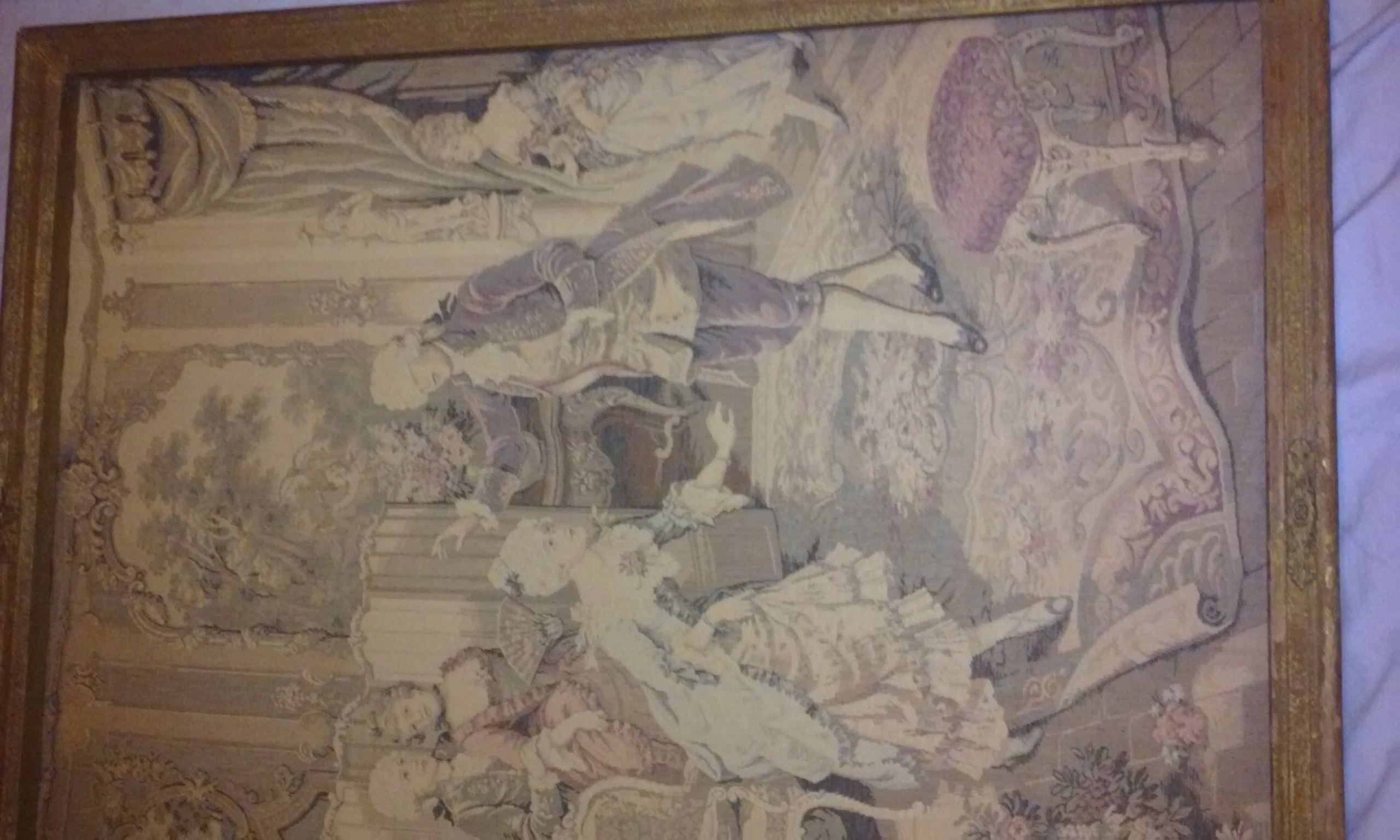 Framed tapestry. Possibly victorian era. NO LOT NUMBER OR TAG OR STAMP/MANUFACTURER MARK OF ANY SORT. Looked at the stitching with a magnifying glass and noticed it looked handmade due to uneven stitching. It is attached to the frame with nails.