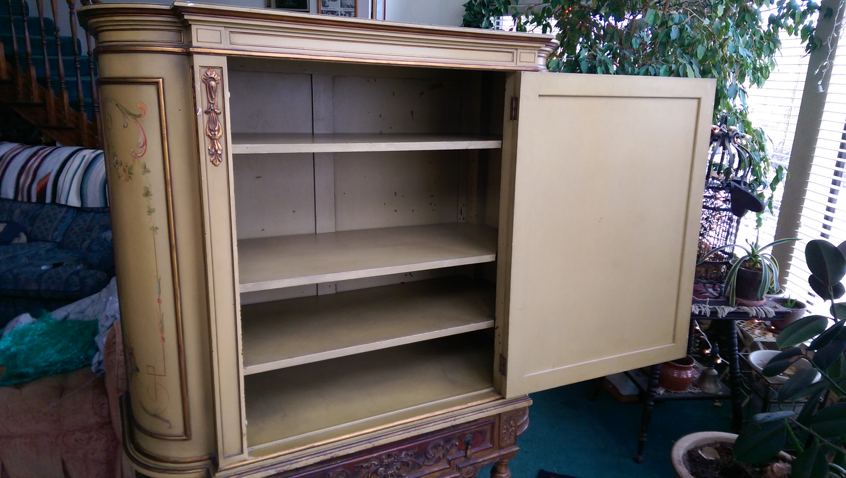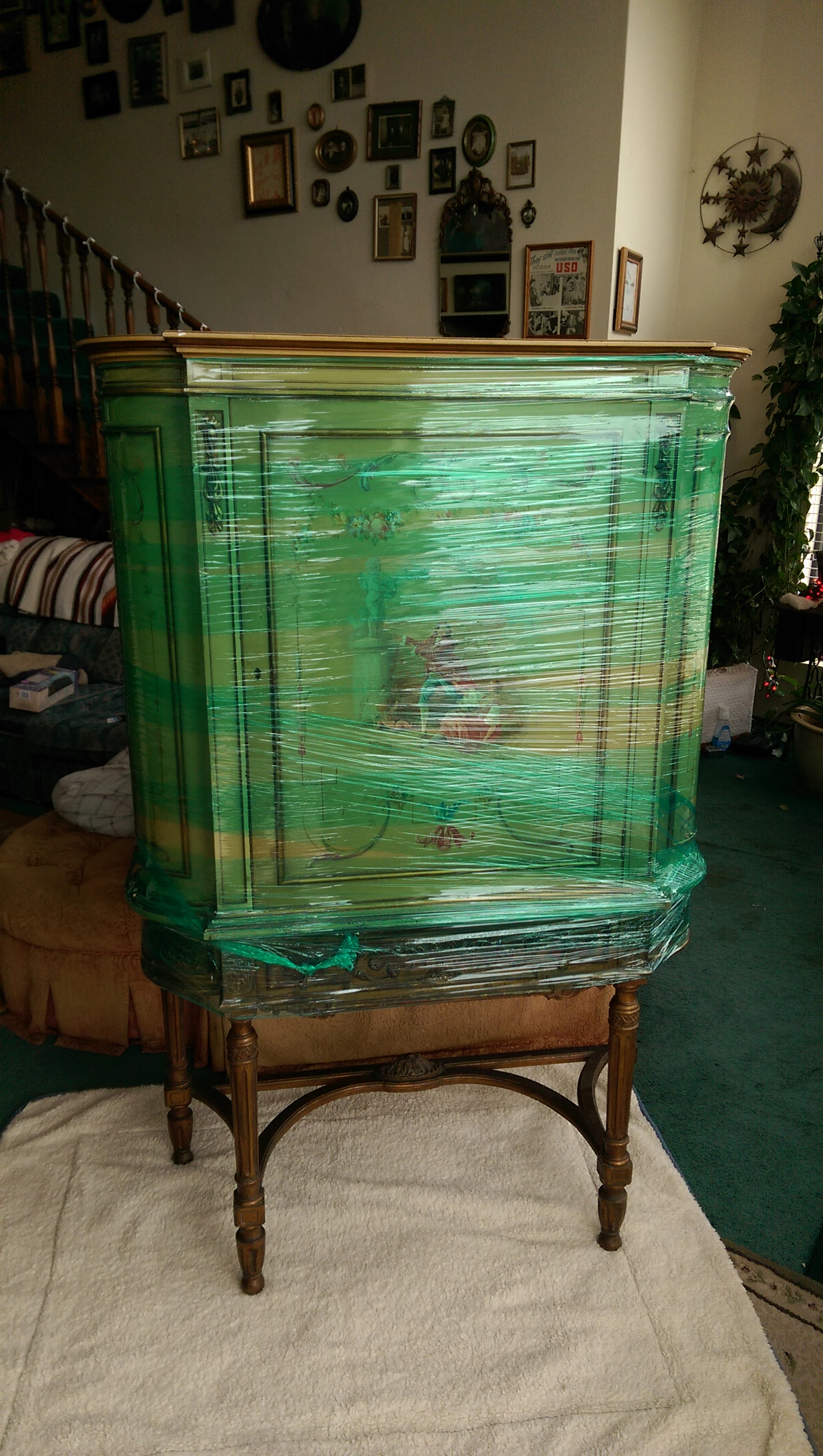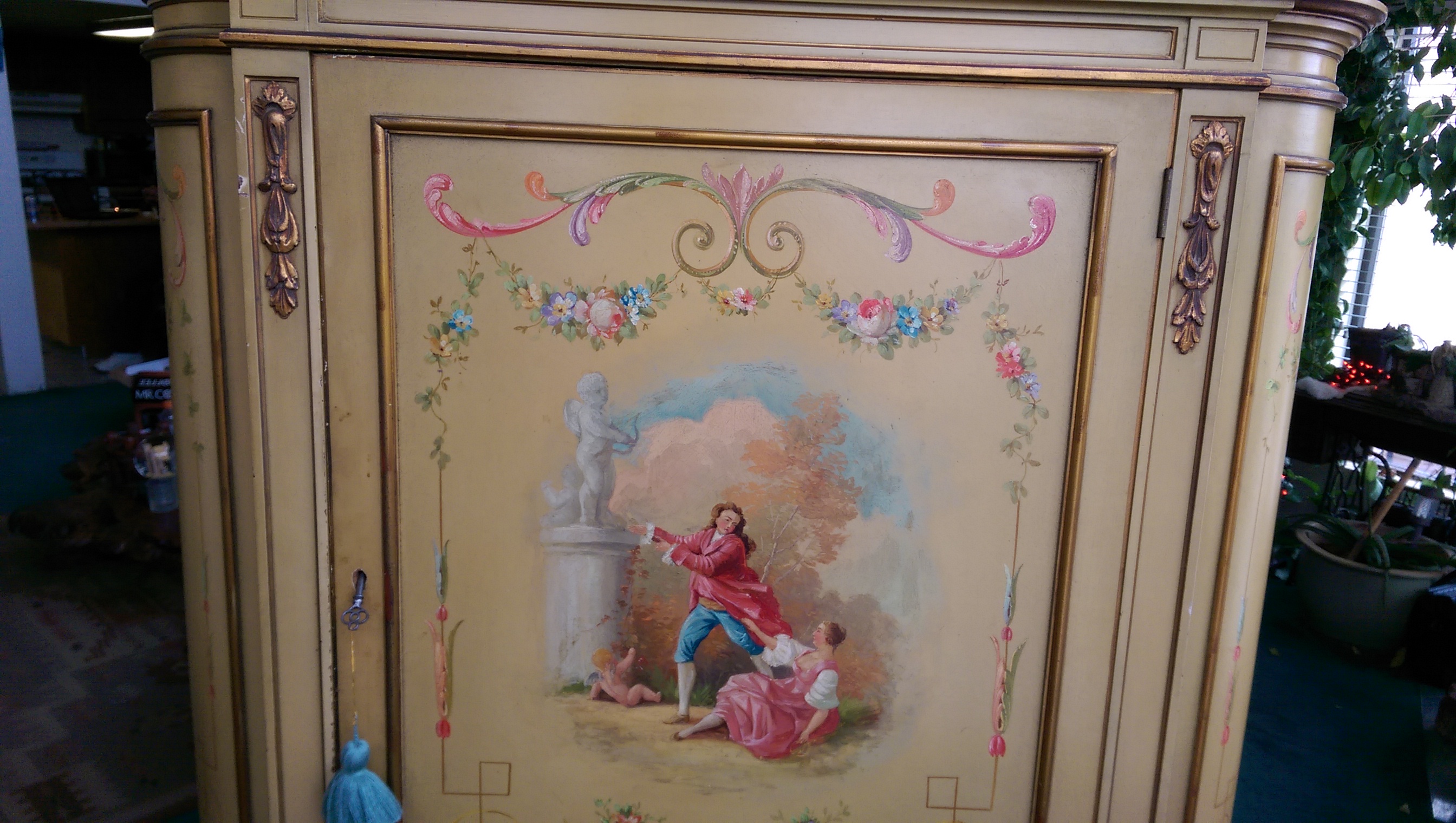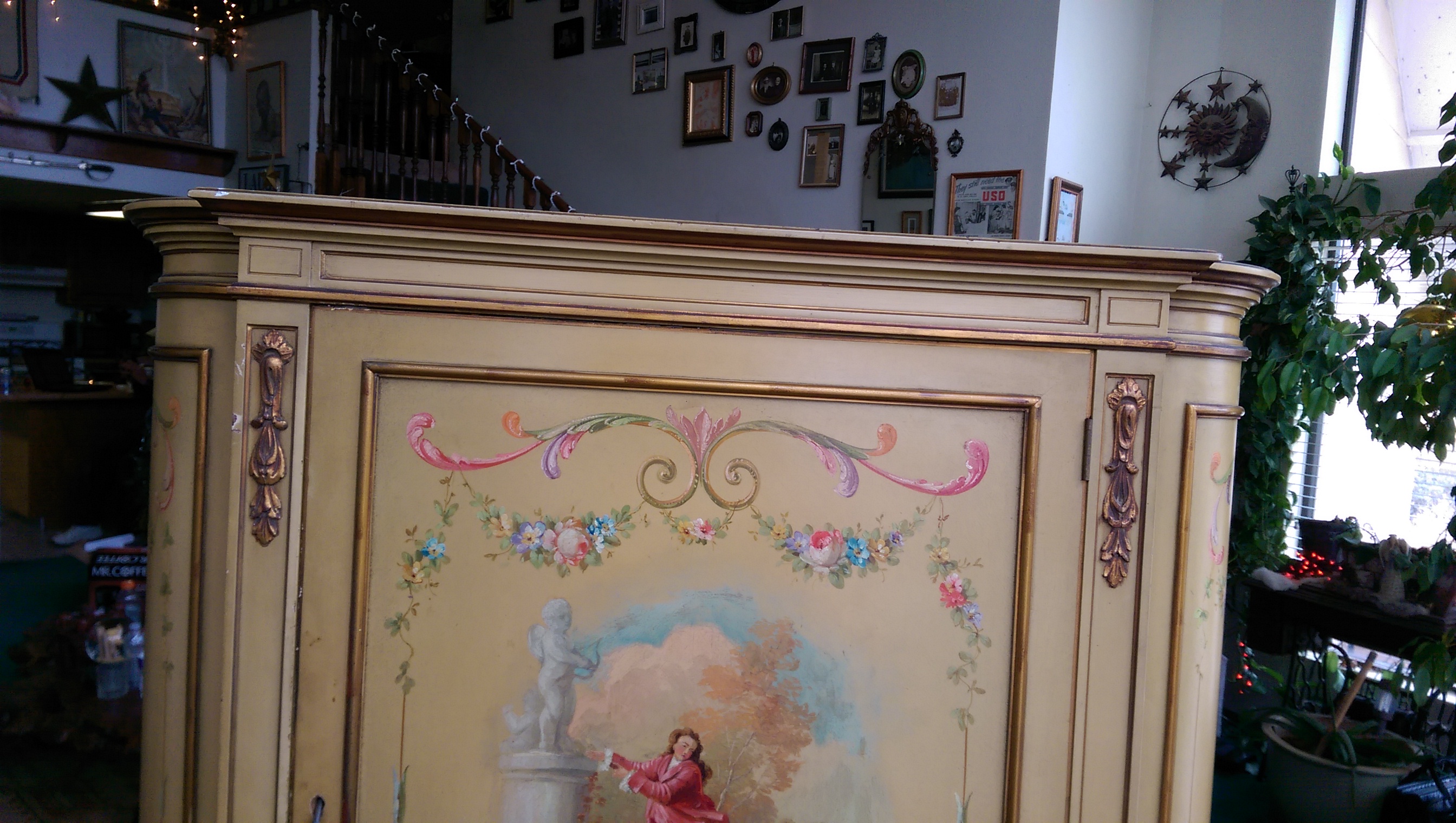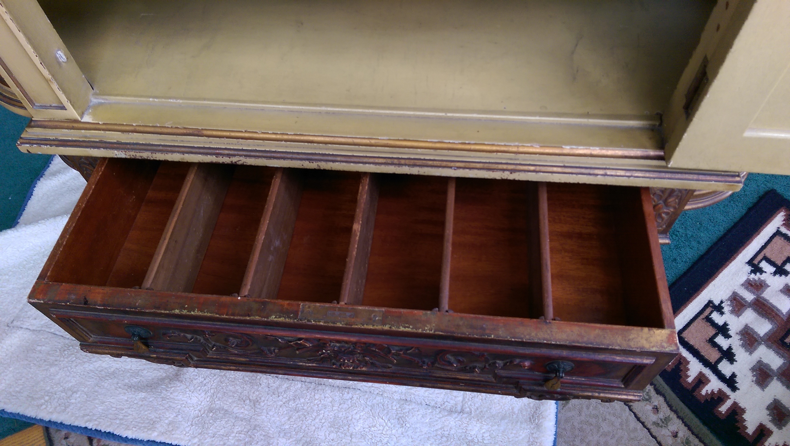 I got this from a retired customer that said she had no room for it and her kids didnt want it. She really didnt know a lot about it. Its very well made and has original artwork on the front. It also came with the skelleton key for the lock.