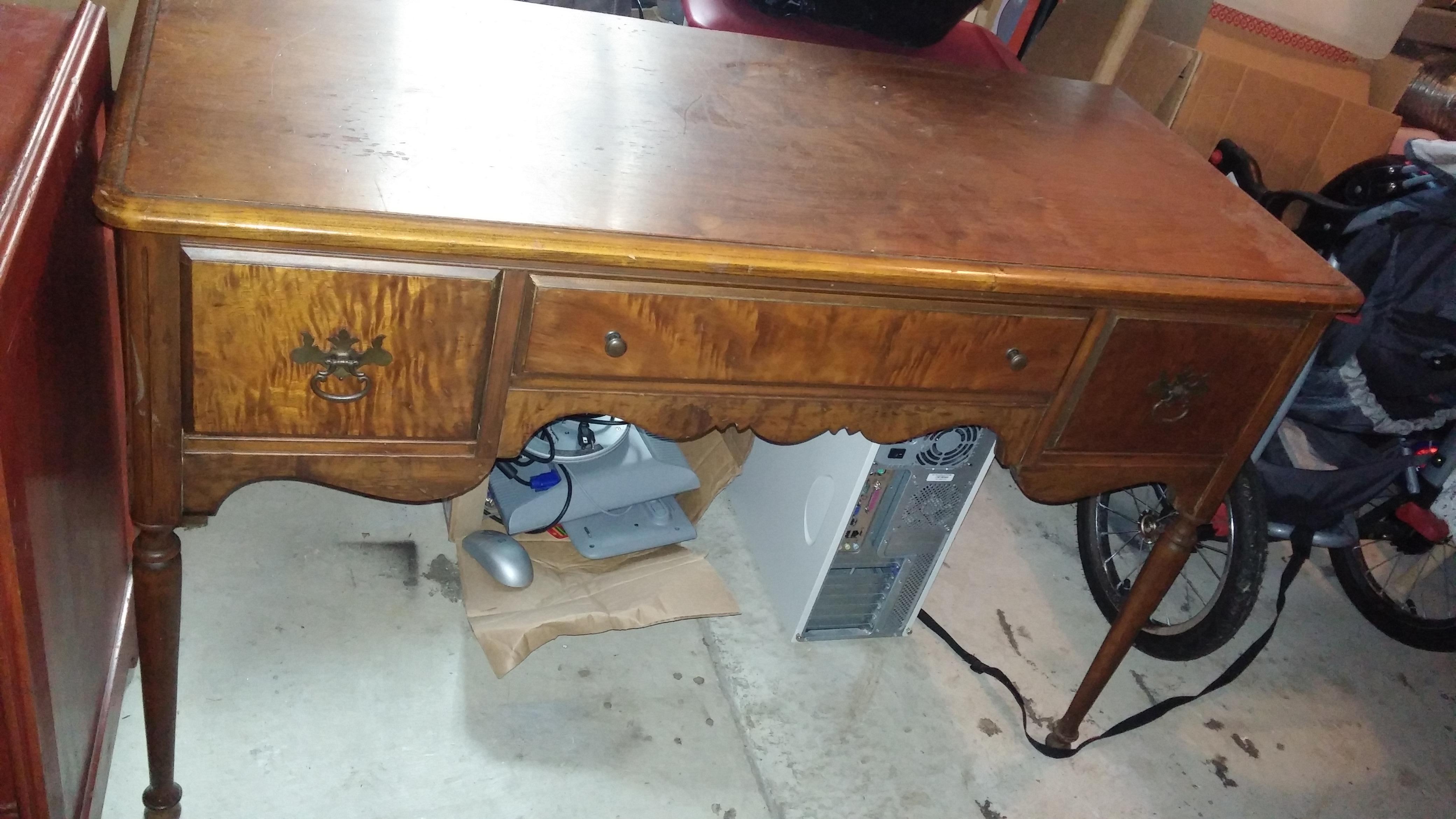 I have an antique fruit wood writing desk.  It has 3 drawers, brass pulls.  Good condition.  Would like to know more about it i.e- style, era made, etc.  Also looking for its value.  Thanks!