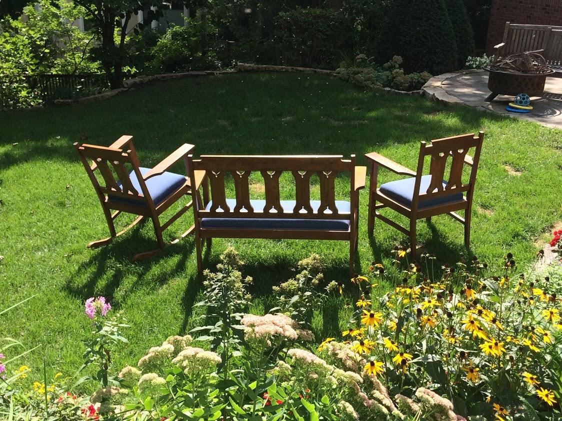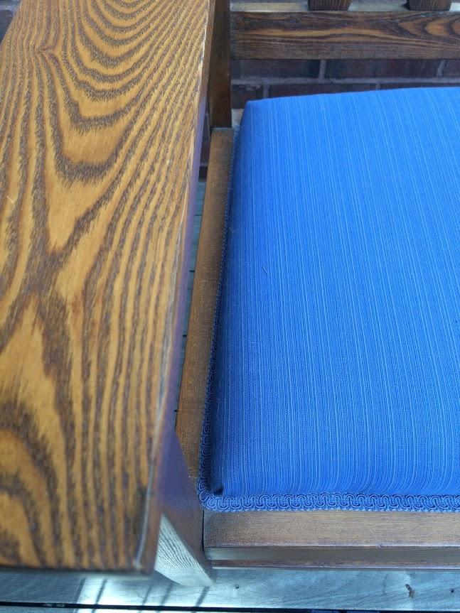 This mission-style antique set was going to be thrown out by a nearby church after sitting around for decades, until my grandma saved it from them. They gave it to her for free! She paid a fortune to have it restored, and now it's in excellent condition. It's from the 1890s and consists of three pieces: a chair, a rocking chair, and a bench. They're all wooden (I think oak), and they all have blue cushioning.