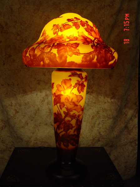 While I was living in Japan in 1998. My husband purchase this lamp for me. He bought it off base at an antique furniture store. I drove home every day and just loved the bright calm glow of it in the window. We purchased the Galle lamp for a very large amount of Yen. The shape of the mushroom top has the signature of Galle on the side. It is very tall. No cracks. The military always packed it very well every time we moved to a different locations.