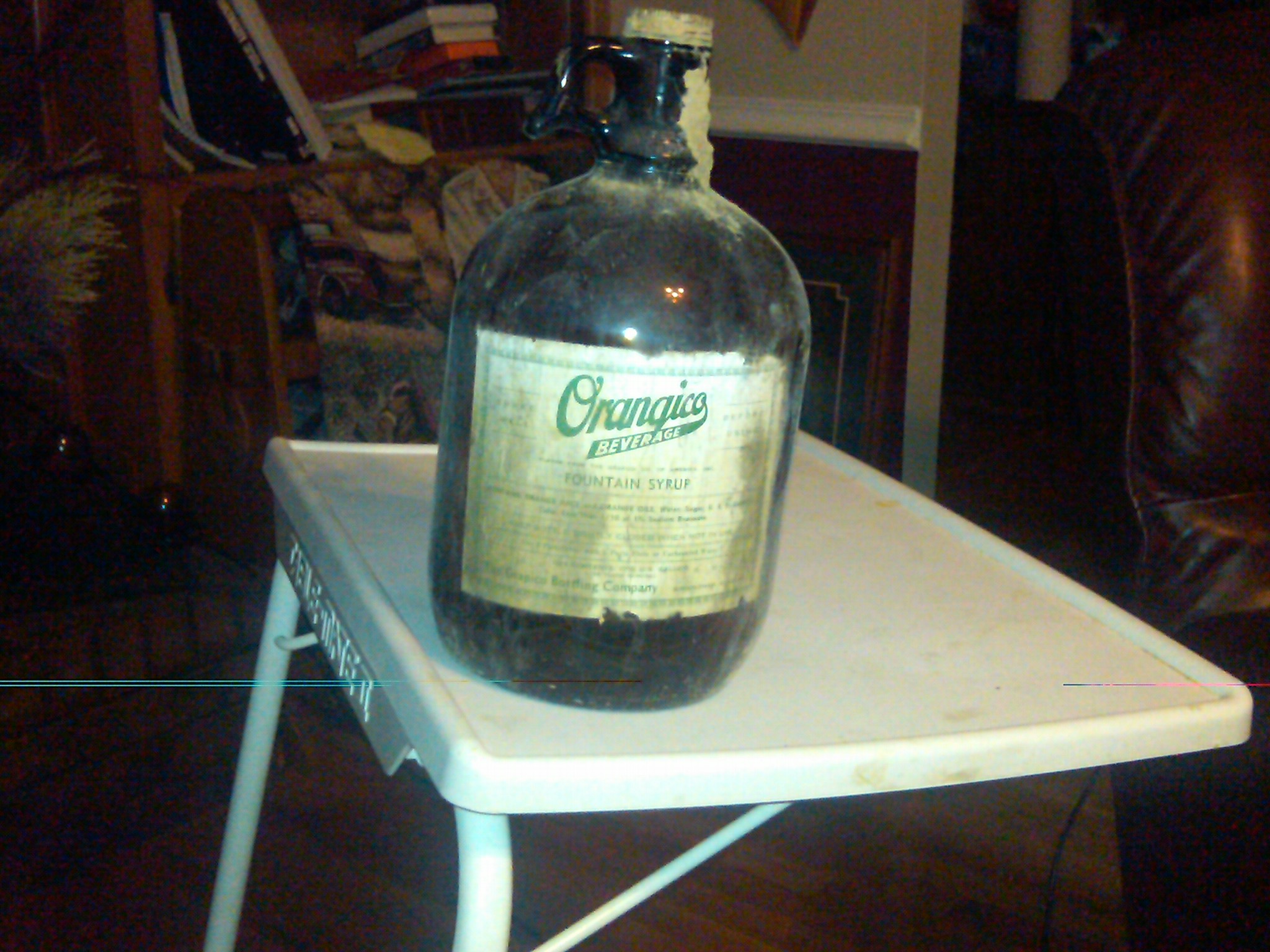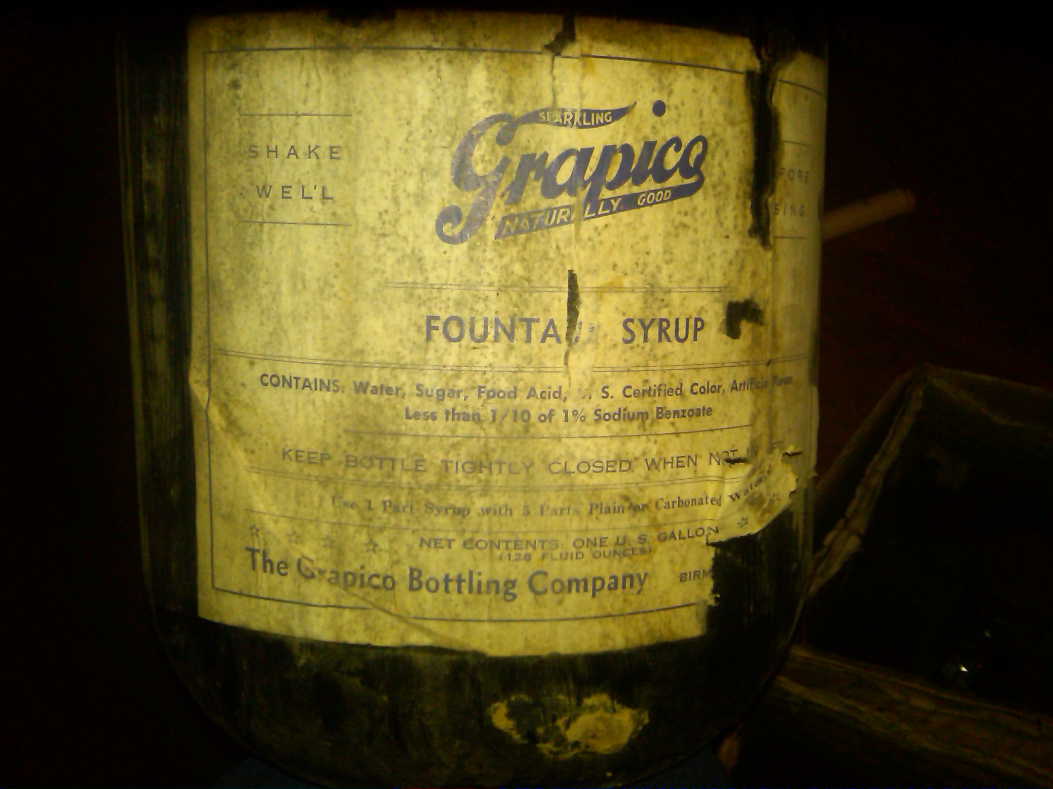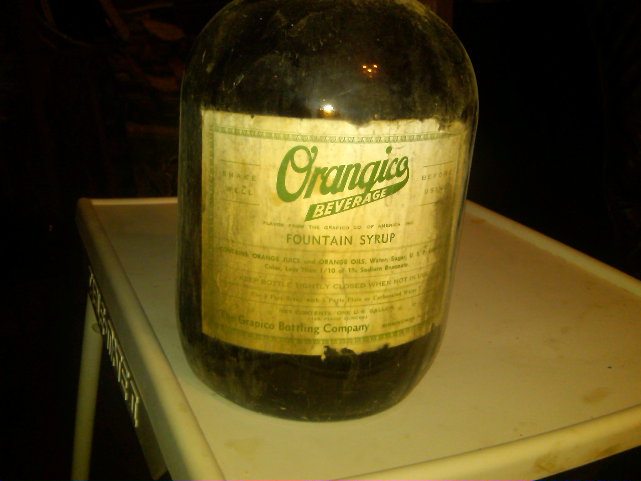 One Amber Glass jug is fully upright Green and white label That States "Orangico Beverage, Fountain syrup" shake well before using, Flavor from the Grapico Co. of America, Inc. Contains Orange Juice and Orange Oils, Water, Sugar, U.S.P certified. Color less Than 1/10 of 1% Sodium Benzoate. Keep bottle tightly closed when not in use. Use 1 part syrup with 5 parts Plain or Carbonated Water. Net contents: One US Gallon. The Grapico Bottling Company Birmingham Alabama.