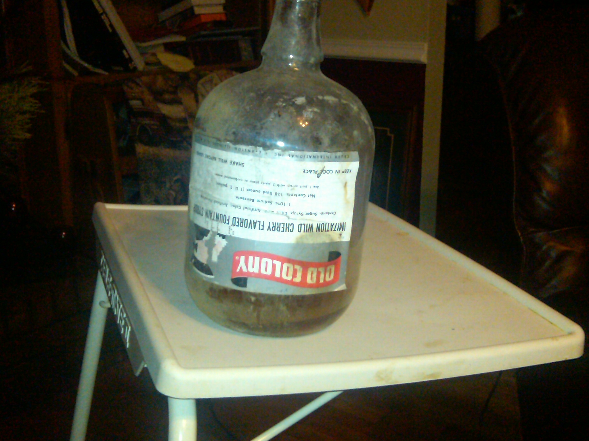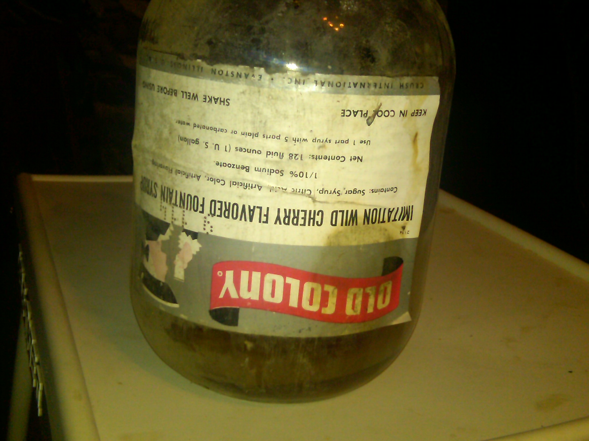 These labels state: Old Colony at the top (Red Banner white Letters) of the label followed by Imitation Wild Cherry Flavored Fountain Syrup. Contains: Sugar, syrup, Citric Acid, Artificial Color, Artificial Flavoring. 1/10% Sodium Benzoate. Net Contents: 128 fluid ounces (1 US Gallon). Use 1 part syrup with 5 parts plain or carbonated water. Keep in cool Place. Shake well before use. At the bottom in gray area is states "Crush International Inc. Evanston Illiinios U.S.A
