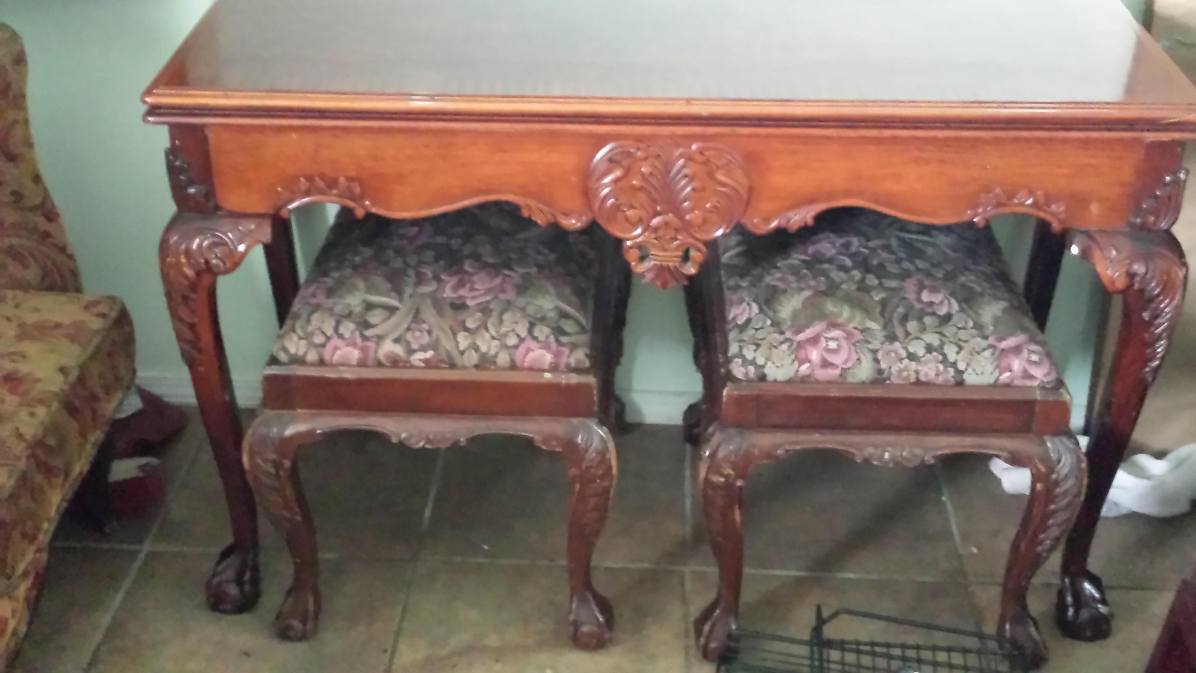 my father and grandfather were under the assumption that it was between 100 and 200 years old and it was a Chinese game table this is all the information I have on the table and the chairs
