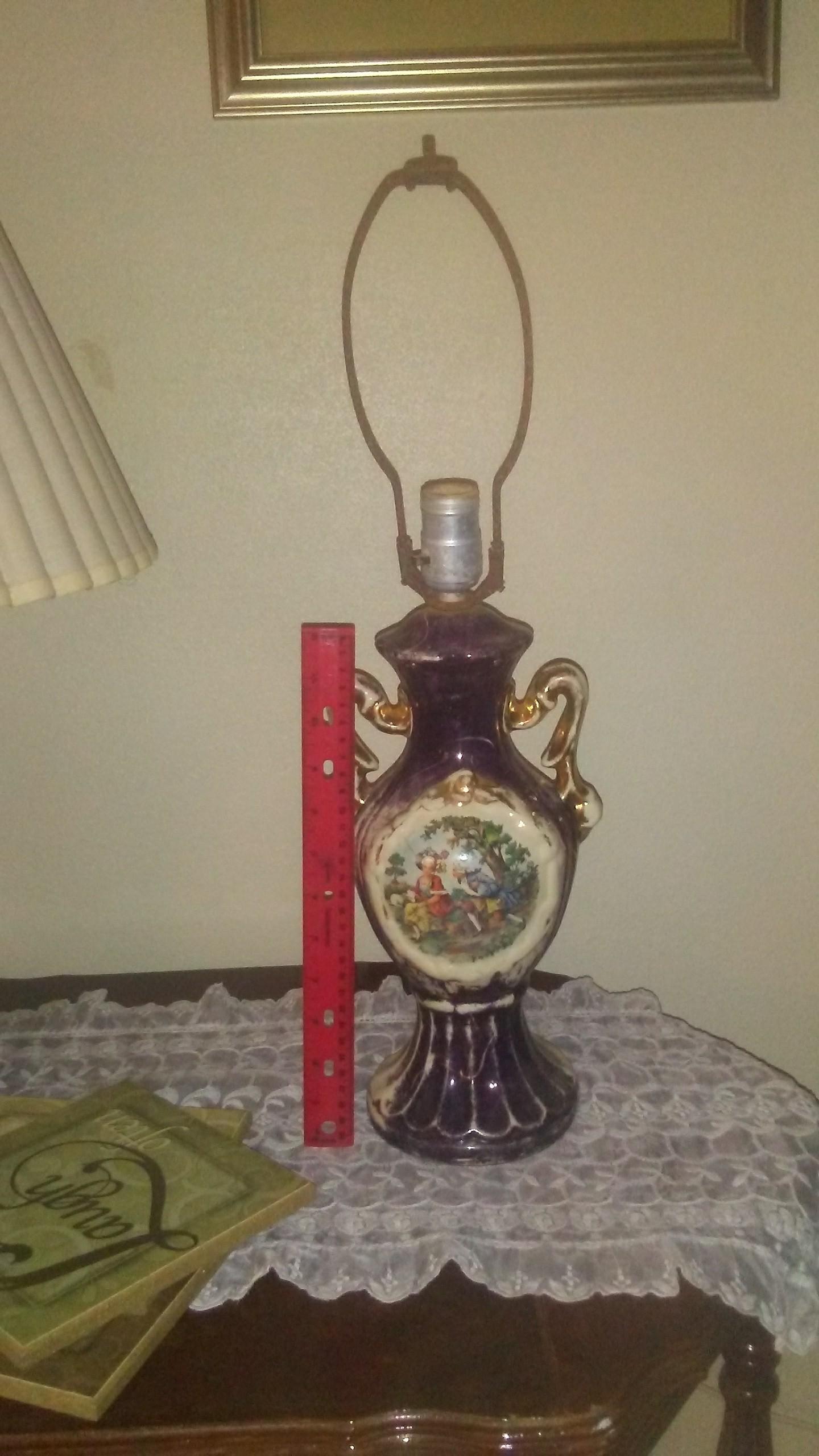 Dark purple with some white an gold trim. George an his wife is petting a sheep