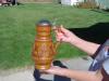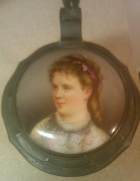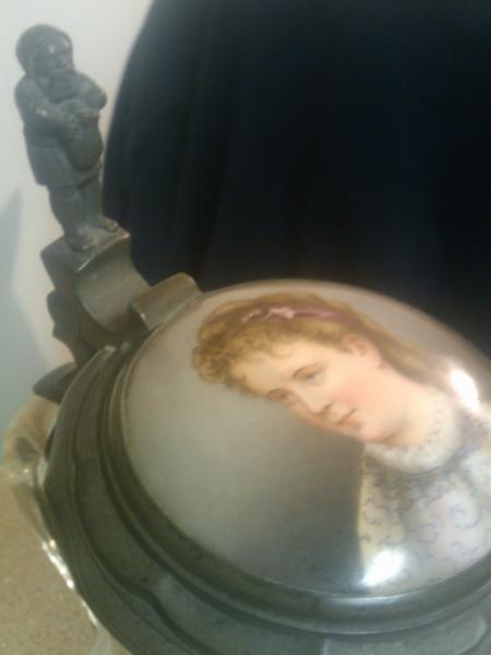 The lid is pewter with porcelain inlay. The scene in the porceline is that of a woman. On the underside of the lid there is engraving, the inscription reads: "Hefse H. Engel" and below that "Weihenstephan.Juli.1872". The underside of the lid is also stamped D Beill. The thumb lift is a depiction of what looks like a bearded man or gnome.