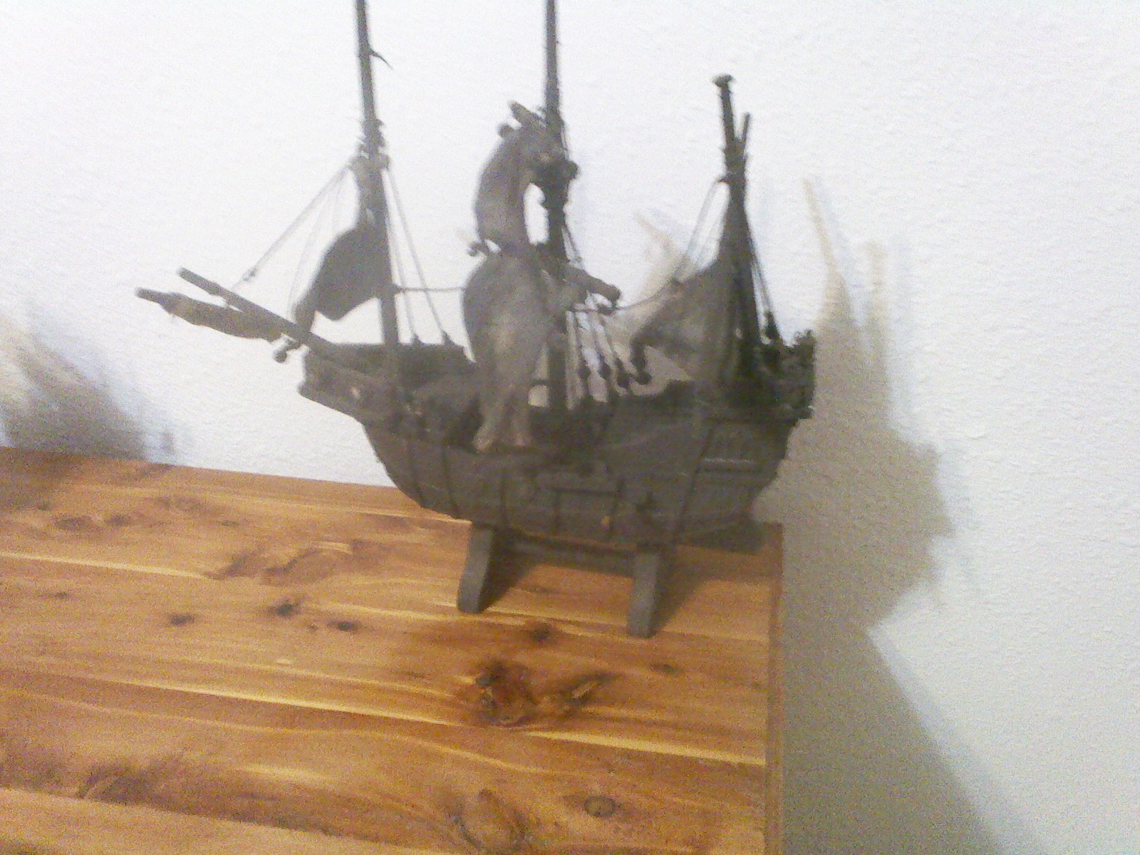 This is a wooden ship model with 3 masts and on one of the decks it is stamped Germany . There are no numbers but there is a coat of arms on 1 of the sails but it is too faint to read. It has 1 gun on each side and is painted mostly black allthough there are some blue flecks of paint around the rails