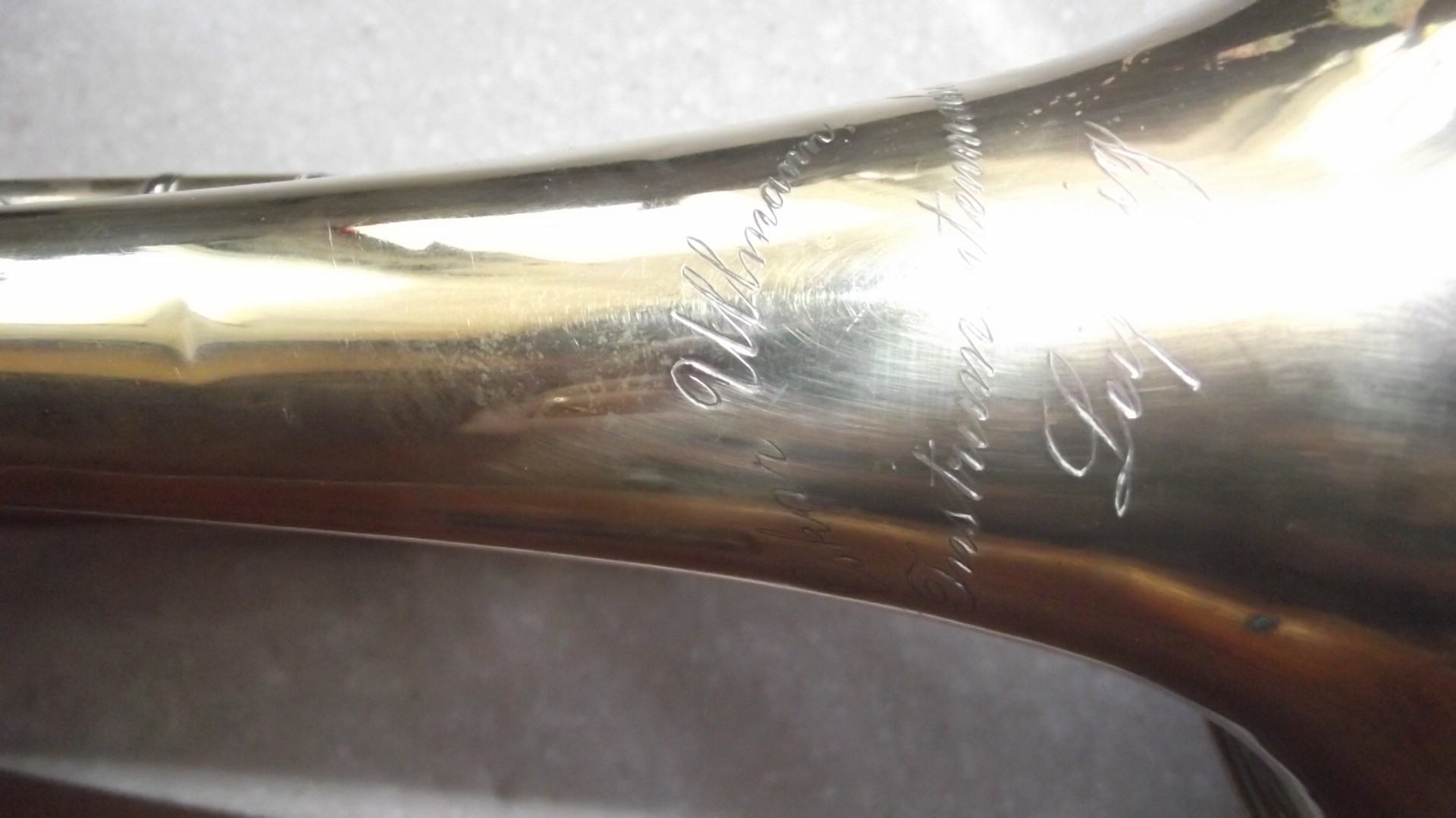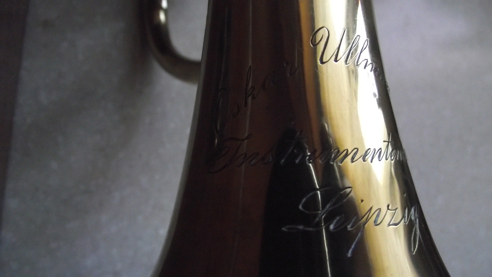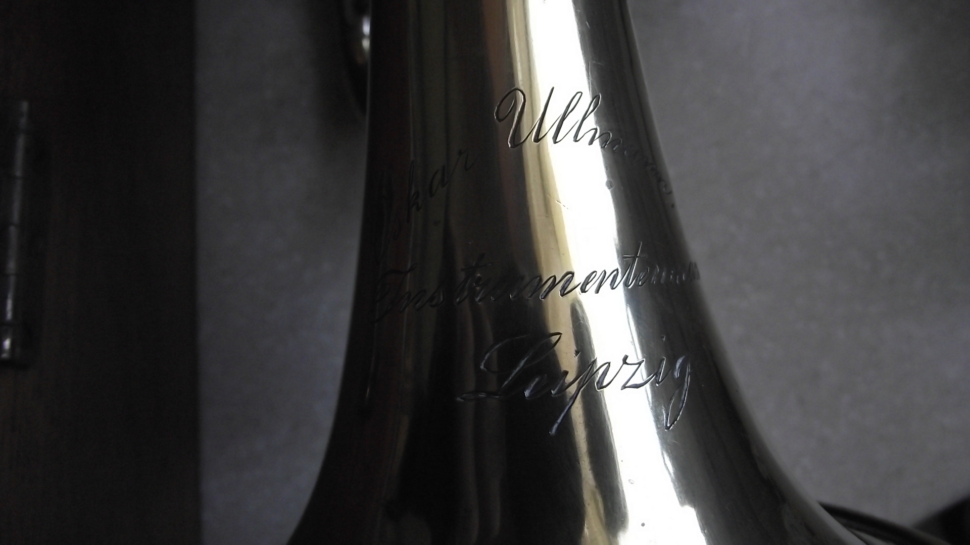 I found a Oskar Ullmann Instrumentmaker Leipzig (all this engraved on the trumpet) rotary valve trumpet. It was in a wooden hand made case. There is a porcelain name tag in the case M. Schmann.