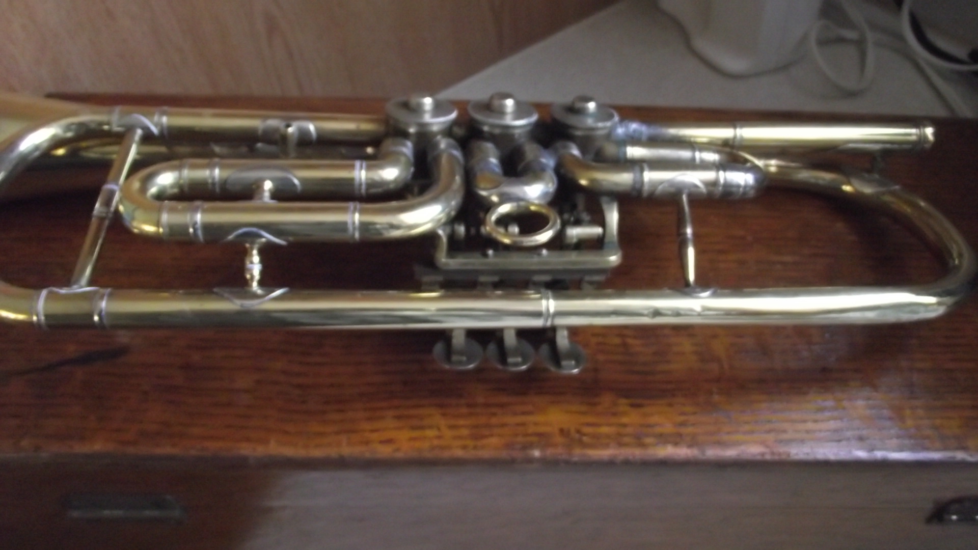 The trumpet has been repaired many times (some not so good). I believe it has the original mouth piece (as it looks hand made). All the valves work and the trumpet plays (I'm not very good). The box is something in itself. Dove tail joints and is angular in shape.