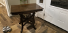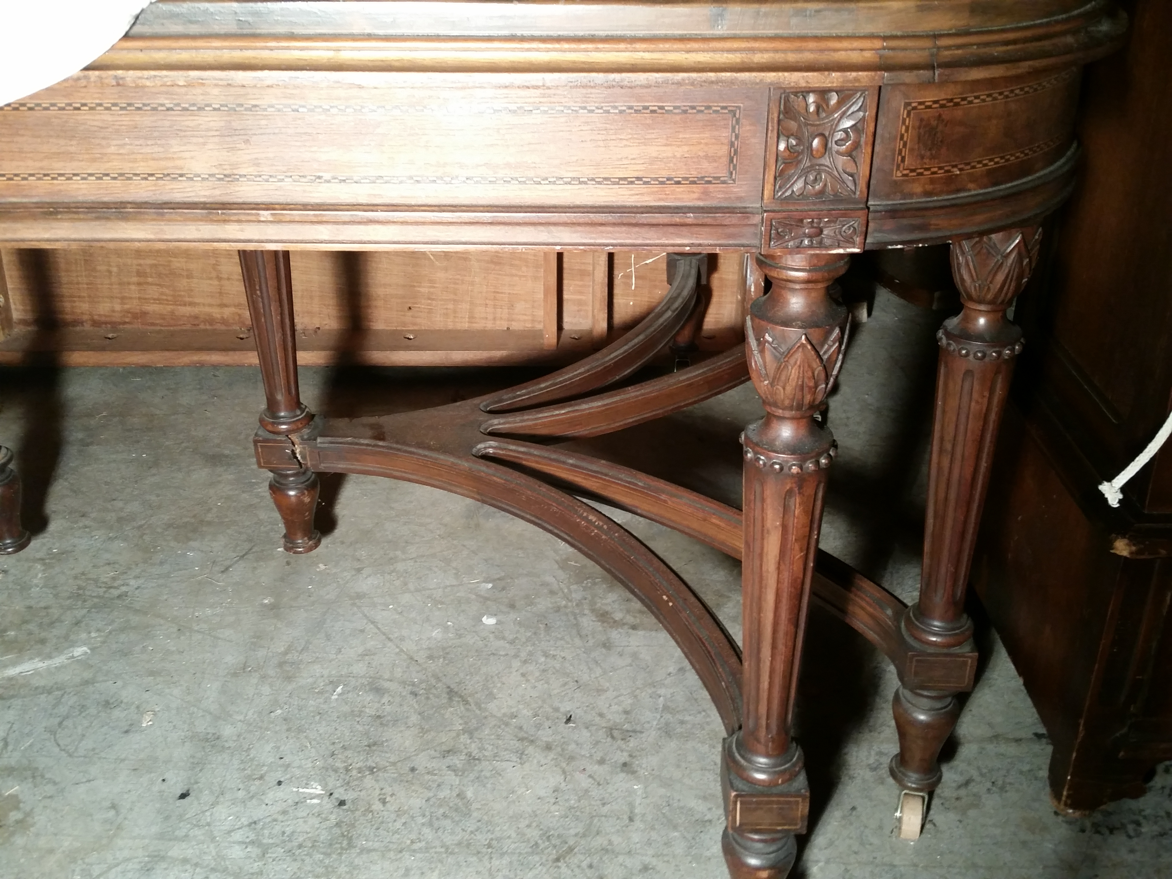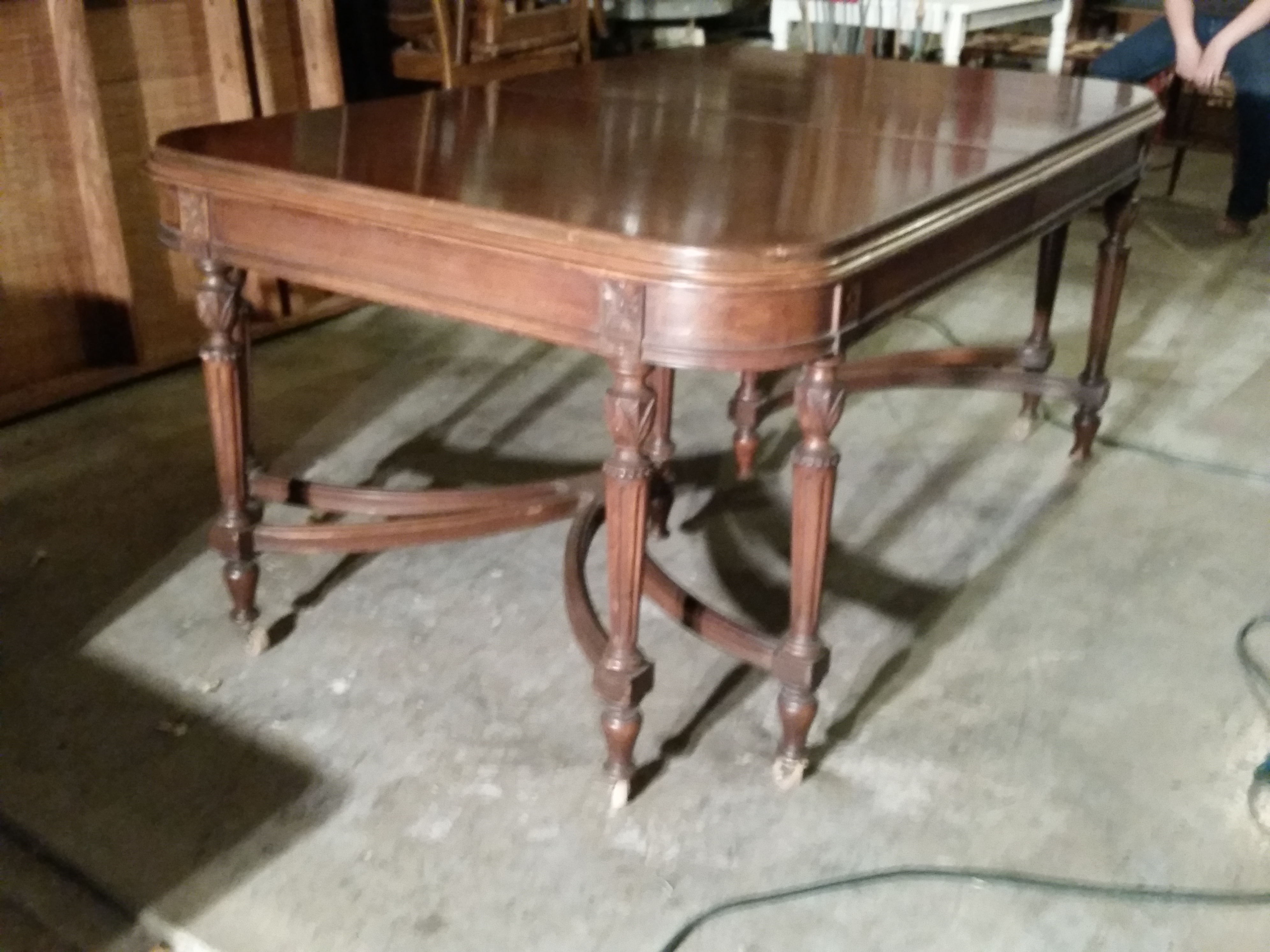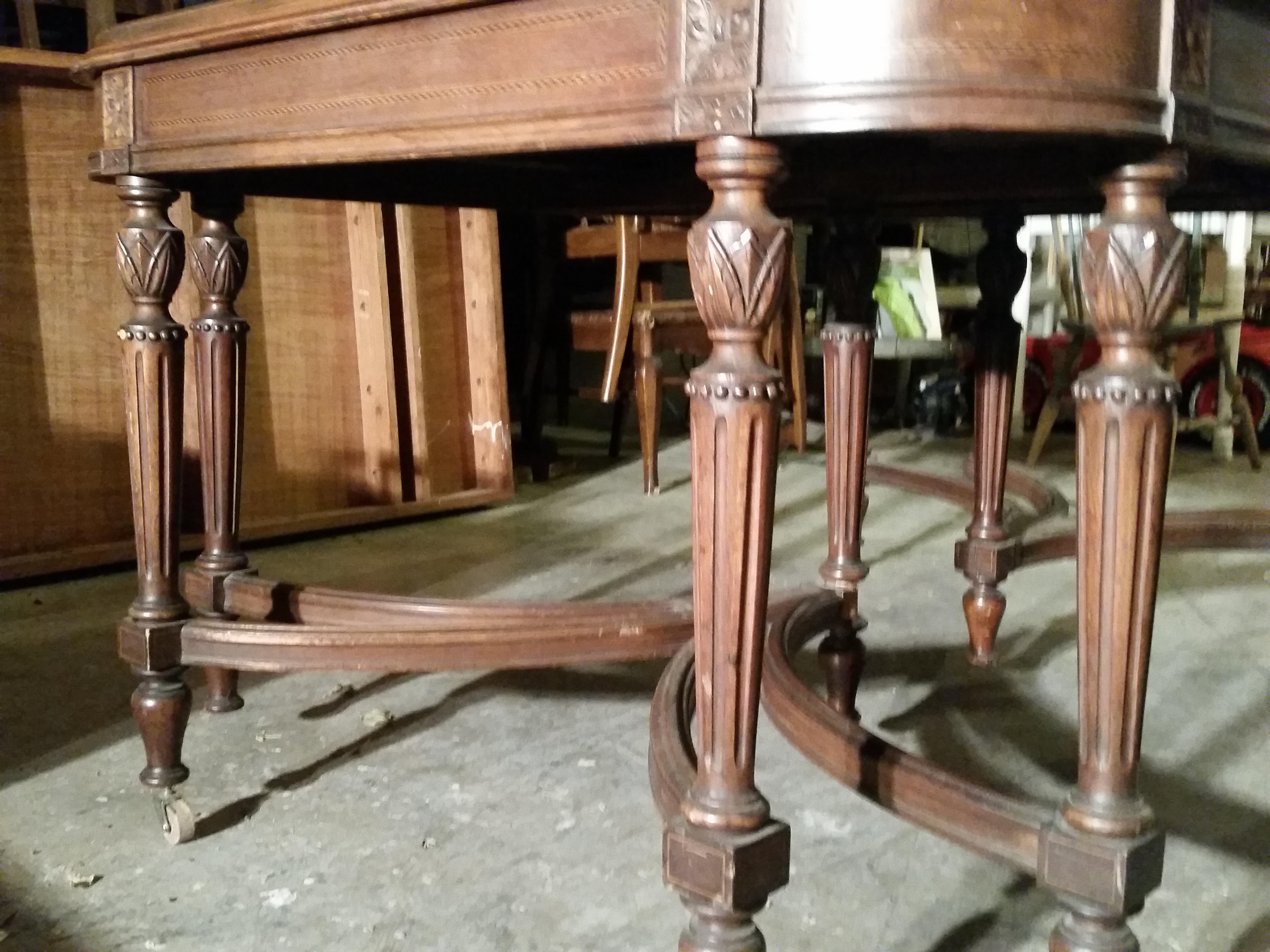 2 legs at each corner with 2 more in middle makes for 10 legs! Have all 10 wheels and they are wooden. Has beautiful carvings and checkerboard inlay around sides and top.