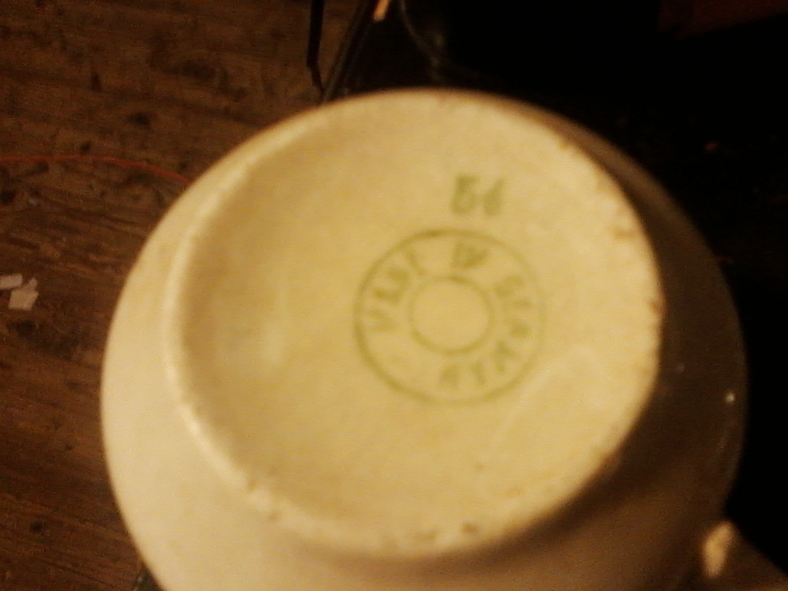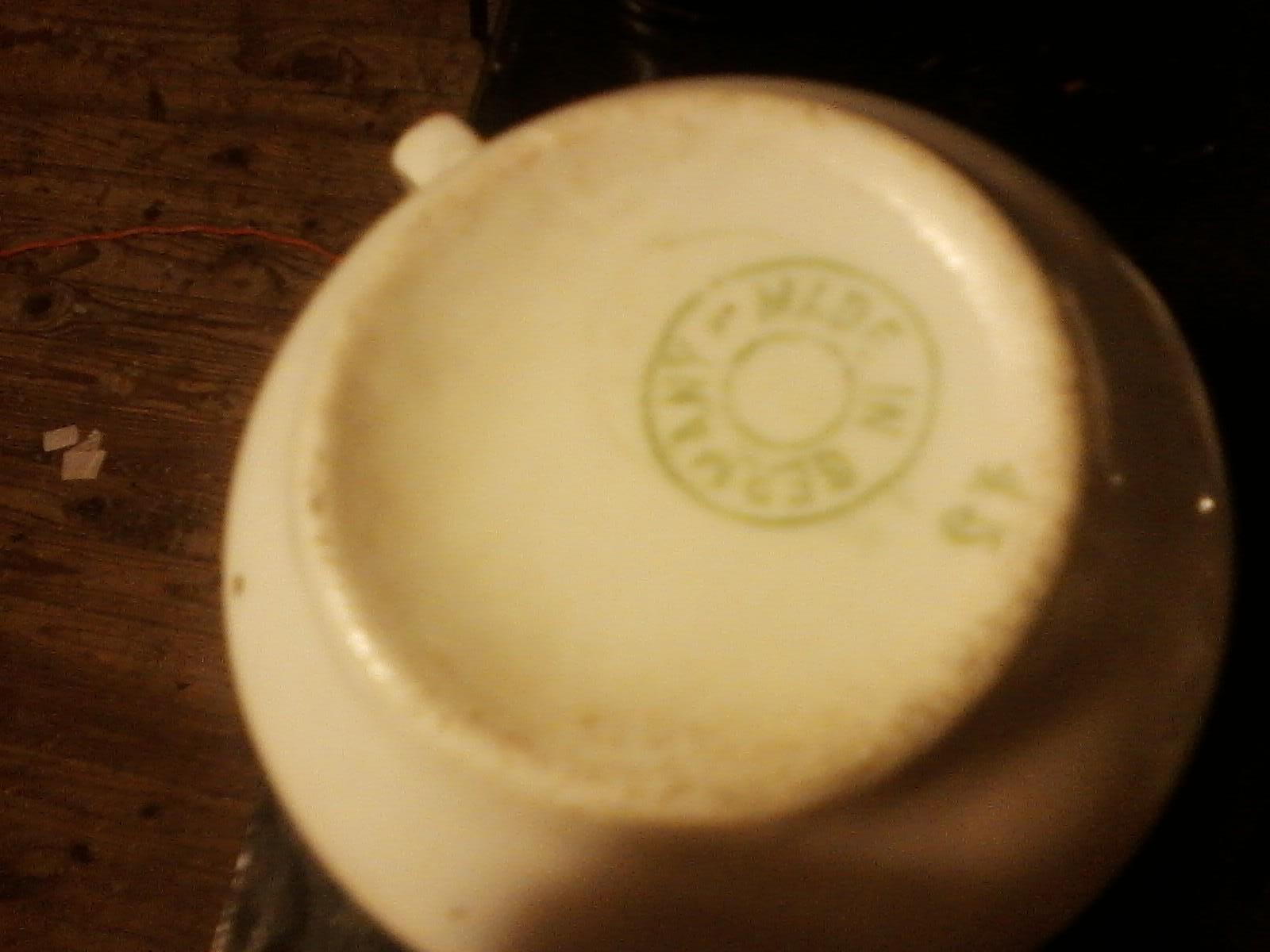 A pair of German made teacups bearing a rose pattern on one side and a green circular seal on the bottom stating made in Germany. One bearing the number 54 the other 4?.