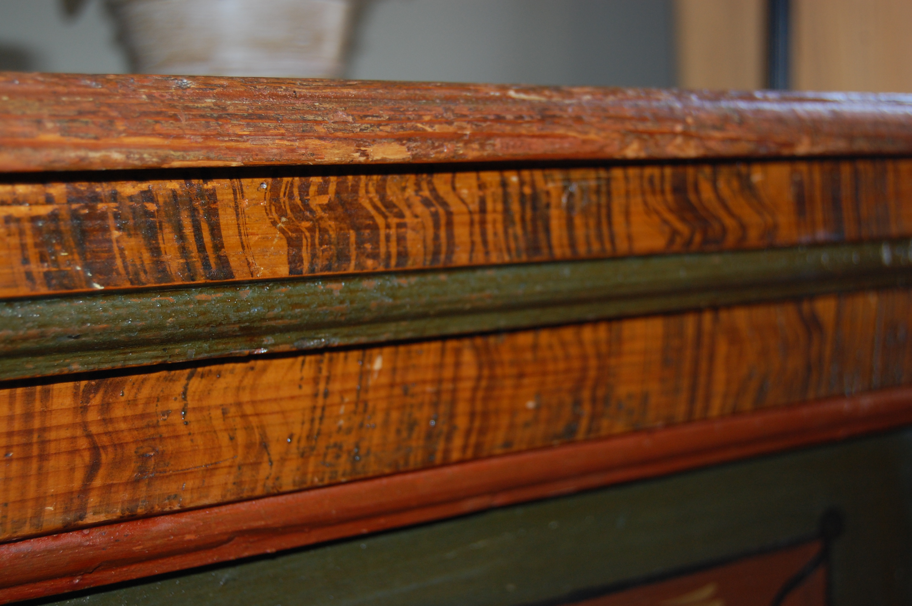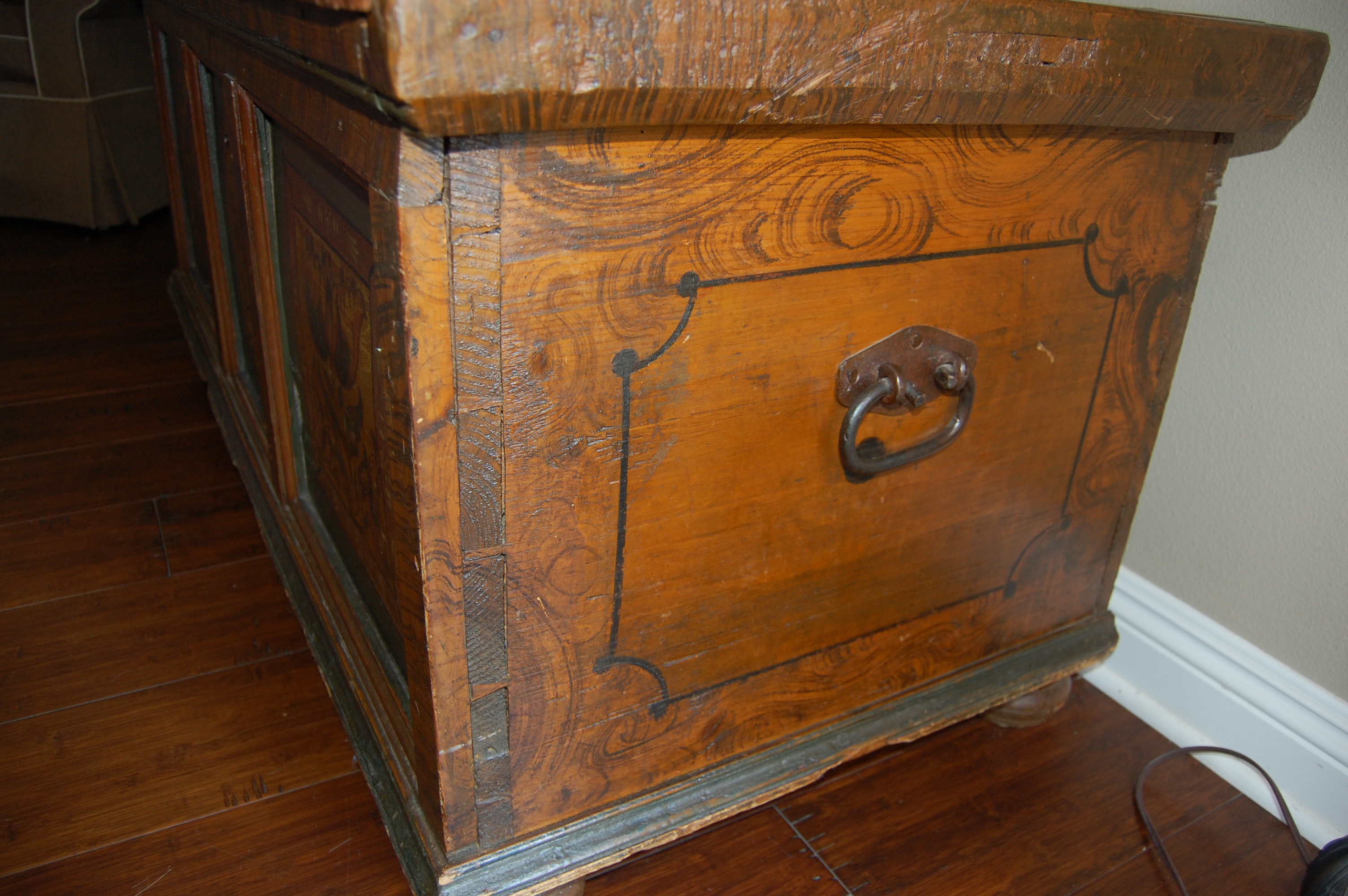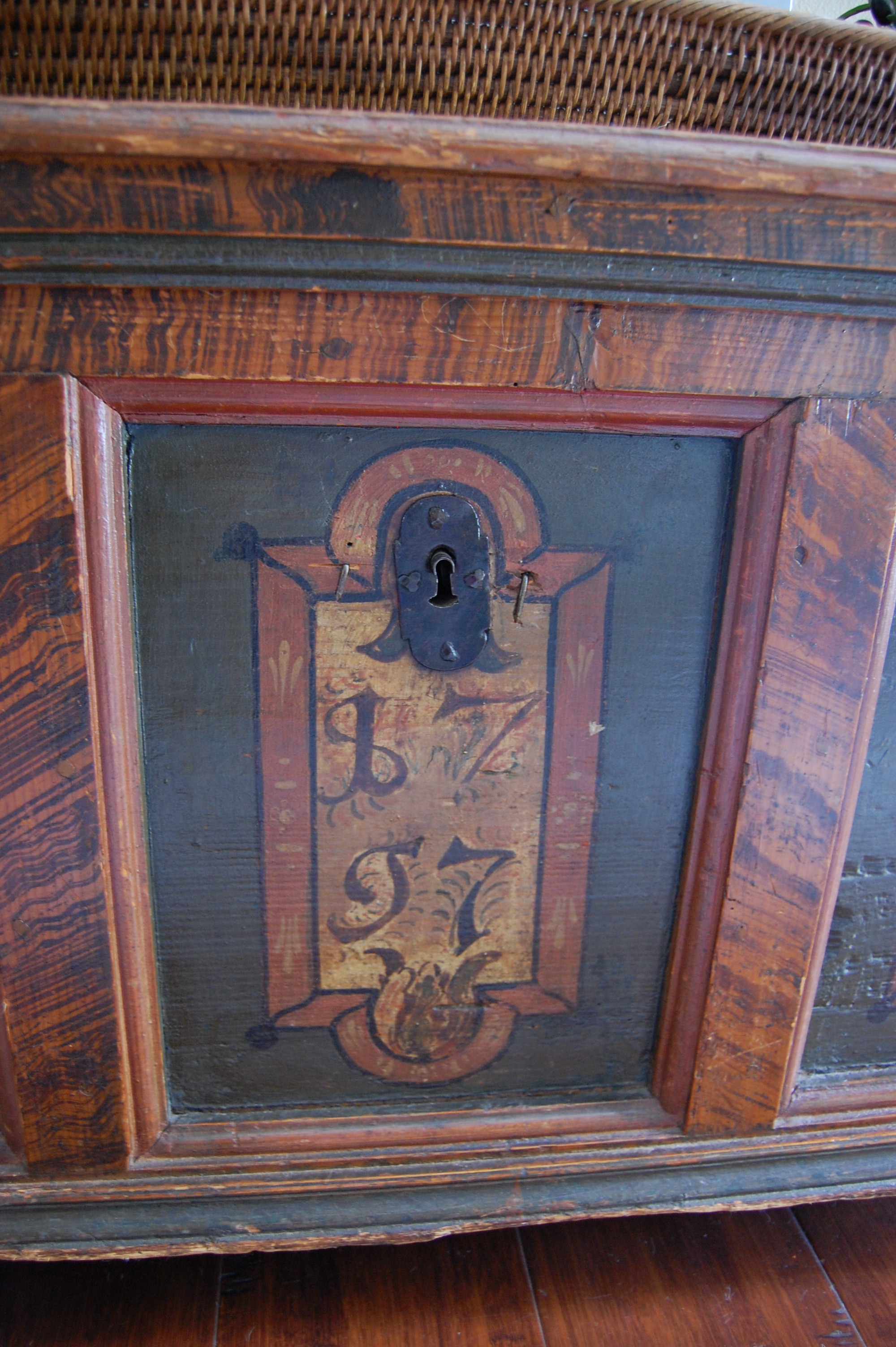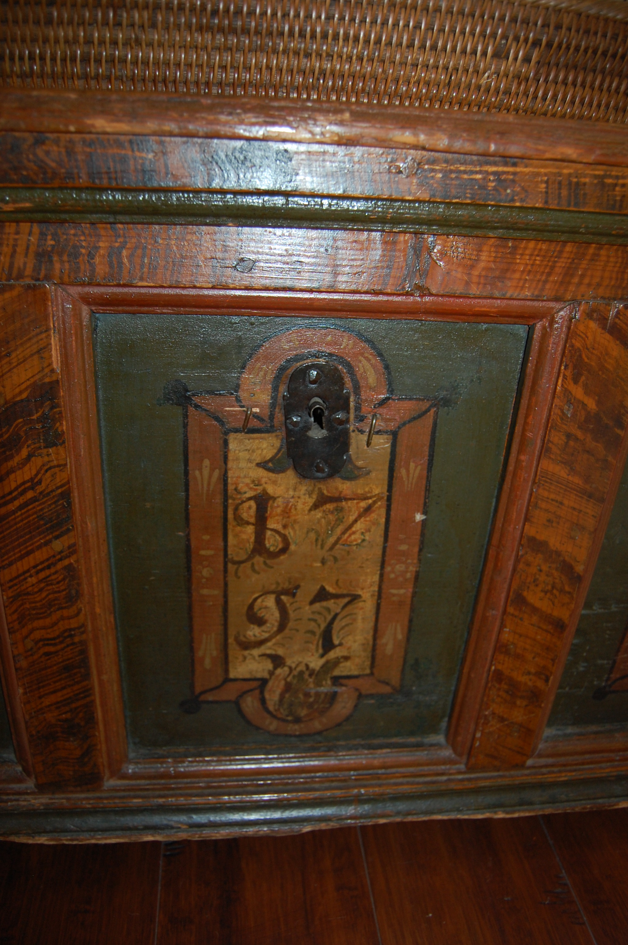There a very old, working skeleton key lock on the front of the chest. The number 1757 or 1797 are painted artisinally below the lock. If you look very closely, the pigment used to paint the decorations on the chest seems to be a bit grainy or chunky depending on what color you are looking at. The stripes along the trim alternate between straight lines and wavy lines, appearing to have been made with a fork(?).