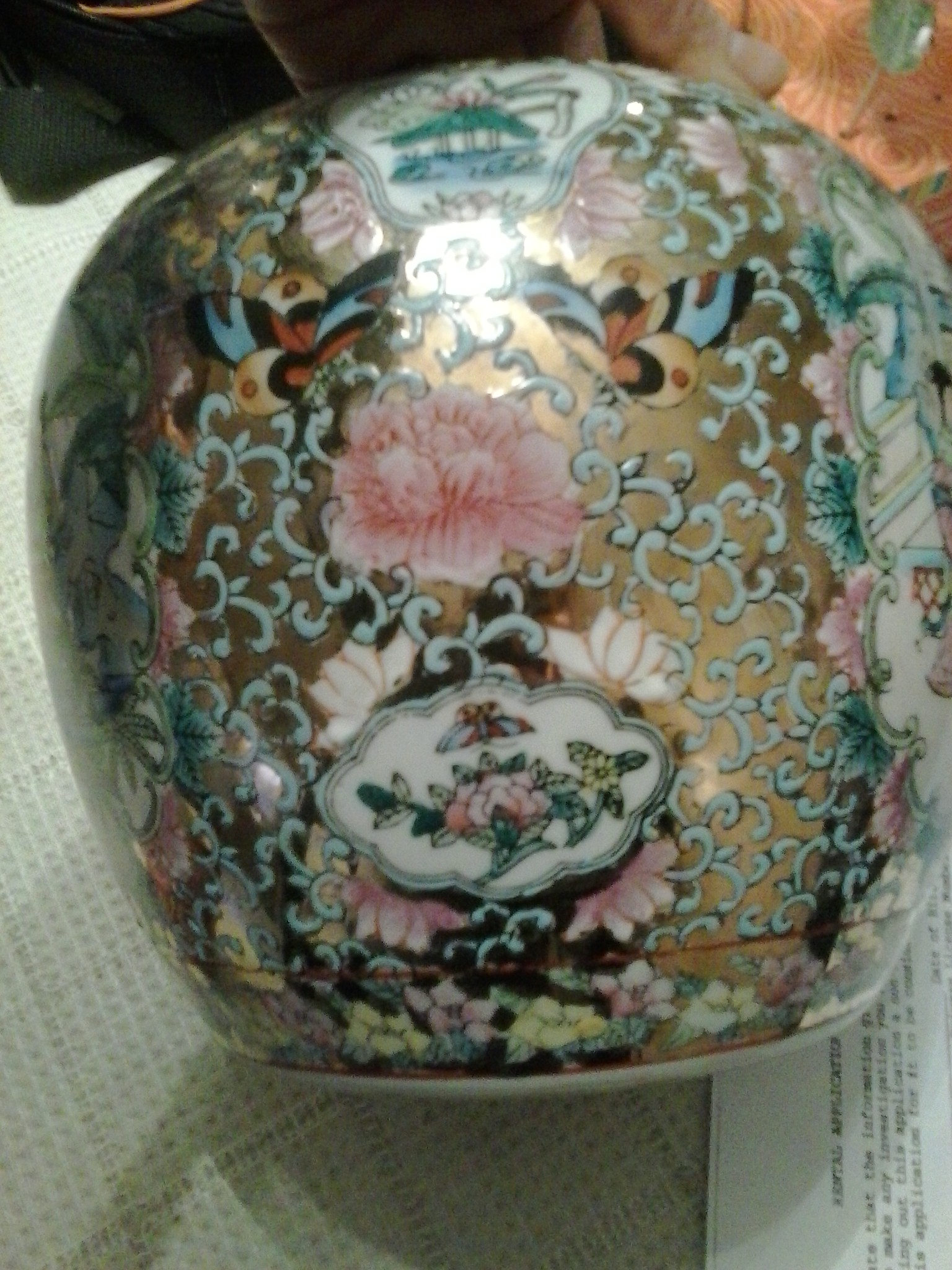 front and back depicts men and women at table and surrounding home, sides are scrolling design with flowers and butterflies as well as two smaller pictures on both sides. gold blue, green black and a rusty red are amoung the colors. foriegn stamp on the bottom. no english lettering anywhere.