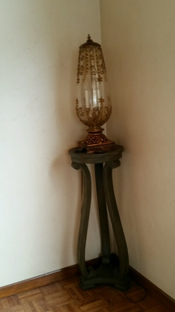 I do not know much about this lamp. It is about 24 inches tall. It is glass with gold scroll work on it. It appears to have a brass base and top. Inside are 3 candlesticks with light bulbs on them for the "wicks." Any information on it or it's value is appreciated.