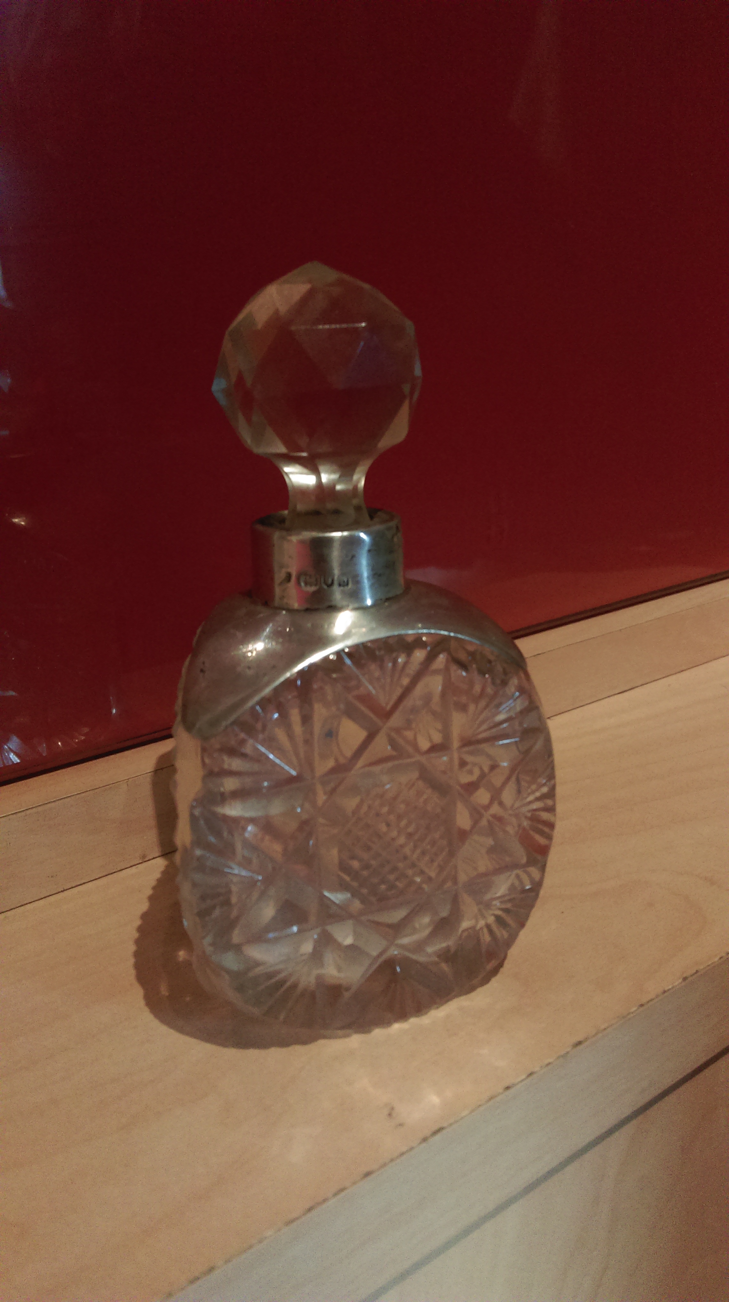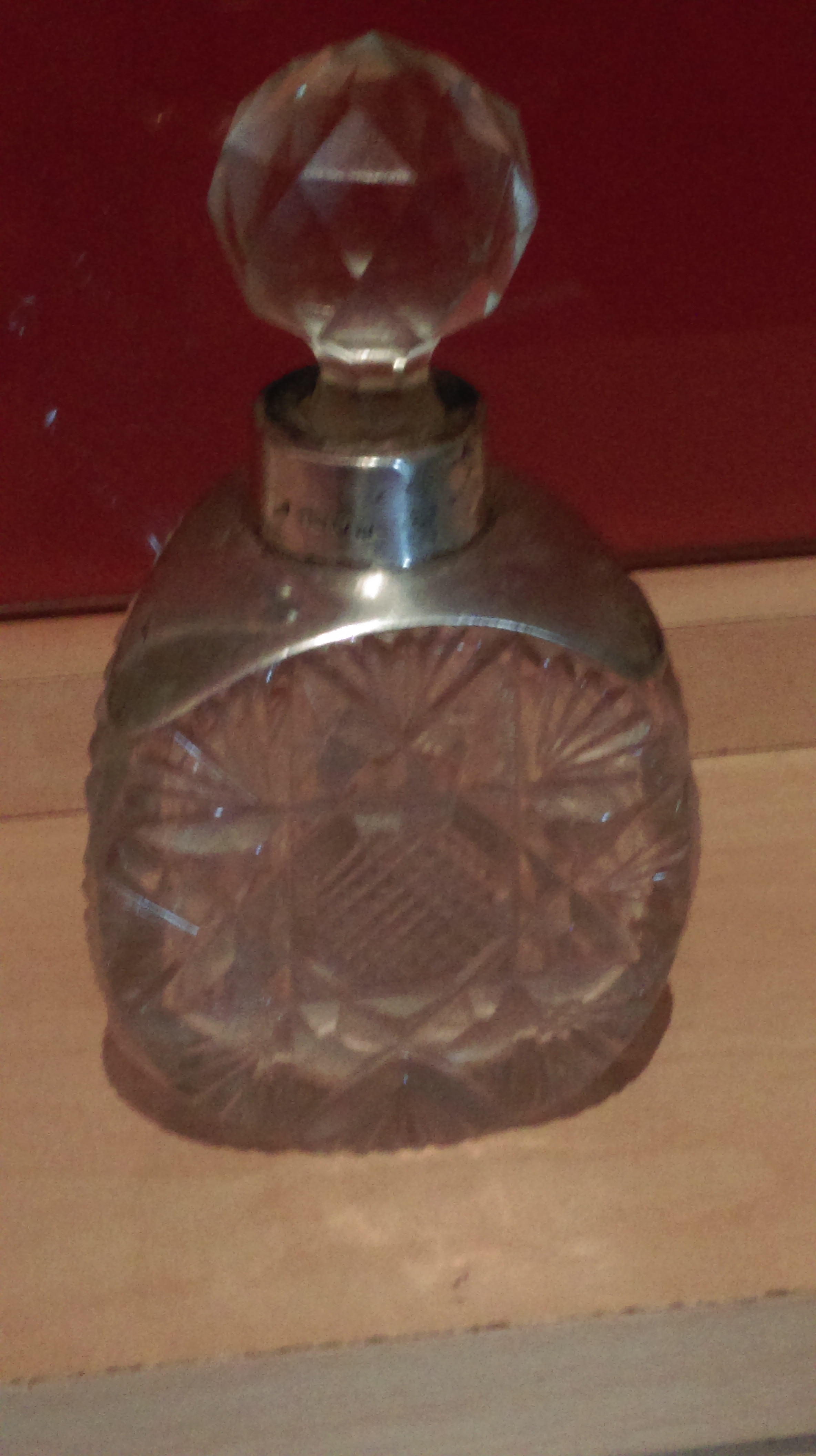 Clear glass with a silver collar and glass stopper.