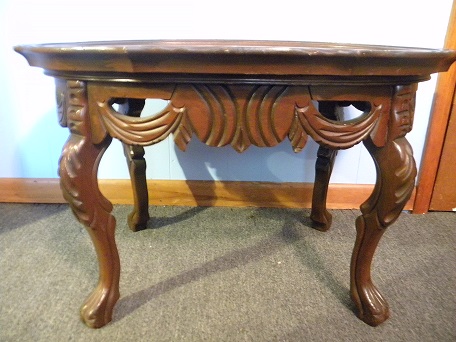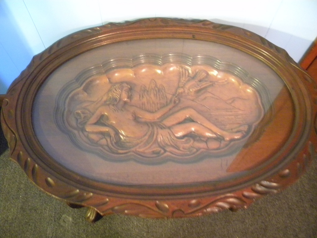This is a oval glass top tea table with inlad carving of person laying down arm outreached and bird on finger, wood trim around glass carved along with the table sides, legs and claw feet