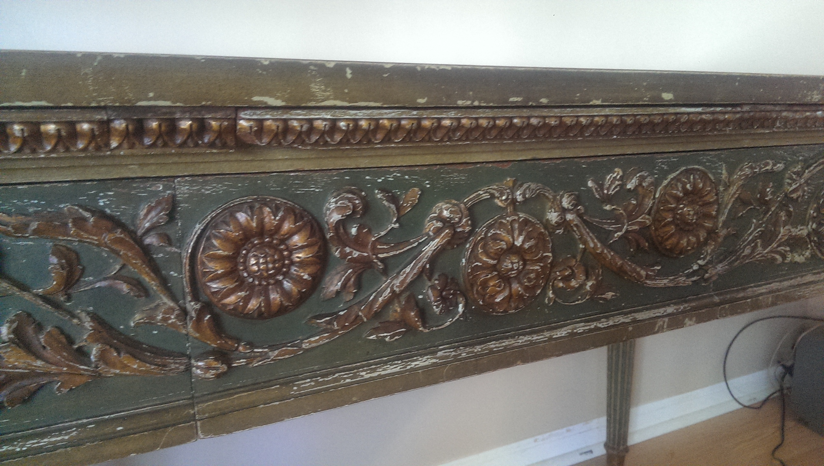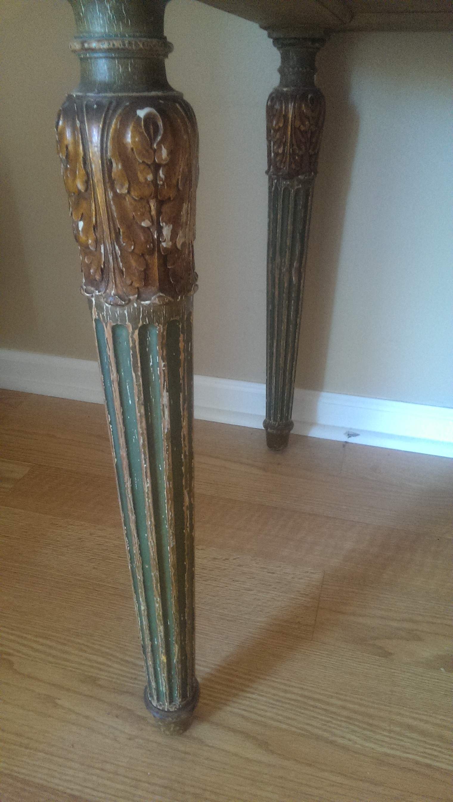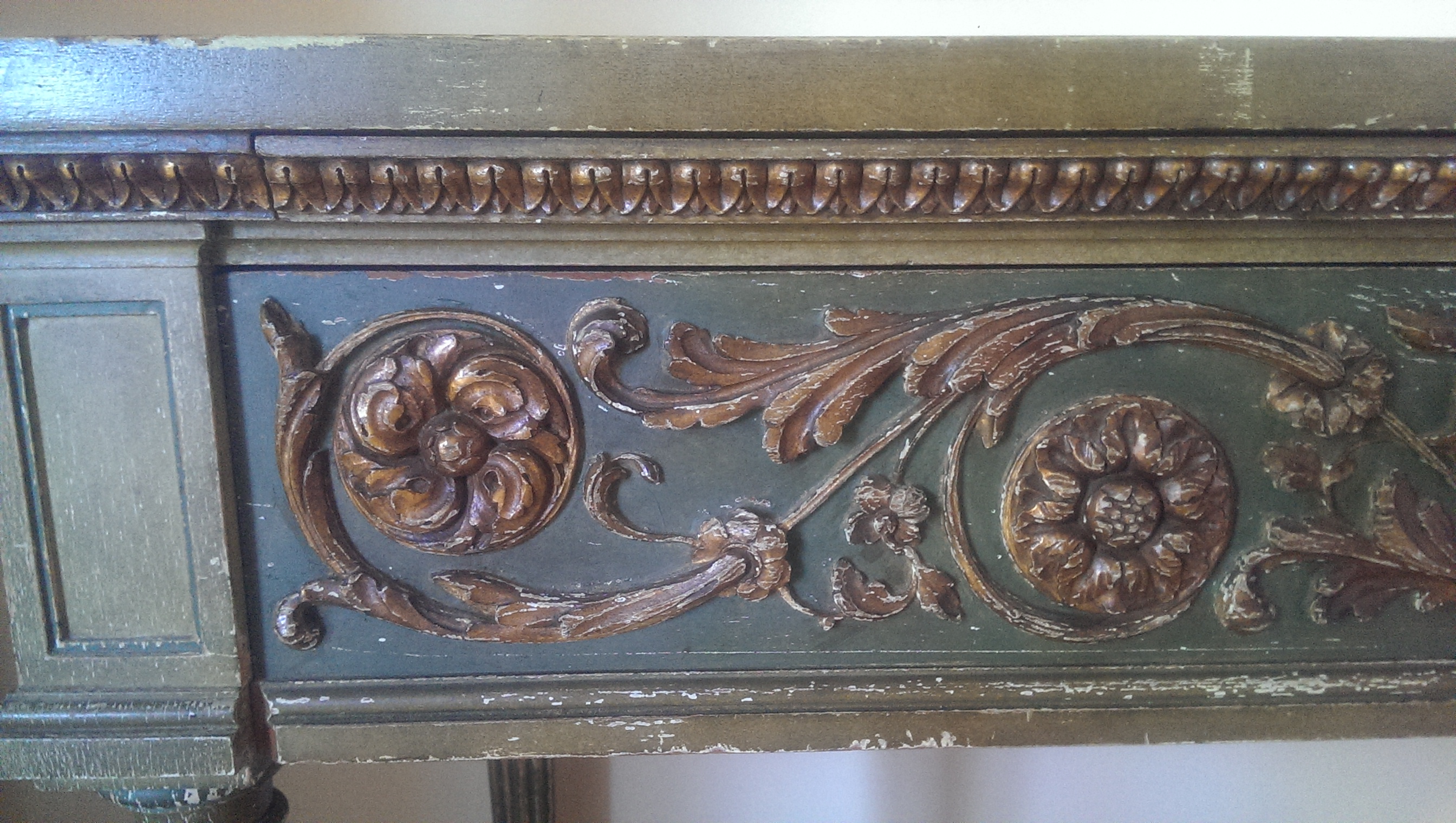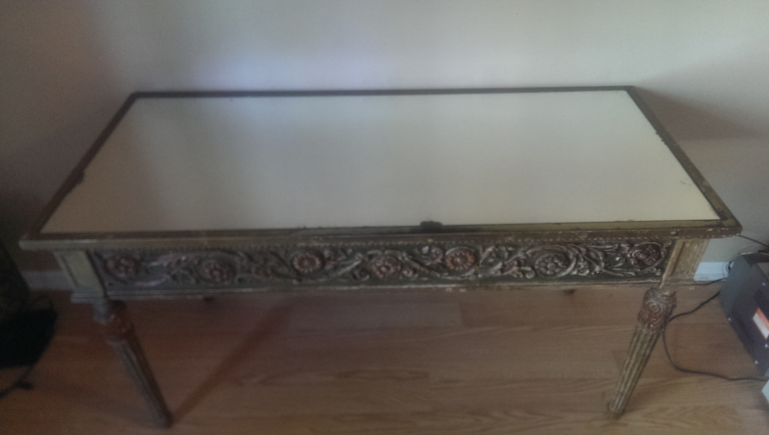 I would like to know more about this desk I inherited as I am not sure of its origin or approximate value and was hoping for some assistance.  No one in my family seems to know much about it exept that it is very very old.  It is in fantastic condition and is all original with a great natural greenish patina to it.  The top has a mirrored glass finish that is original as well.  All hand crafted with very little wear for it's age.  There are 3 drawers and 3 wood extensions that slide out.  Pictures really do not do it justice.  There are no markings on it anywhere that would provide a hint of where it comes from. Any help would be greatly appreciated.
