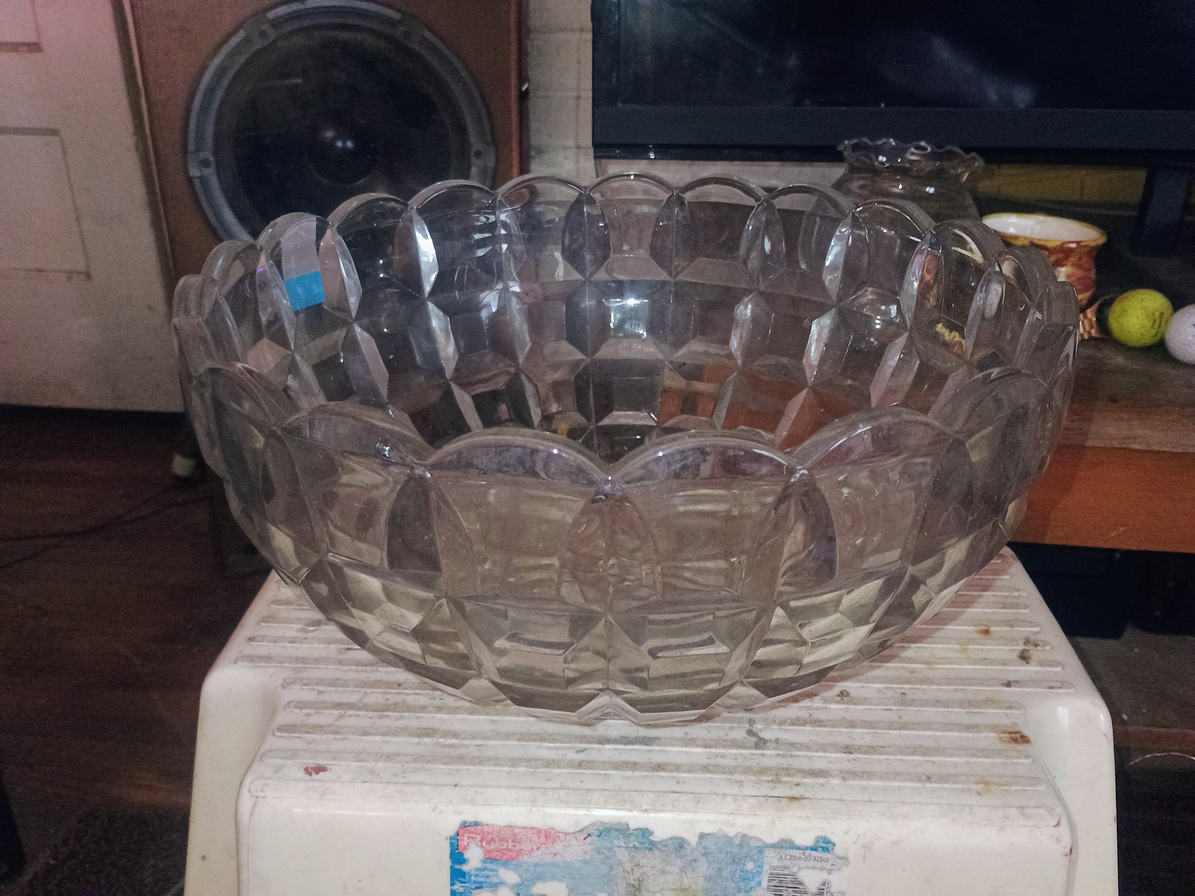 The punch bowl's geometric design and heavy crystal material suggest it was likely produced in the mid-20th century, a time when such styles were popular. The construction method, including the thickness of the glass and the clarity, aligns with this period.