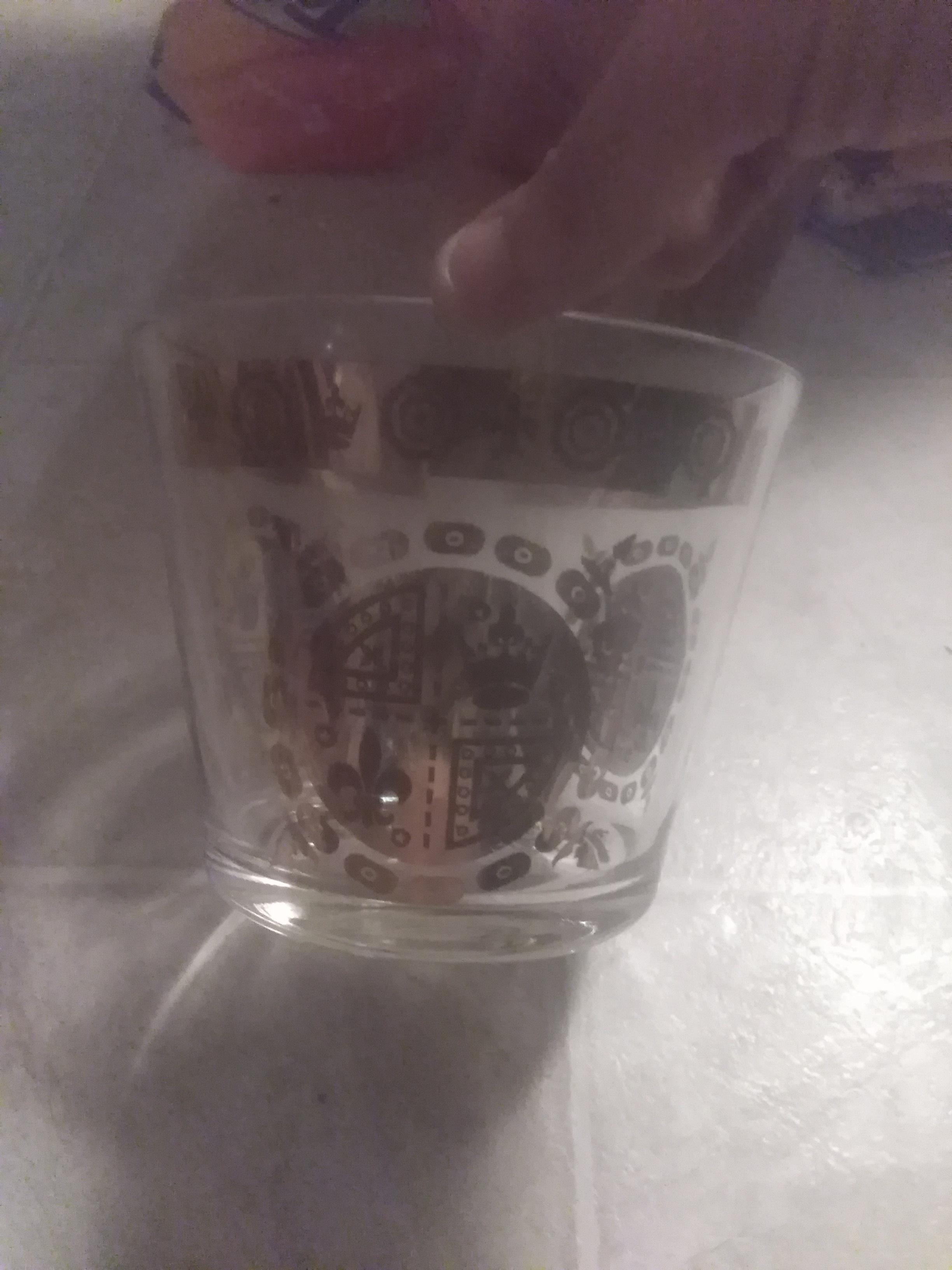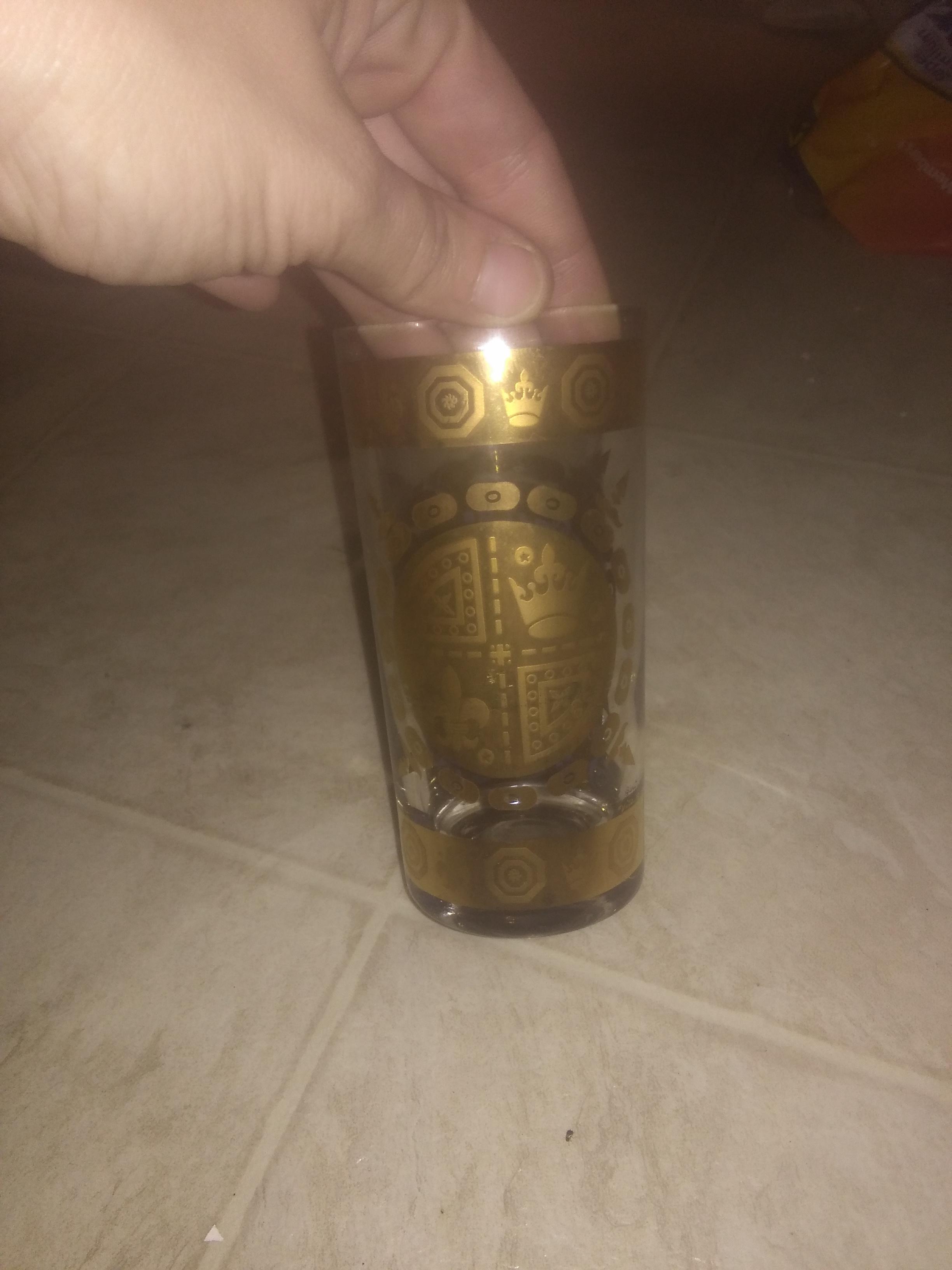 It is a set of eight glasses and a bowl in a caddy painted with gold designs