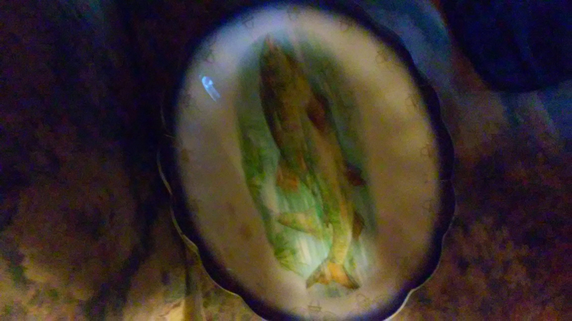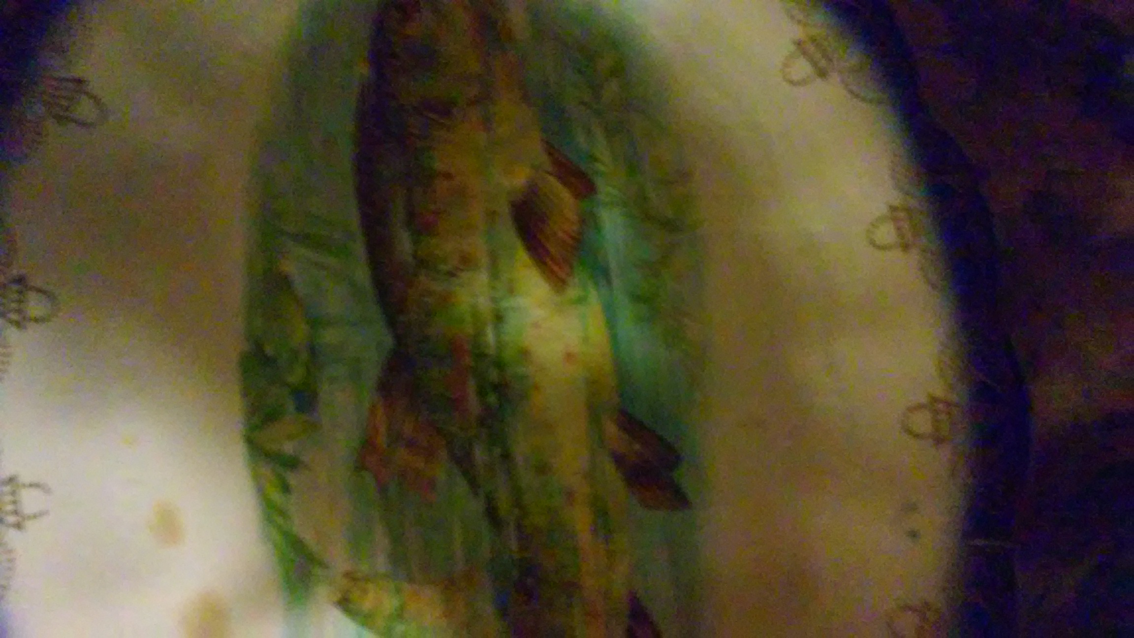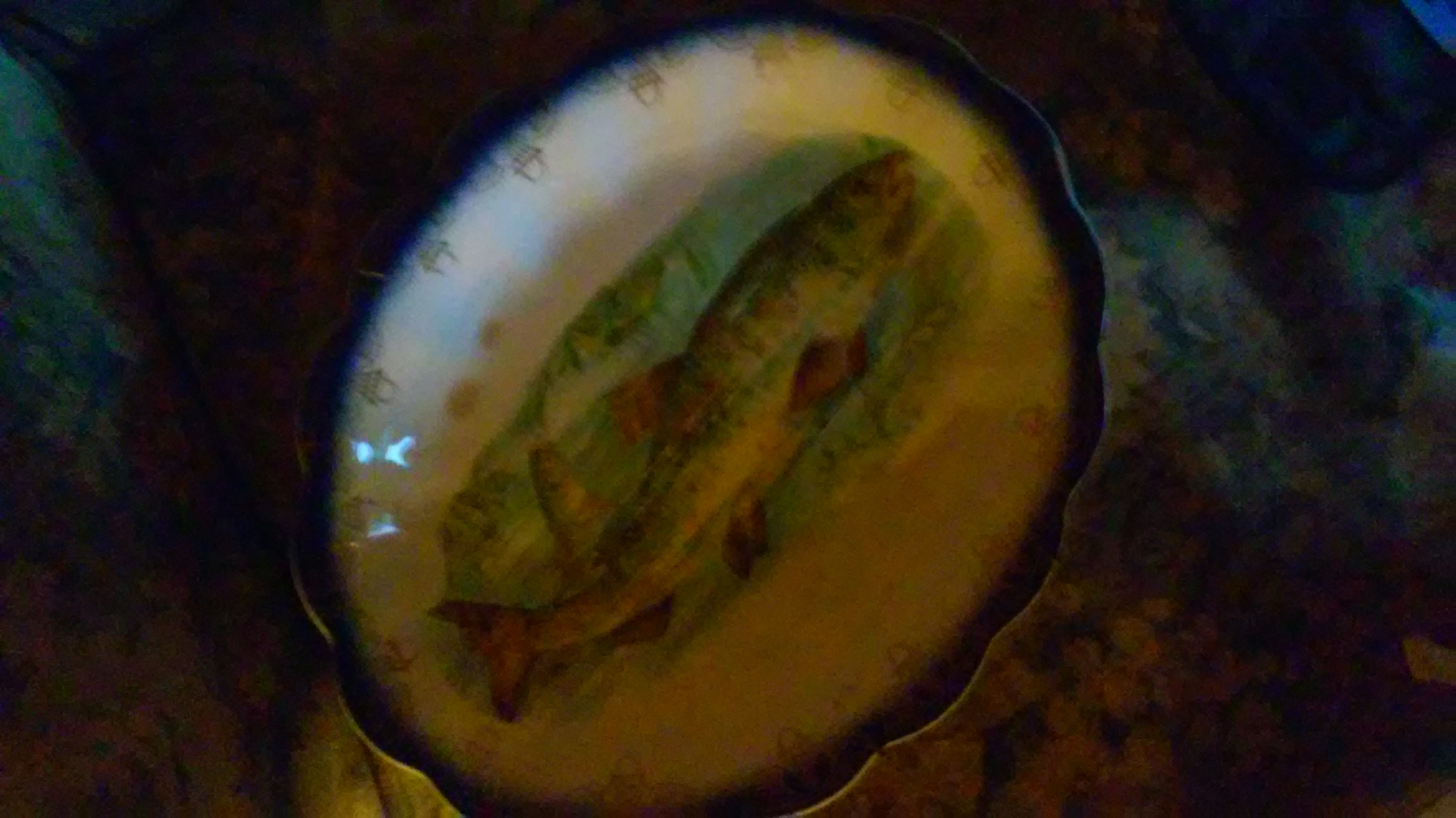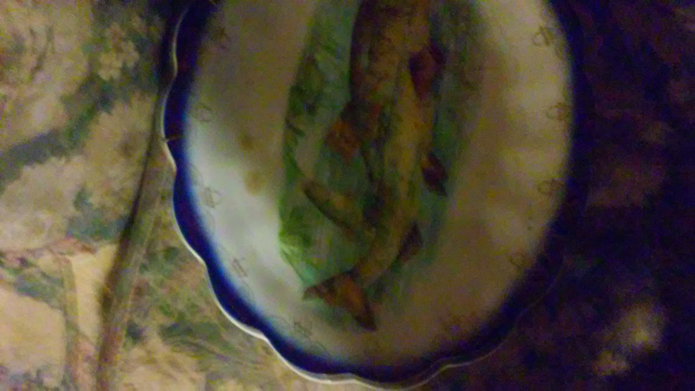 Ival plate with designs around the oter edge anf a fish in the entire center swimming in water the glass appears to be porceleon their are no identifying numbers or name noticable onplate