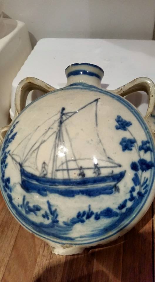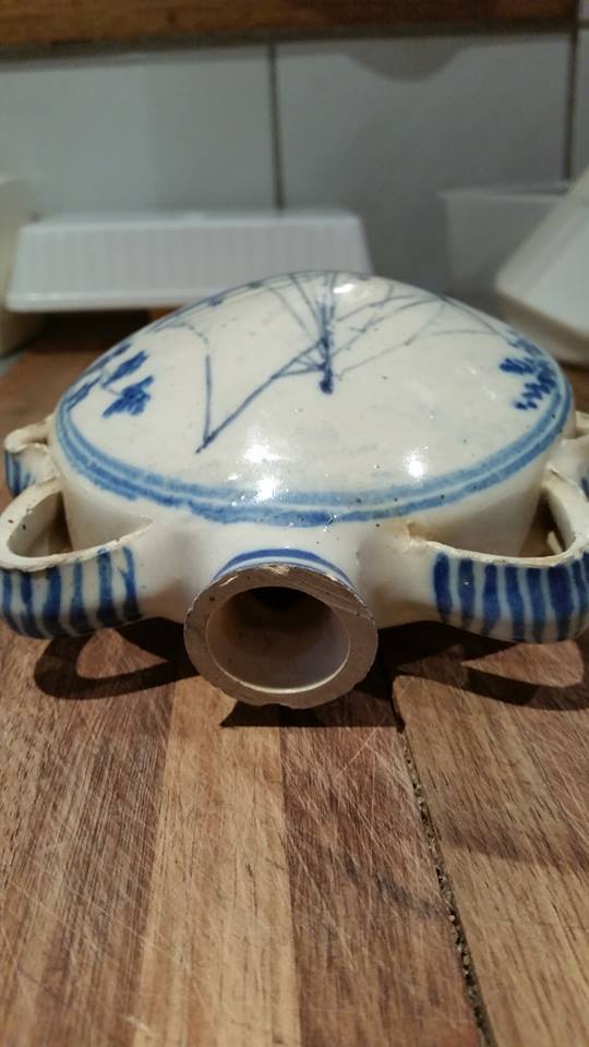 The pottery is quite thick and coarse, the glaze is imperfect perhaps during firing, the base has some broken from the opening, perhaps it was more like a spout to drink from, and perhaps it is not for water, but something more fortifying???