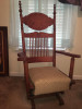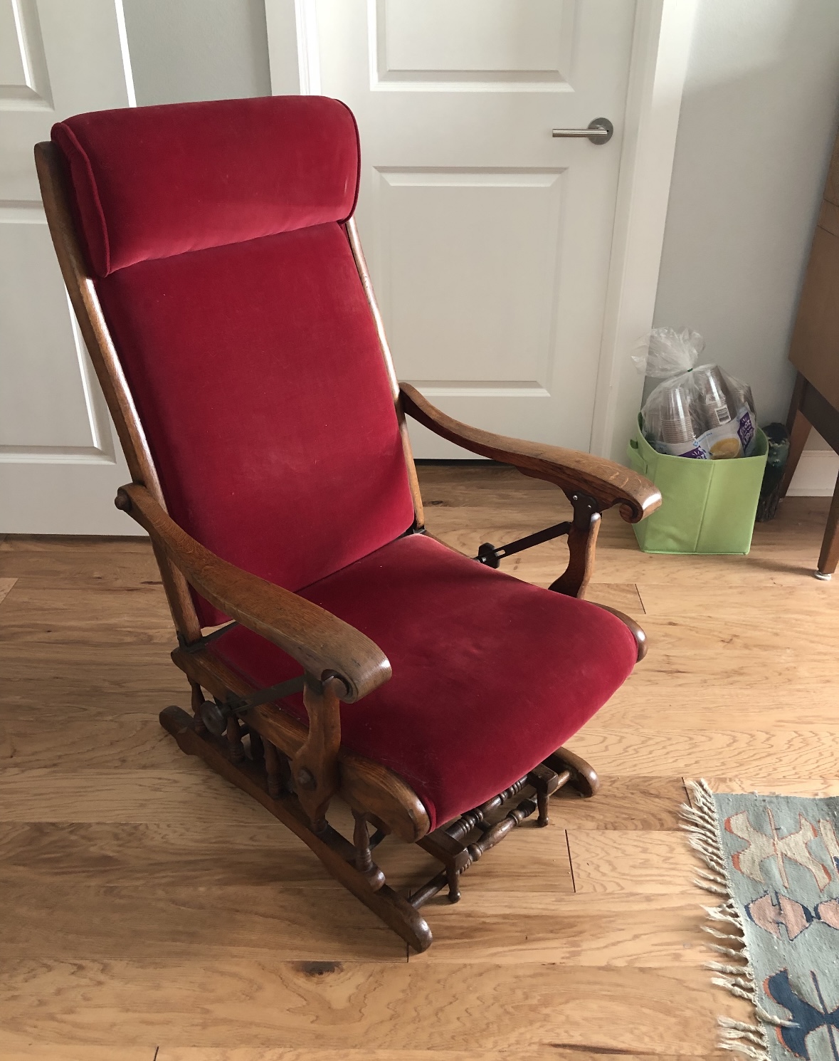Antique wood glider chair with fabric cushions and pull out foot rest. Nothing else known about it. No signatures or labels present.