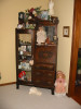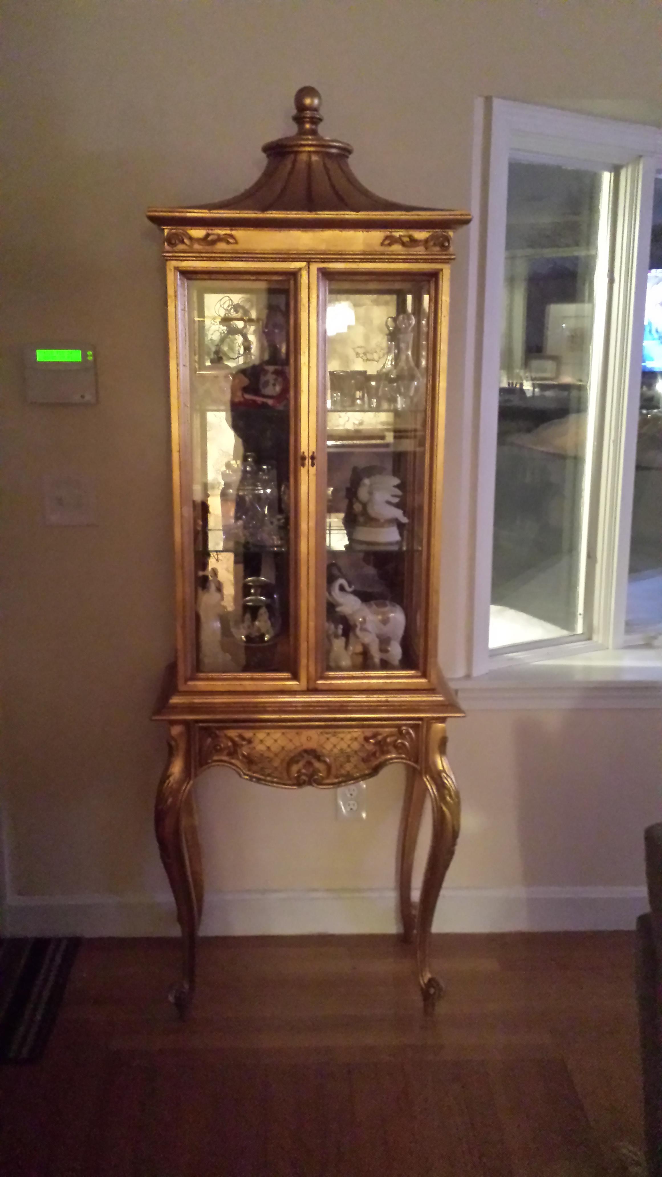 Three glass shelf curio cabinet with smoked mirrow rear. Has a carnival tent-like top. Gold color with specks of green. Does anyone recognize this?