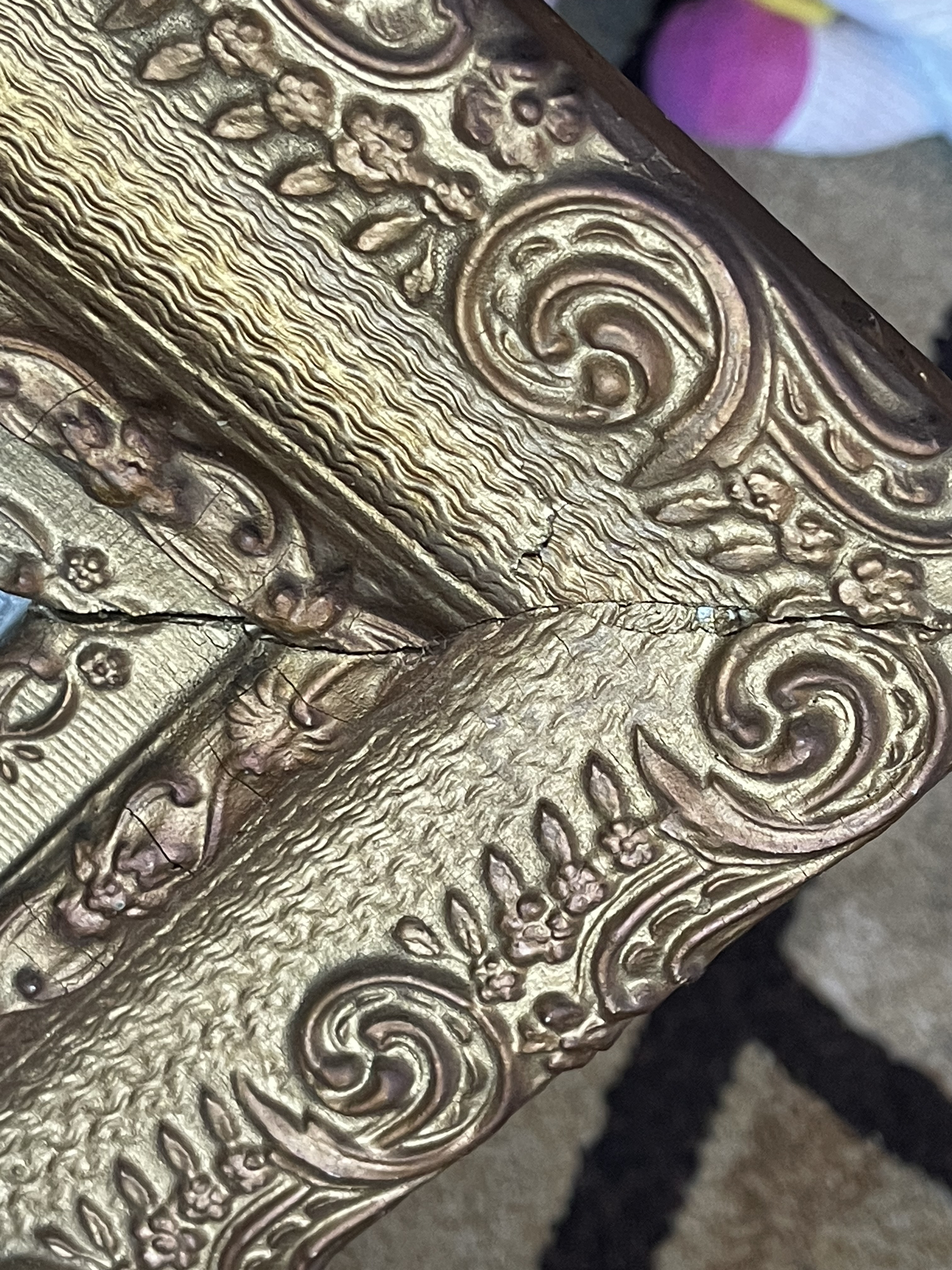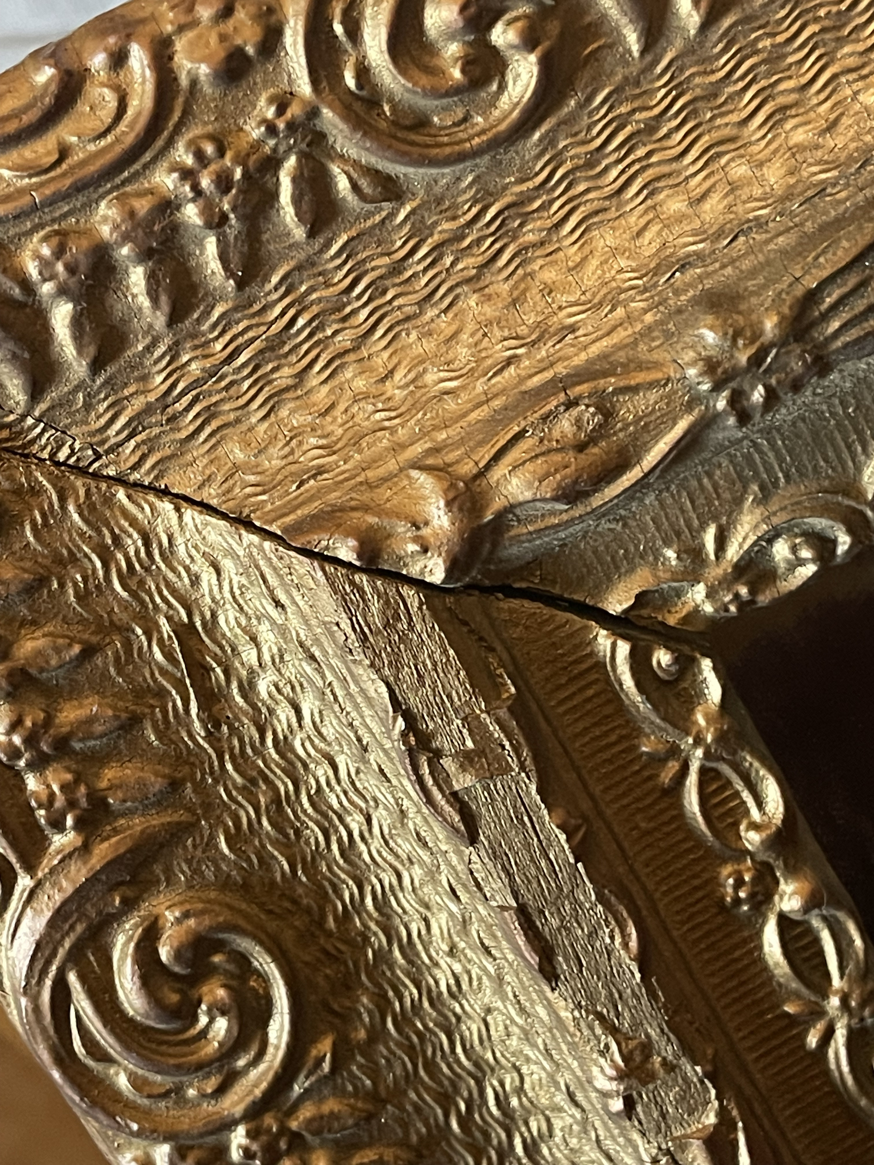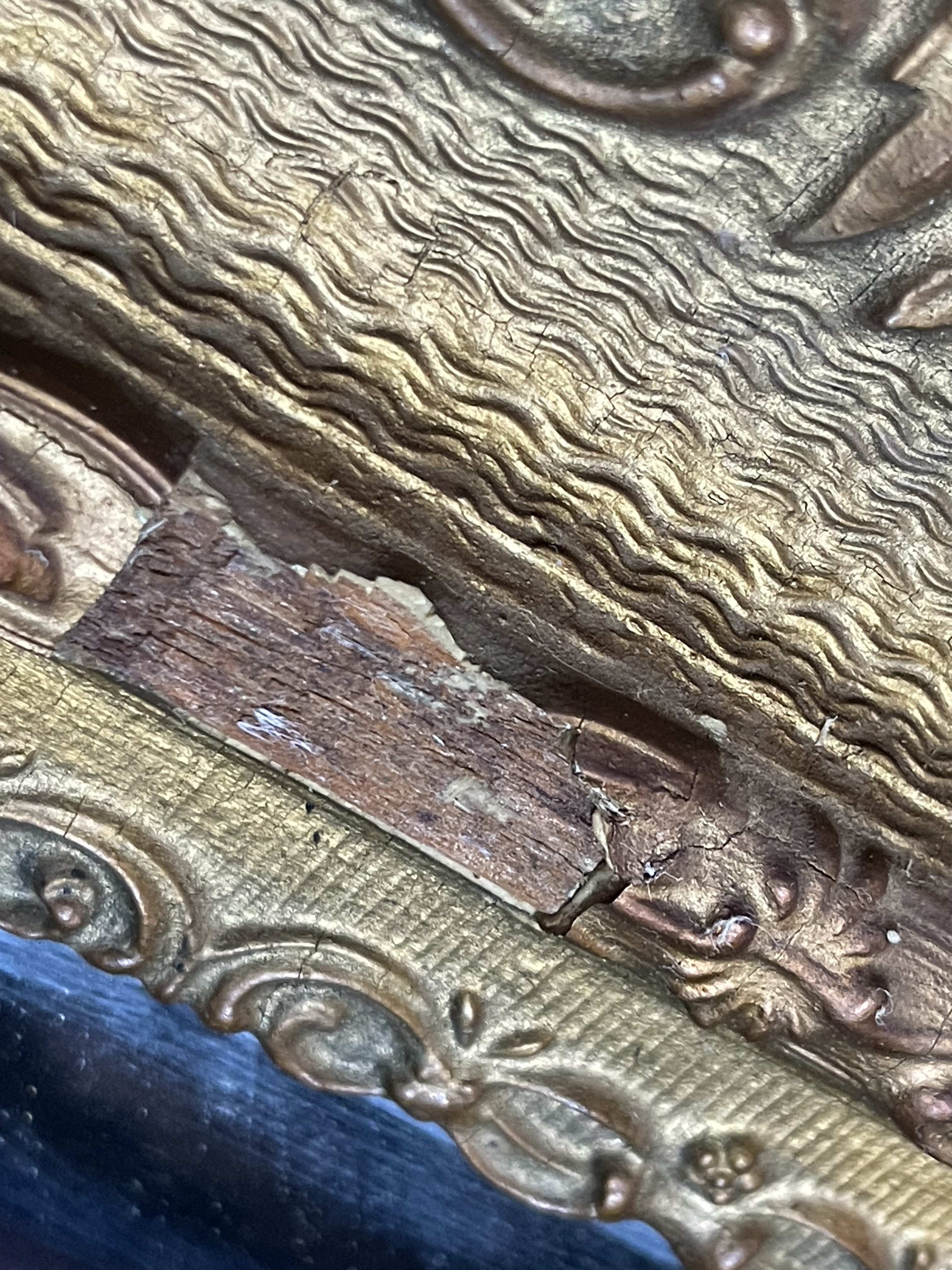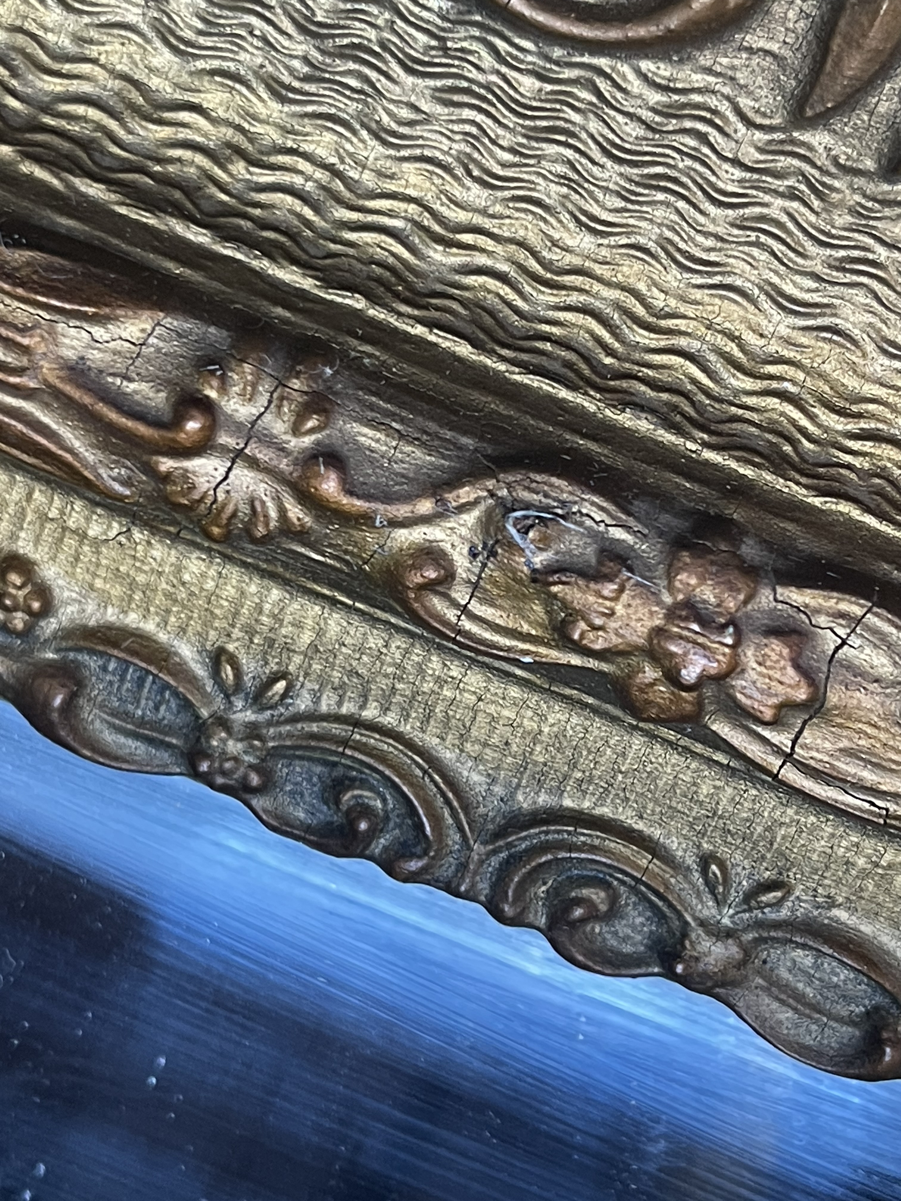Grade: Good. The frame shows signs of wear, including cracks in the gilding and some loss of material in the carvings. These imperfections are typical for items of this age and do not detract significantly from its overall appeal.