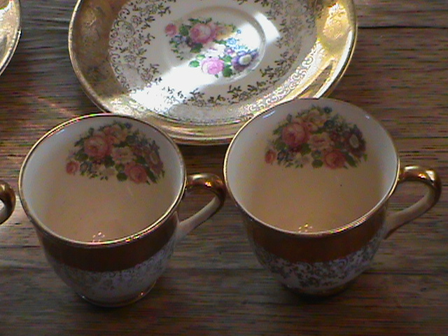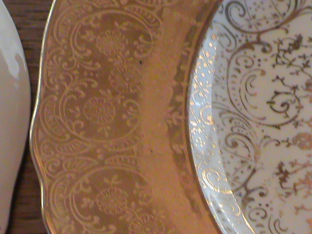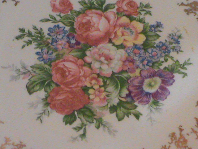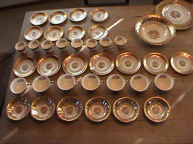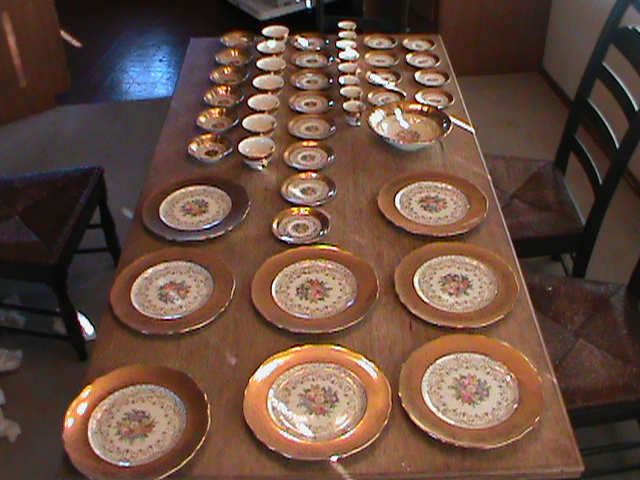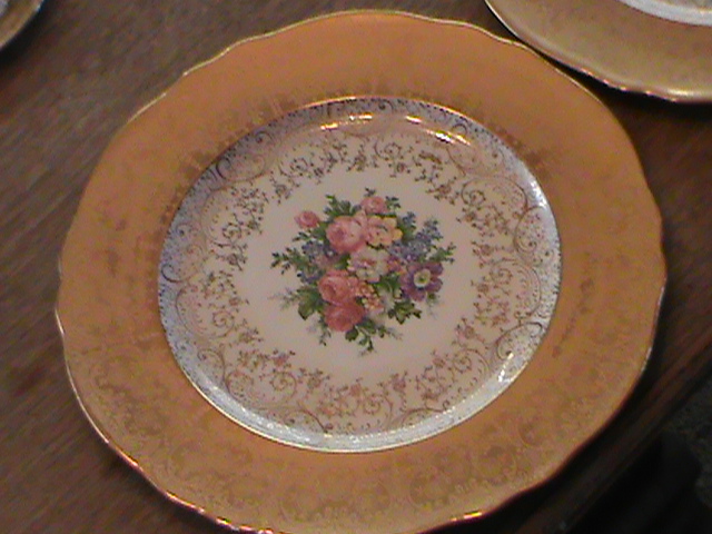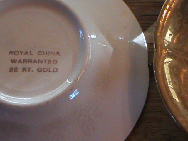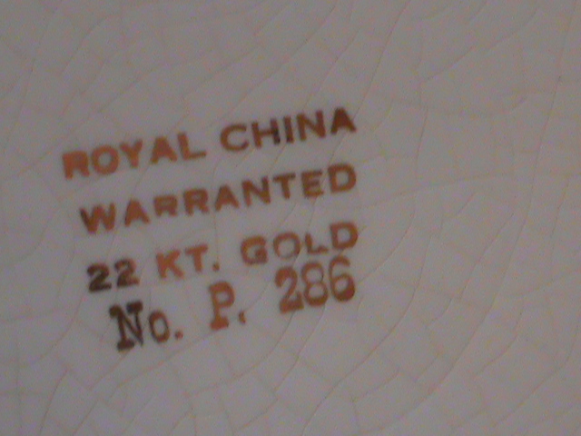 I have antique dishes that may have formerly belonged to the Royal Family of Norway. They are at least 100 years old if not older. My Great Grandfather was their cook for many years. He decided to move to the united states. The dishes were given to him as a gift. He and my grandfather have long since passed away. The dishes were given to my mother who also passed away. She many times tried to have the dishes appraised with little success. Now it is my turn to try! There is no existing paperwork to prove anything that I have said to be true. The plates are are gold plated. The larger pieces have designs etched in the gold plate. The gold design drifts out toward a painting of flowers in the center. The collection consists of: 8 dinner plates, 1 large serving boul, 6 small bouls, 7 coffee cups, 8 large saucers, 8 small tea cups, 8 small saucers. (46 pieces total ) The plates have " 22 karat gold stamped on the back" Some of the pieces also have on the back, " Royal China" along with the 22 karat gold on the back. The actual lettering on the back is written with gold the way it looks at least. The serving boul also has a part number written on it. ( no. P 286)