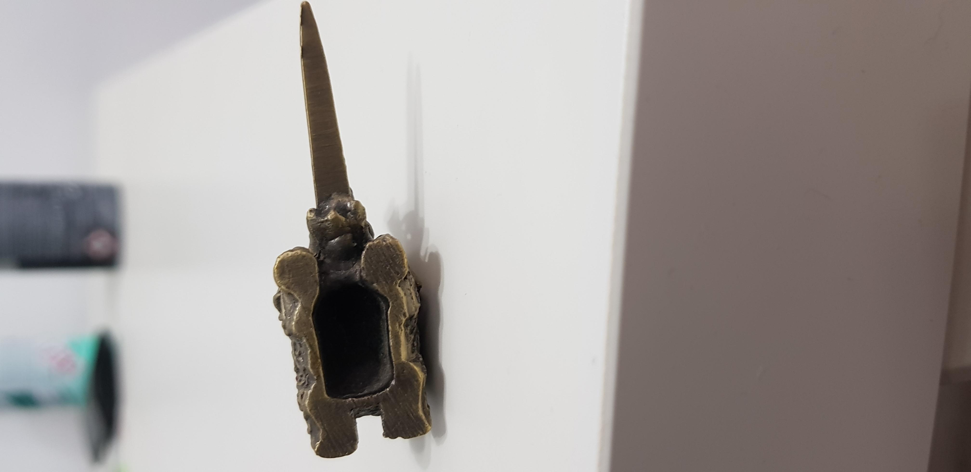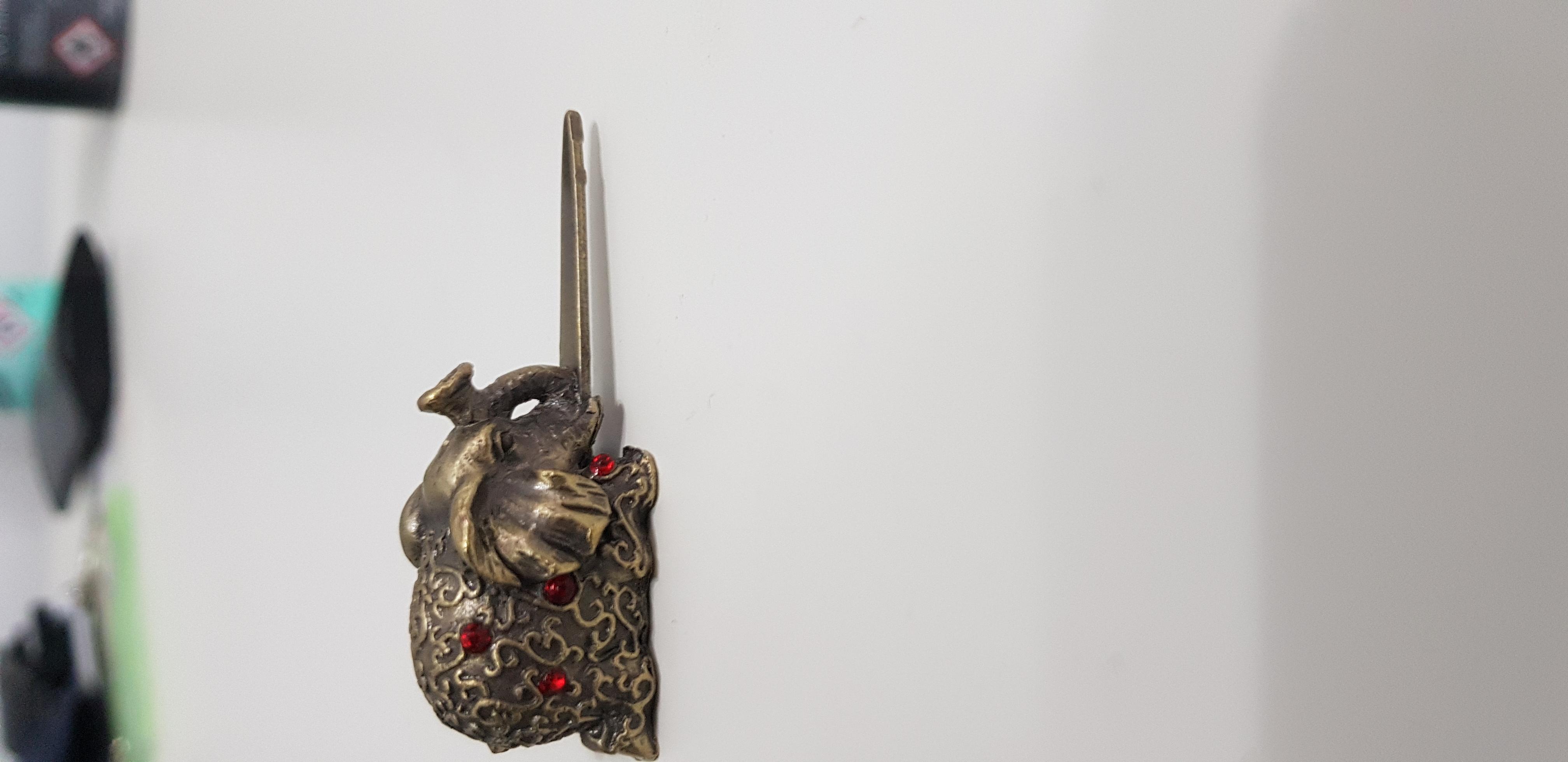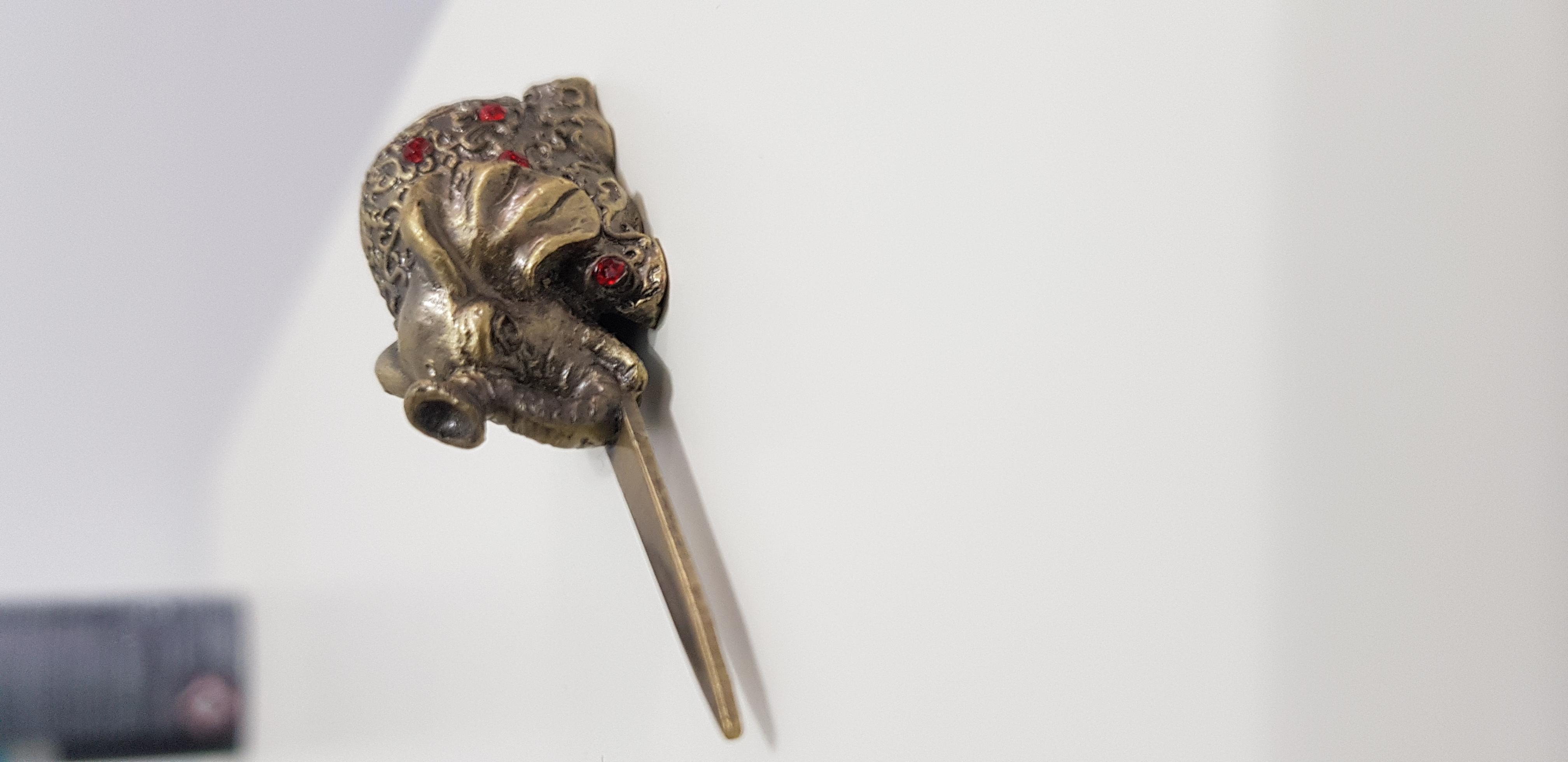 costelmarin3 if I'm not mistken that's a letter opener which is part of a 1970's brass elephant desk set. Just do a Google search on "1970's Brass Elephant Desk Set" and you'll see images of the whole set which consist of a paperweight, magnifying glass, trinket box and the letter opener. Hope this information helps.