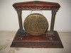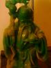Aged paint on the front is red and black etchings of woman, man and dragon / birds