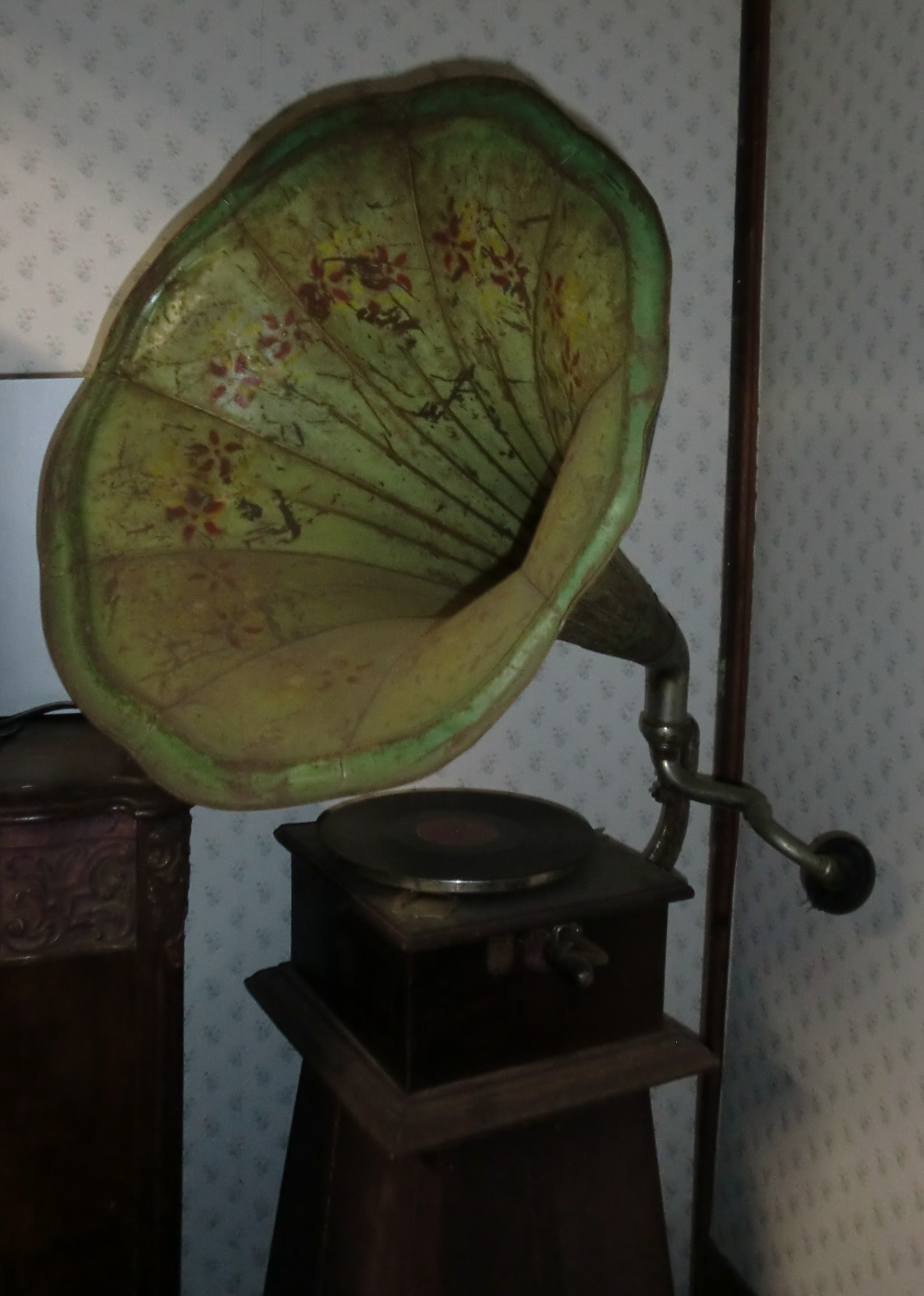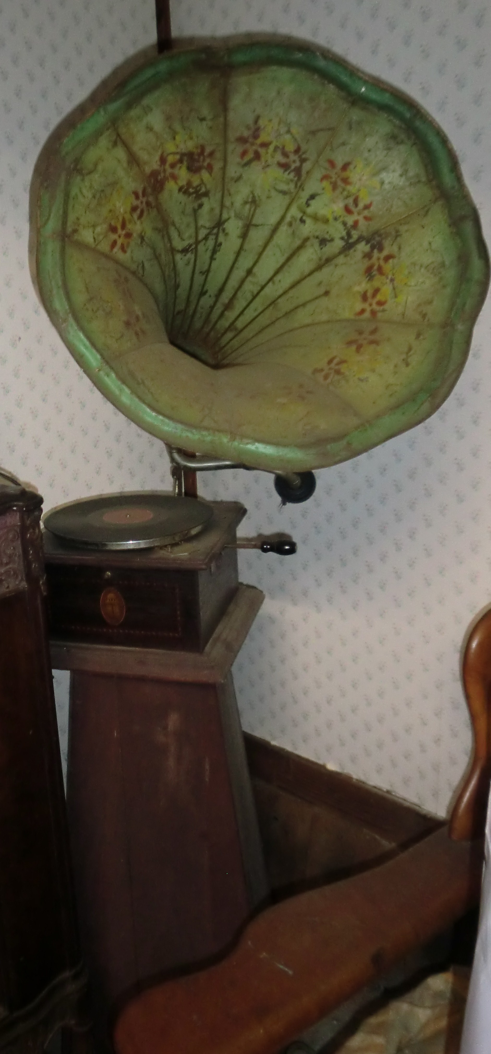 antique gramophone with paneled horn and wood stand for sale. wind it up and play a record on it. still in ok workable condition, just needs to get cleaned up and polished.