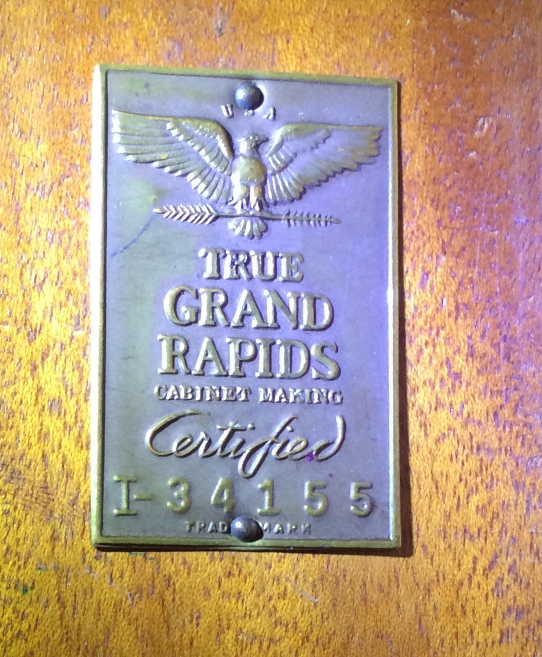 - Brass plate on the left side of top drawl reads "The Grand Rapids Cabinet Making certified I-34155"