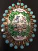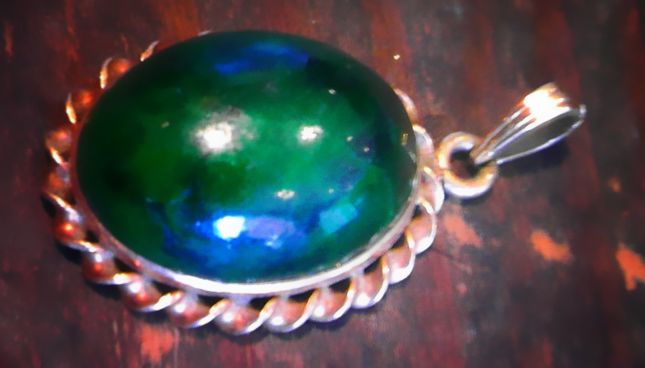 My money is on Maw Sit Sit. It is a deep green with black spots. 10k Gold Twisted wire around the bezel.1" top to bottom, including the bail, and just over 1/2" wide.