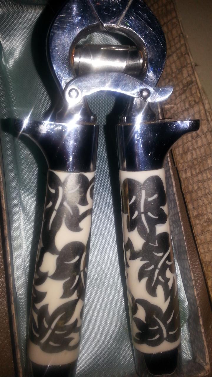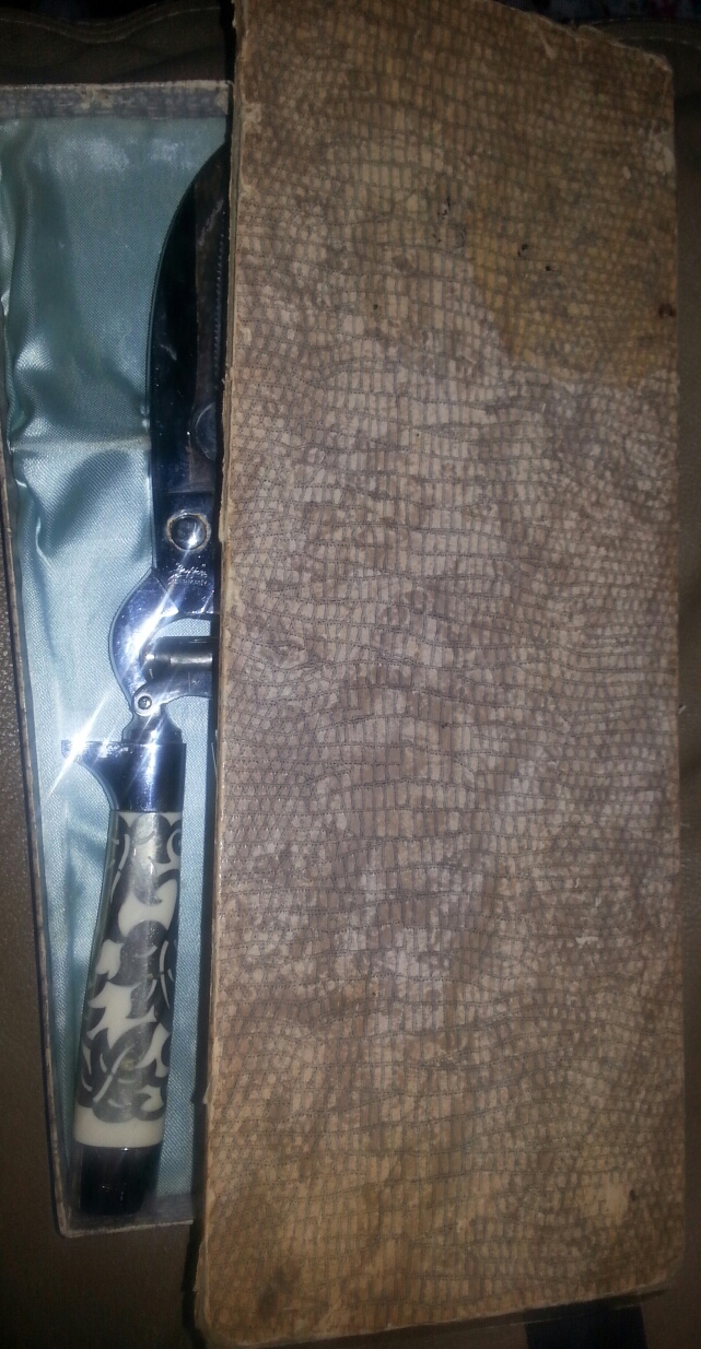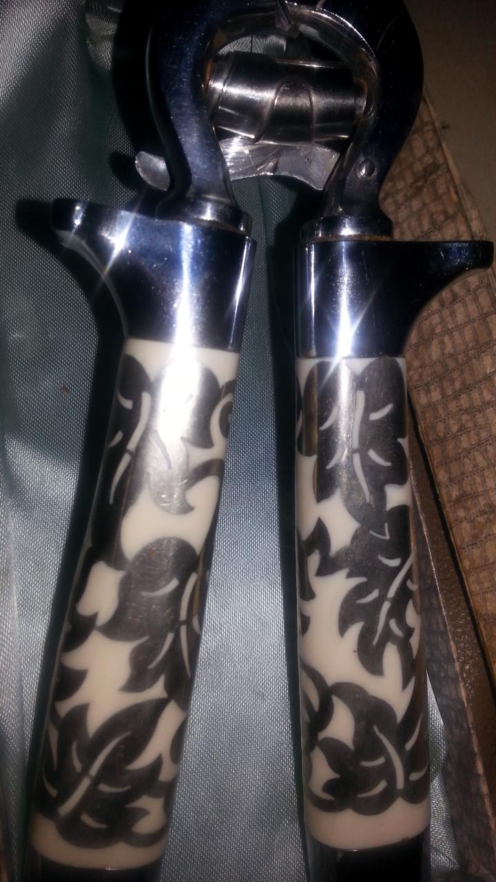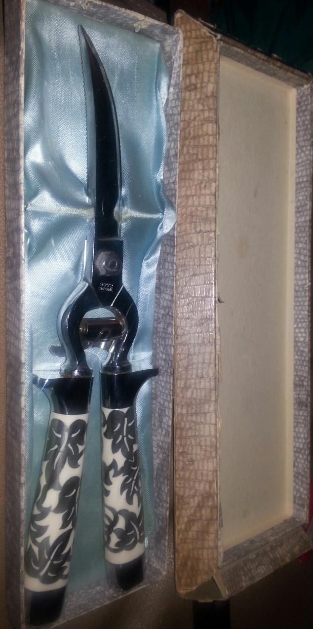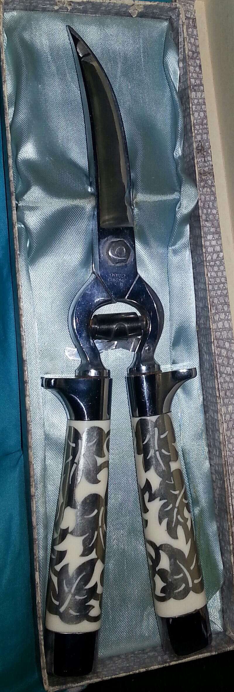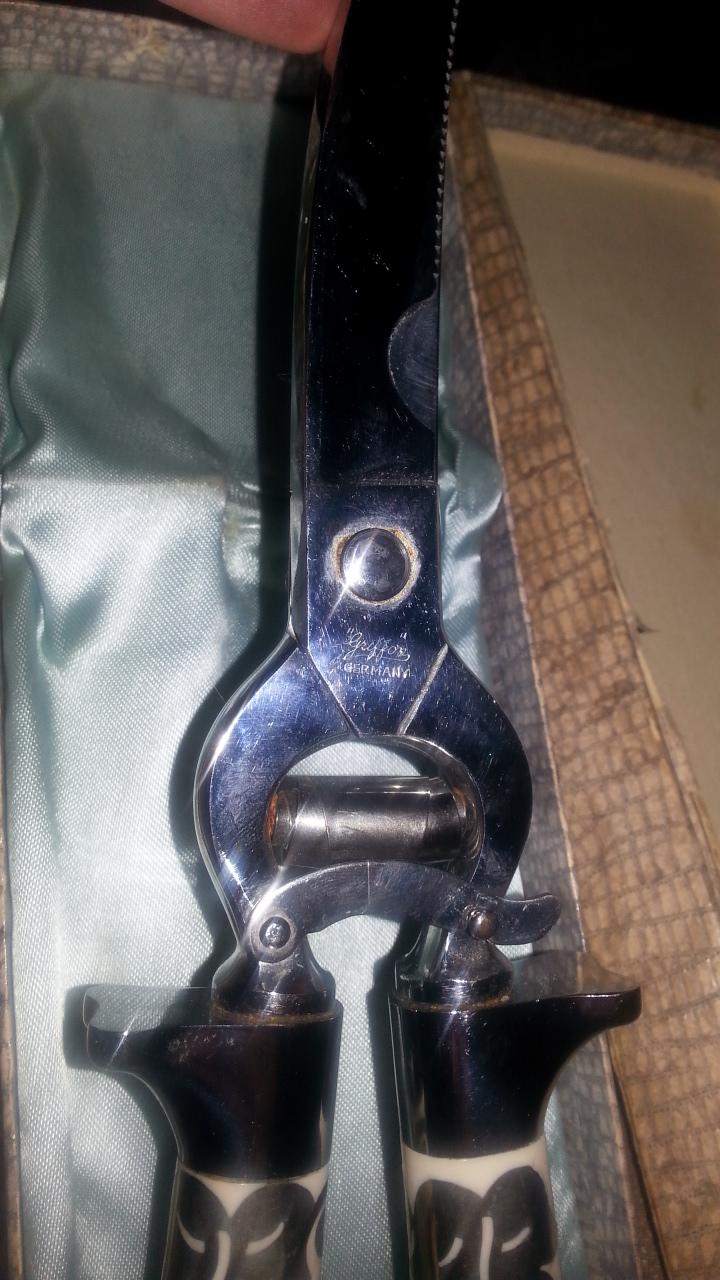 Hi there, I have been searching every source I could think of four the past 3 weeks abd have yet to find anything that congress cause to the quality of these shears. I will begin with the box it sits in. I believe this is the original box, it has a crocodile-like texture and the top expands out on all sides massing it wider. The lining if this box is silk and has placements to hold the shears. The shears themselves have very thick handled which I believe are inlaid pearl, with a white metal weaving through with the look of a vine. There is a metal lock below the hinge of the shears and both blades are curved toward the end, while one has a half circle piece missing on the inner edge. The markings on one side are scripted "Griffon" printed Germany, on the other side it is marked 9972 chrome.