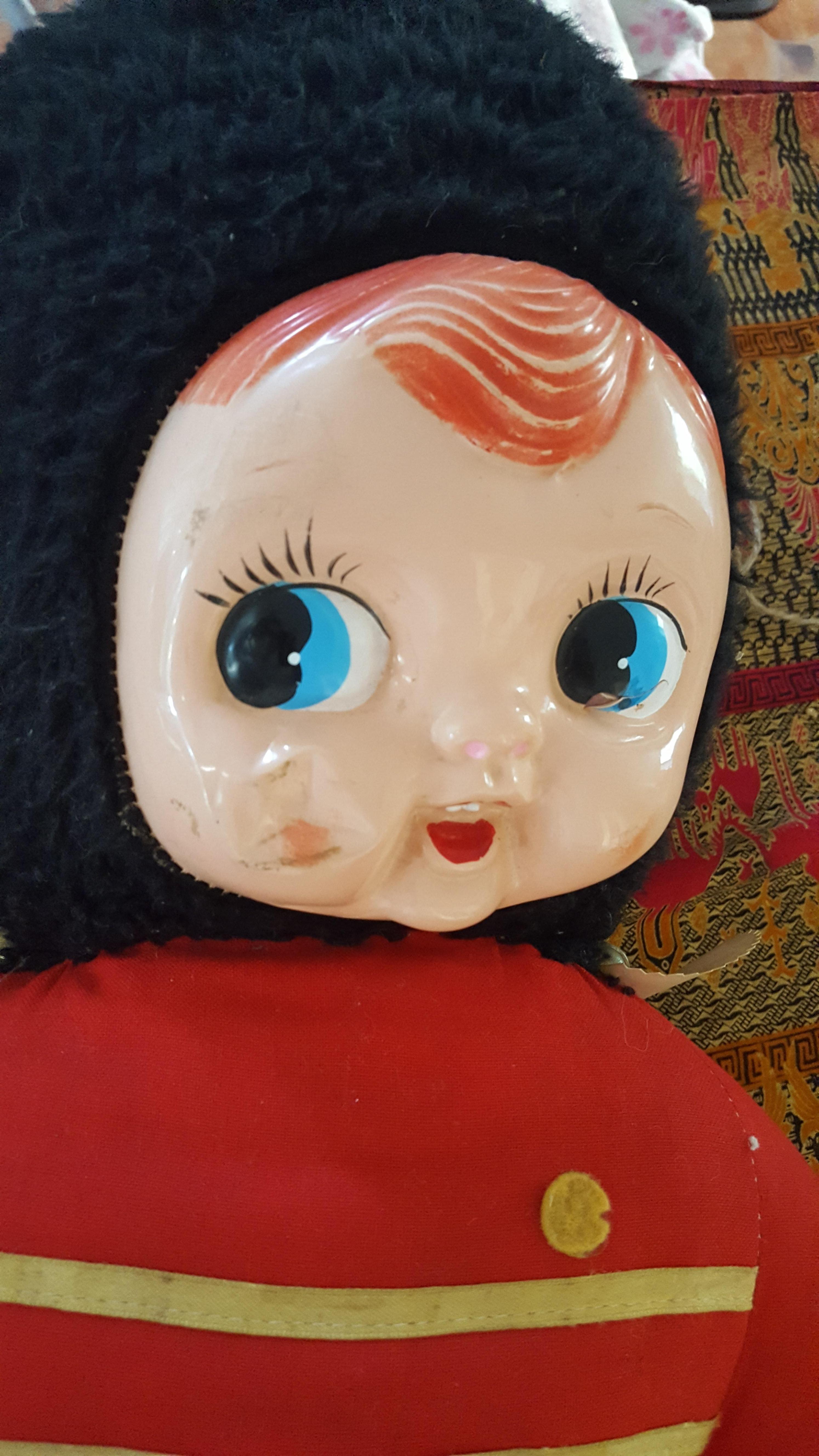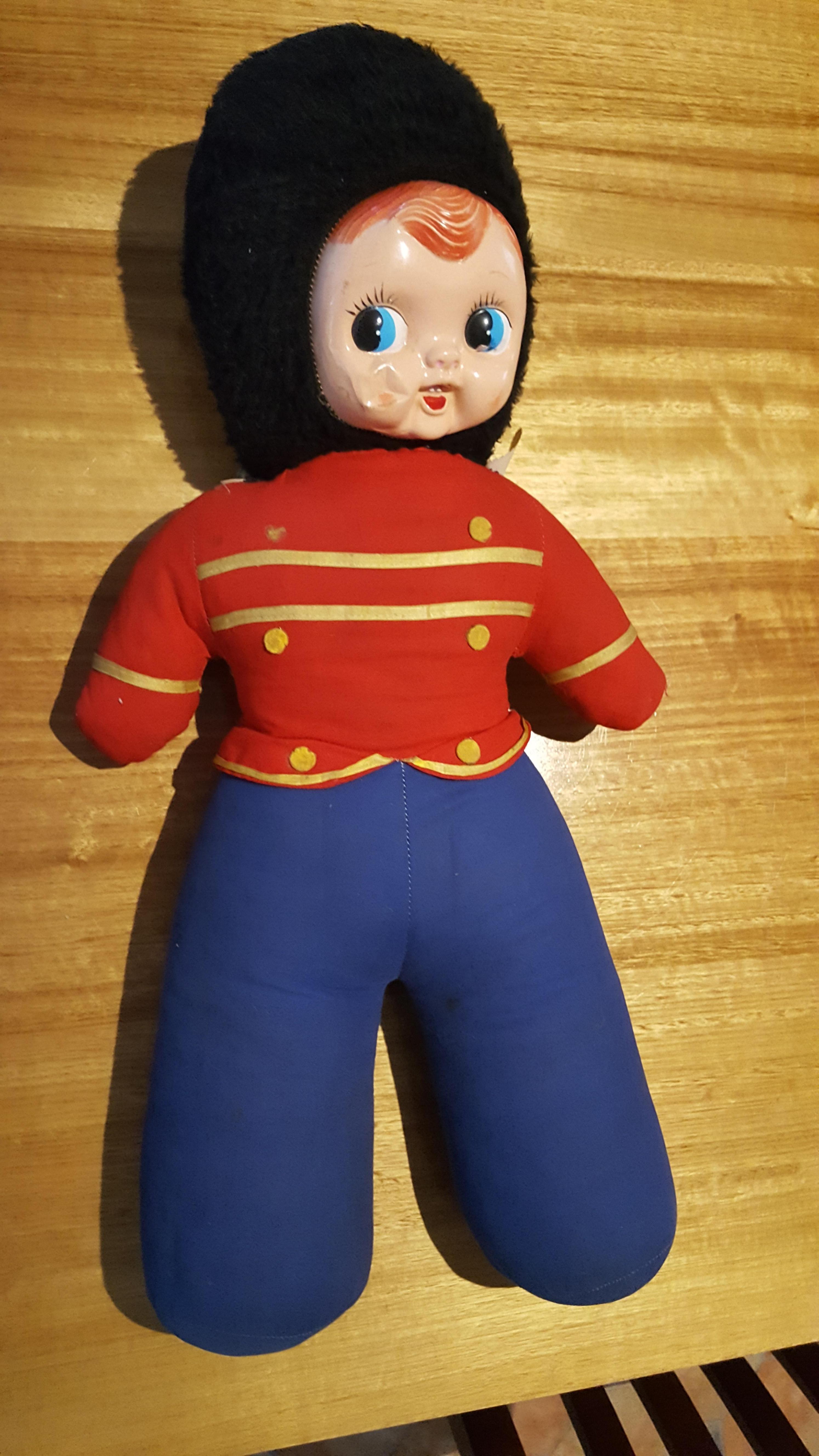 Large stuffed guardsman Soft plastic face Wanting to know maker and age estimate.