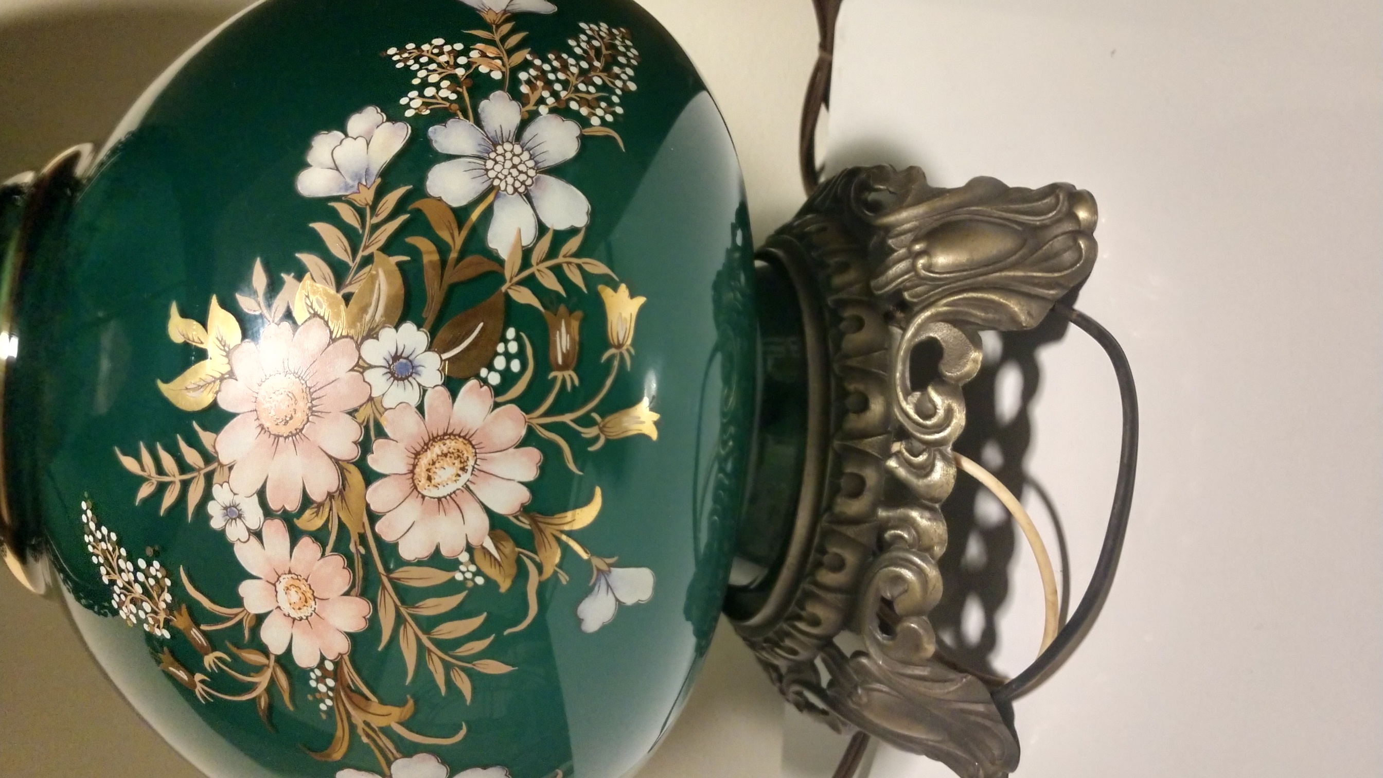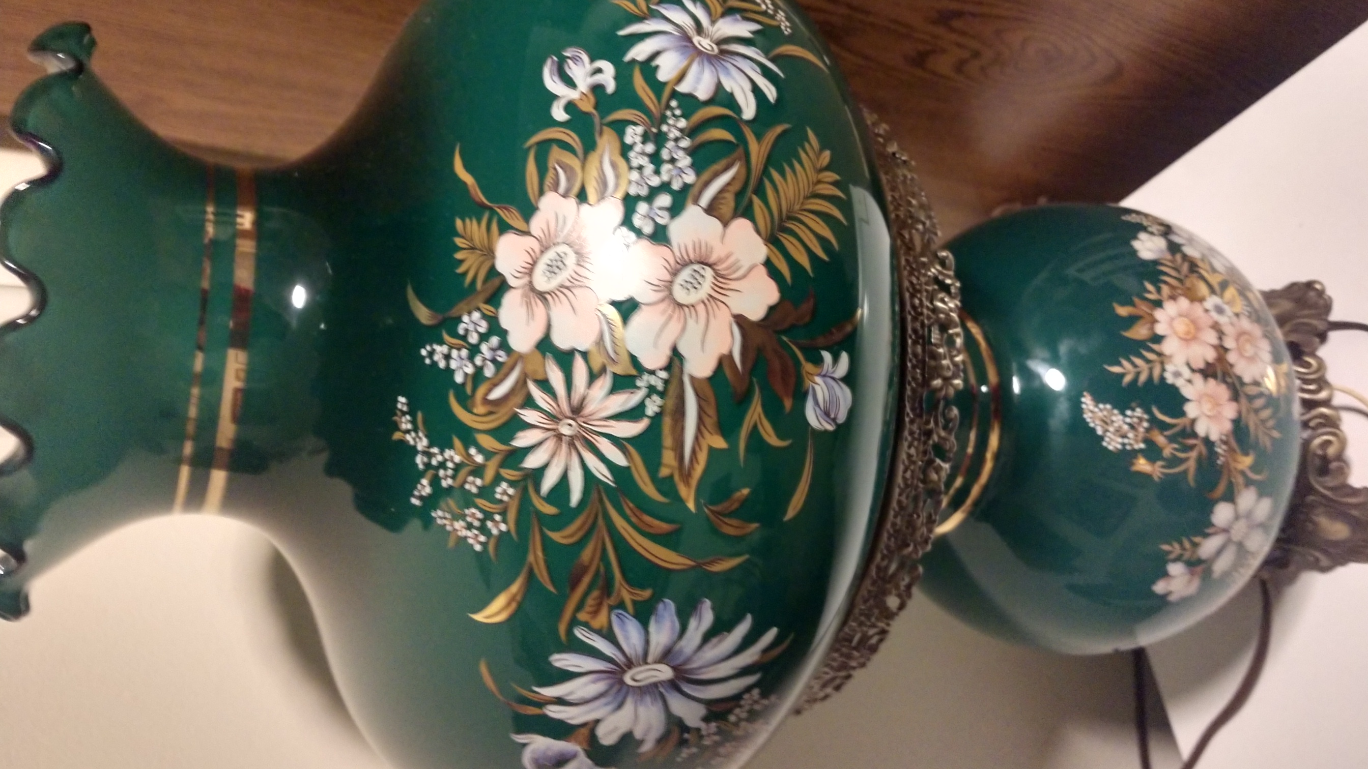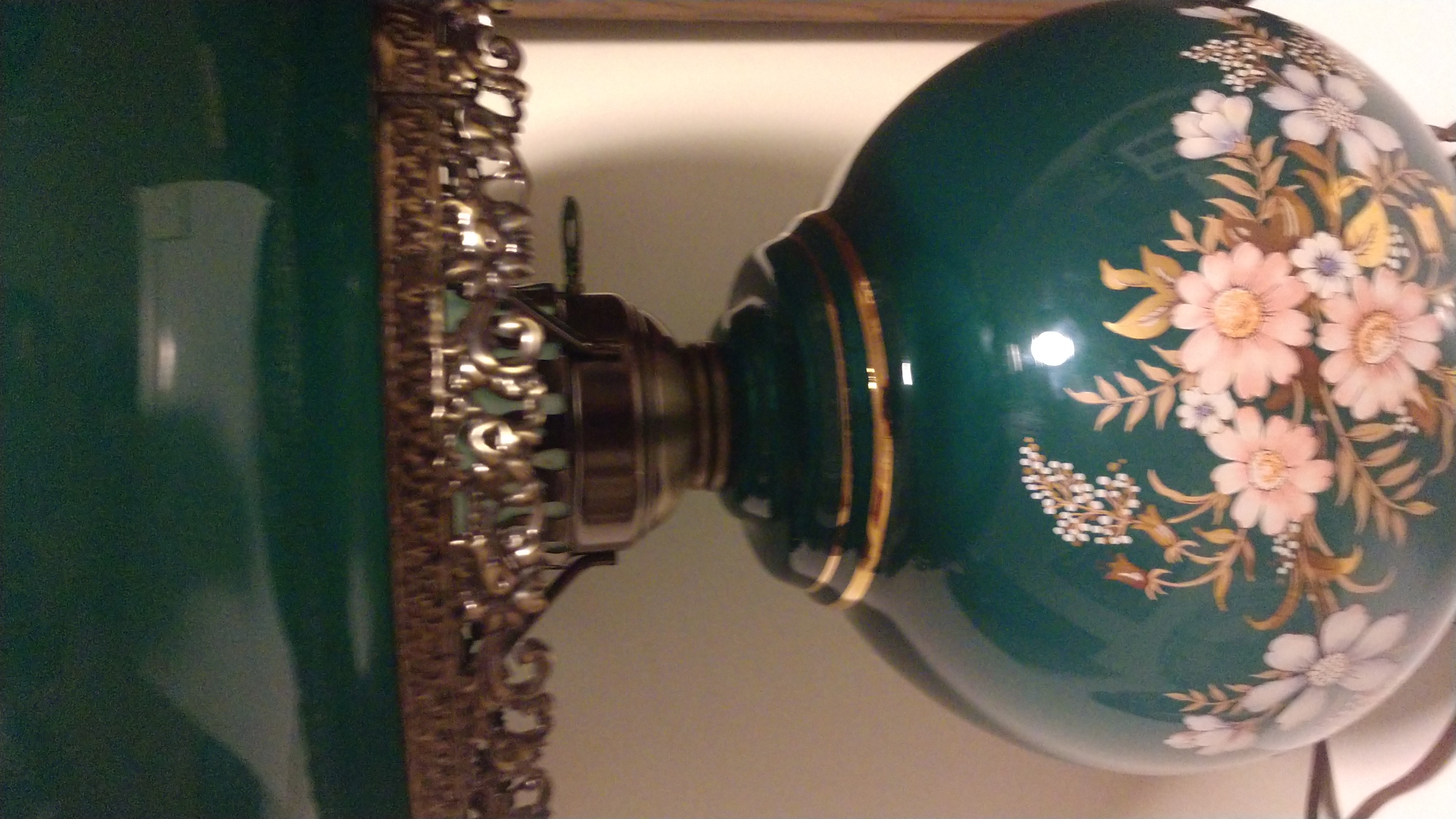 I have what I originally thought to be a Gone With The Wind type double ball lamps. It's handpainted, electric, in mint condition. However, it isn't a round ball on top. There are actually two of these and both work and are in excellent condition! There are no identifiable markings that I can see and they are 13 in. at the widest point. I only have one here in order to try to find the date, style and value of them. They are dark green with flowers, daisys and maybe Gerber daisys, and accents in gold inlay.