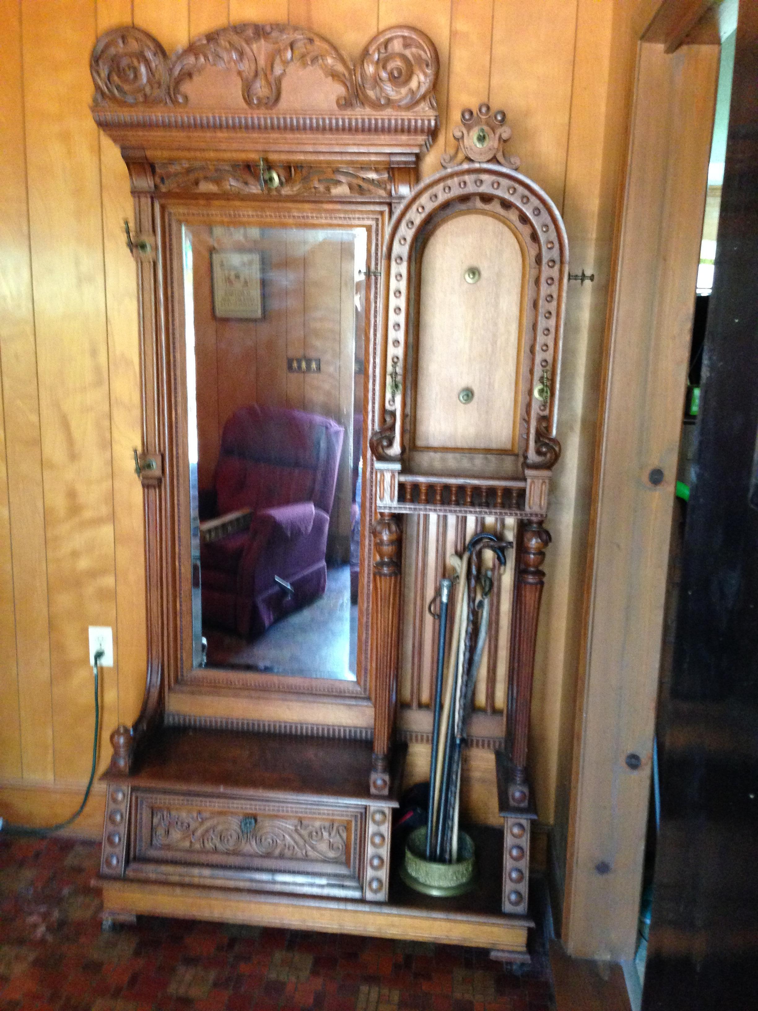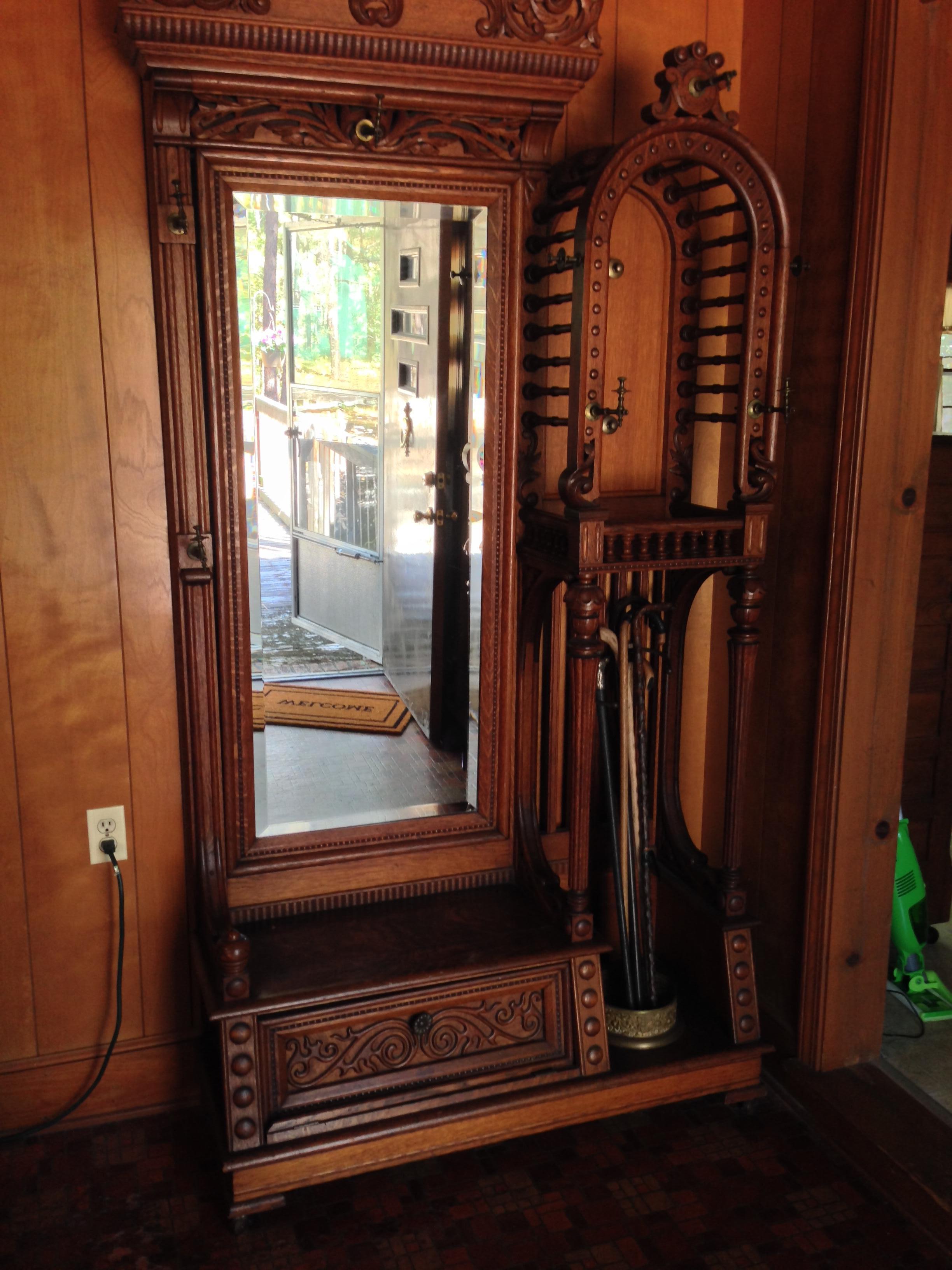 antique hall tree with full length mirror, hat racks, coat racks, unbrella stand etc. Approximately 7 1/2 feet tall and approximately 4 feet wide.