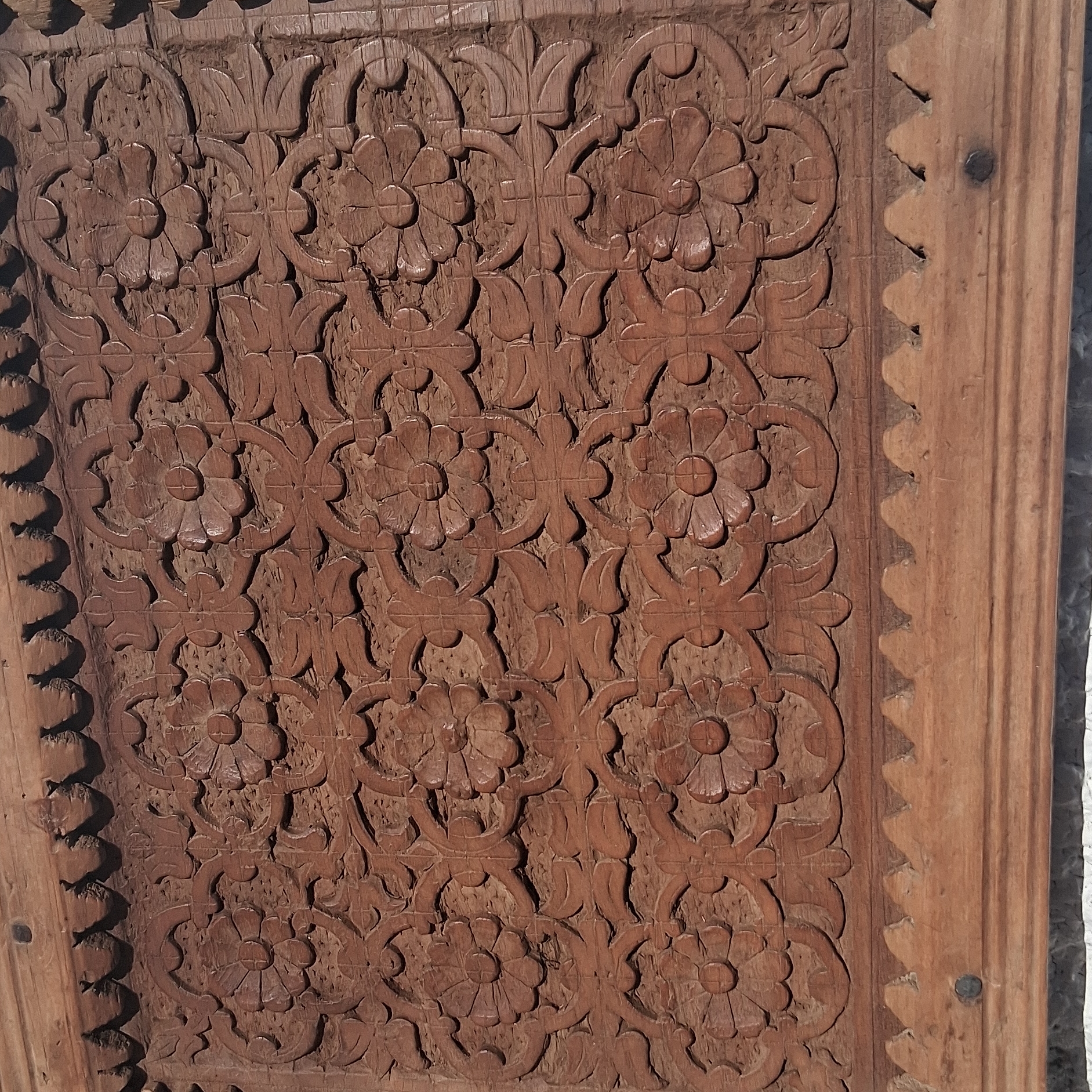 Antique Hand-Carved Brown Wooden Panel Decorative Floral Design