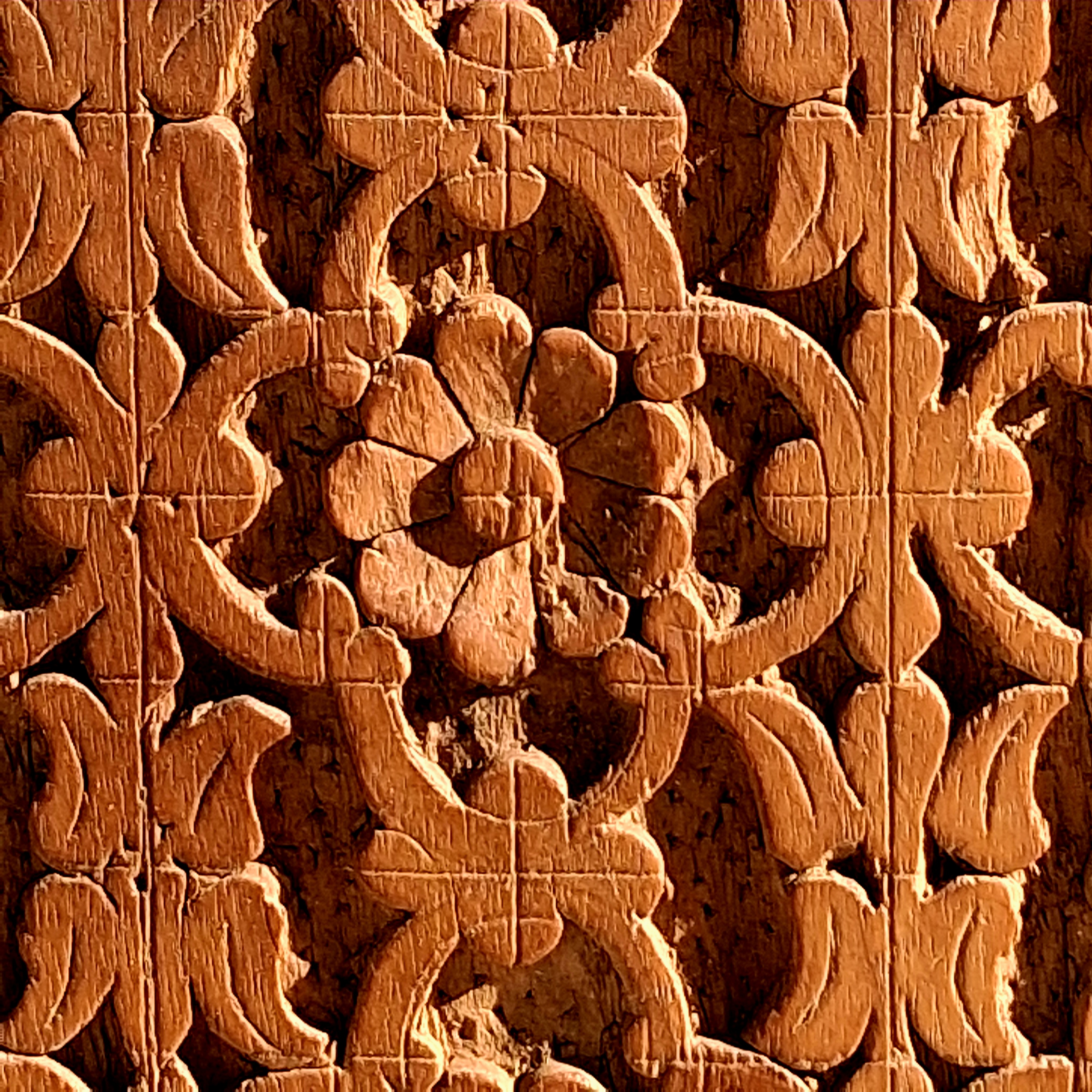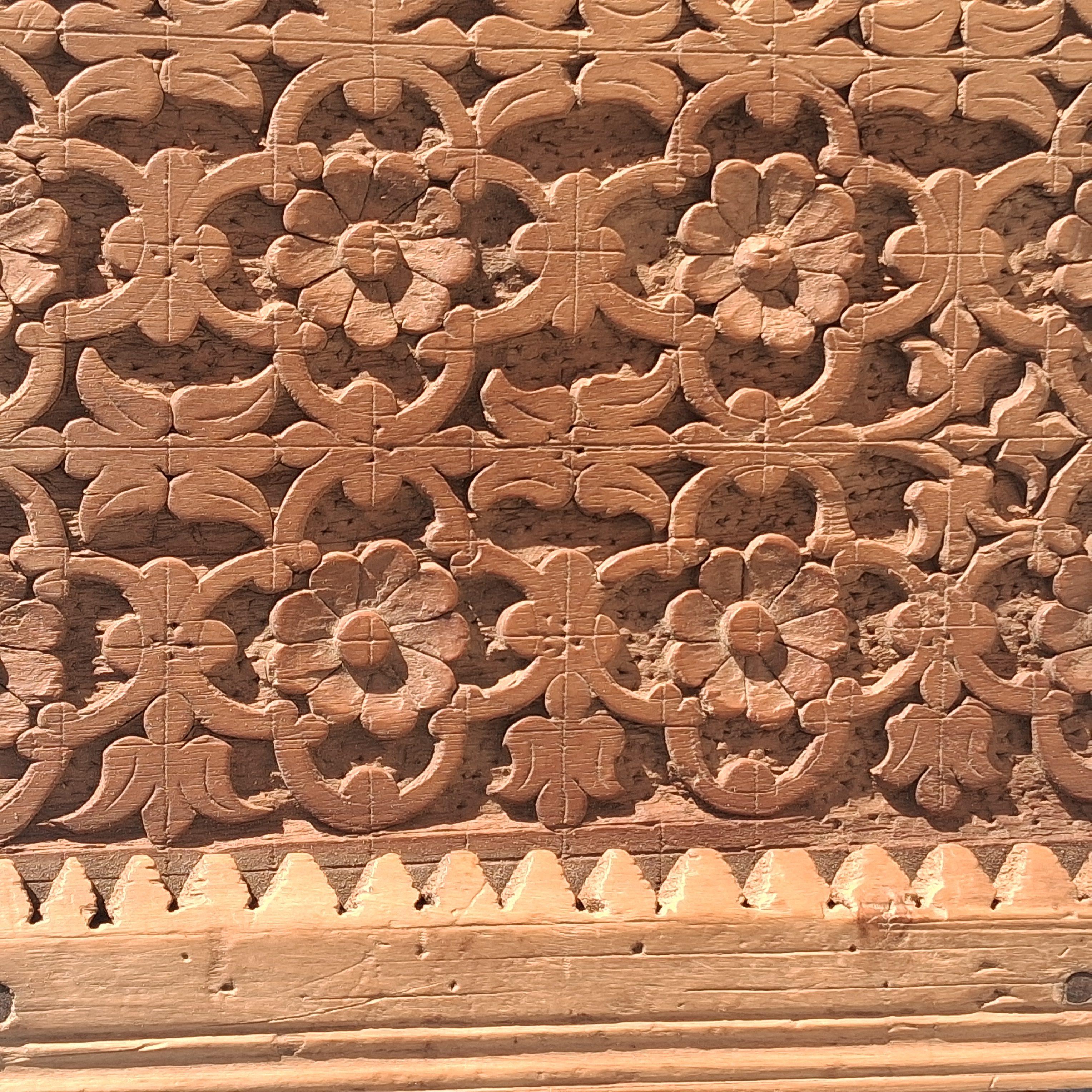 The intricate floral design and construction techniques are consistent with traditional hand-carved wooden panels from the 19th to early 20th century.