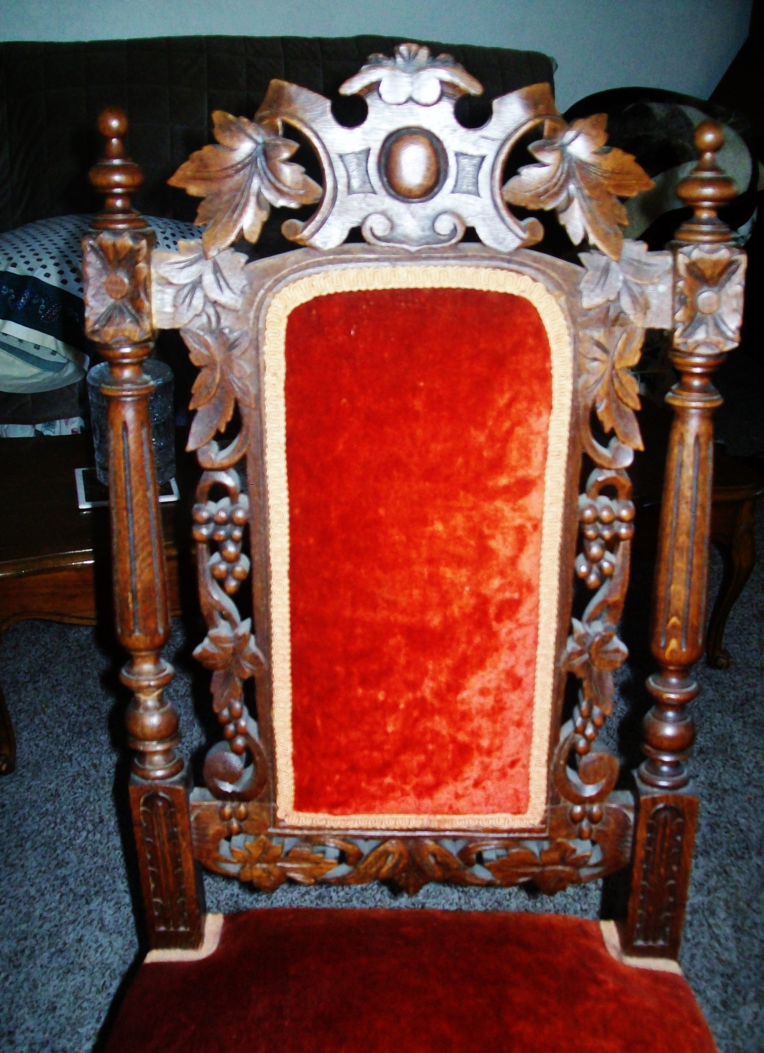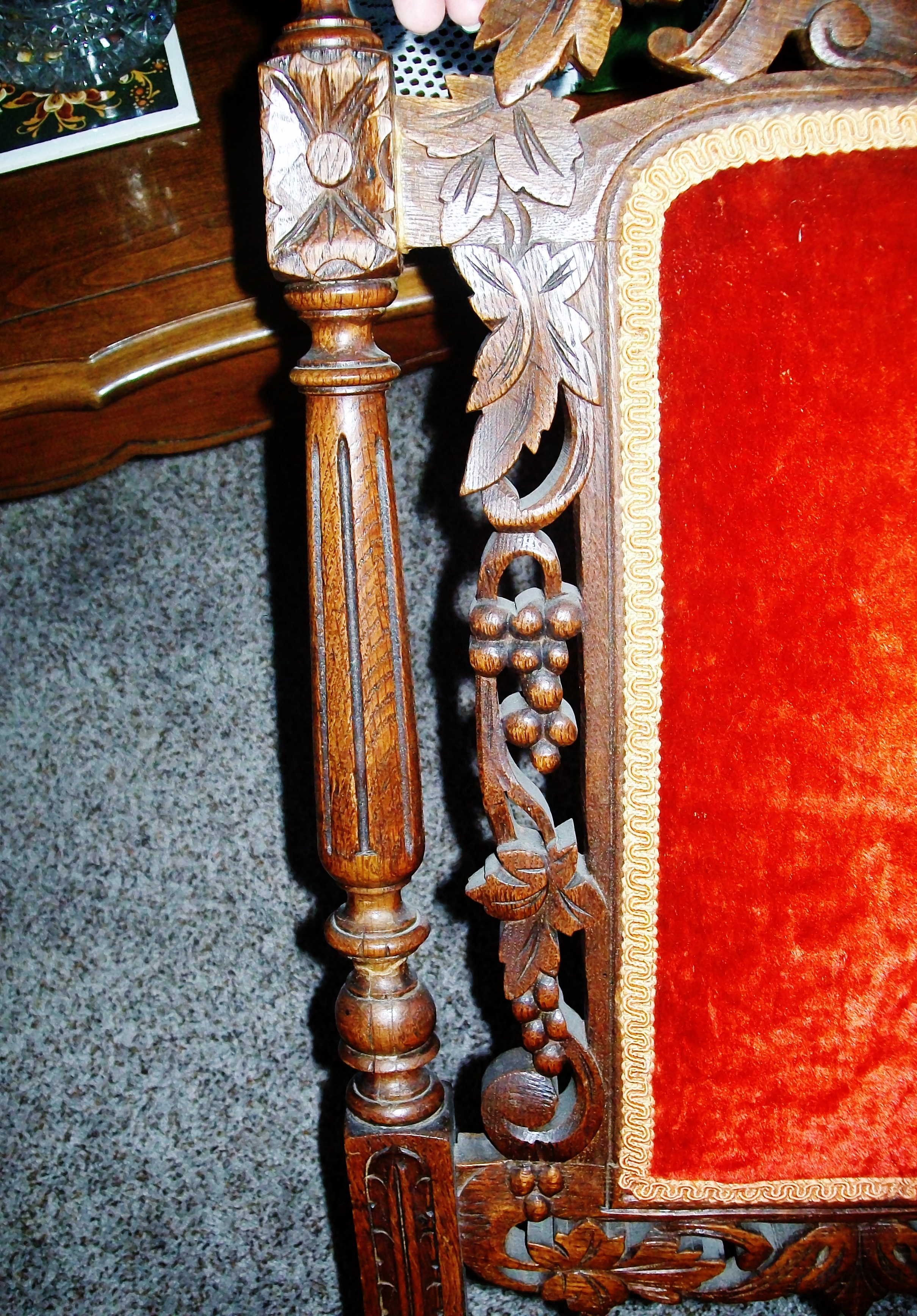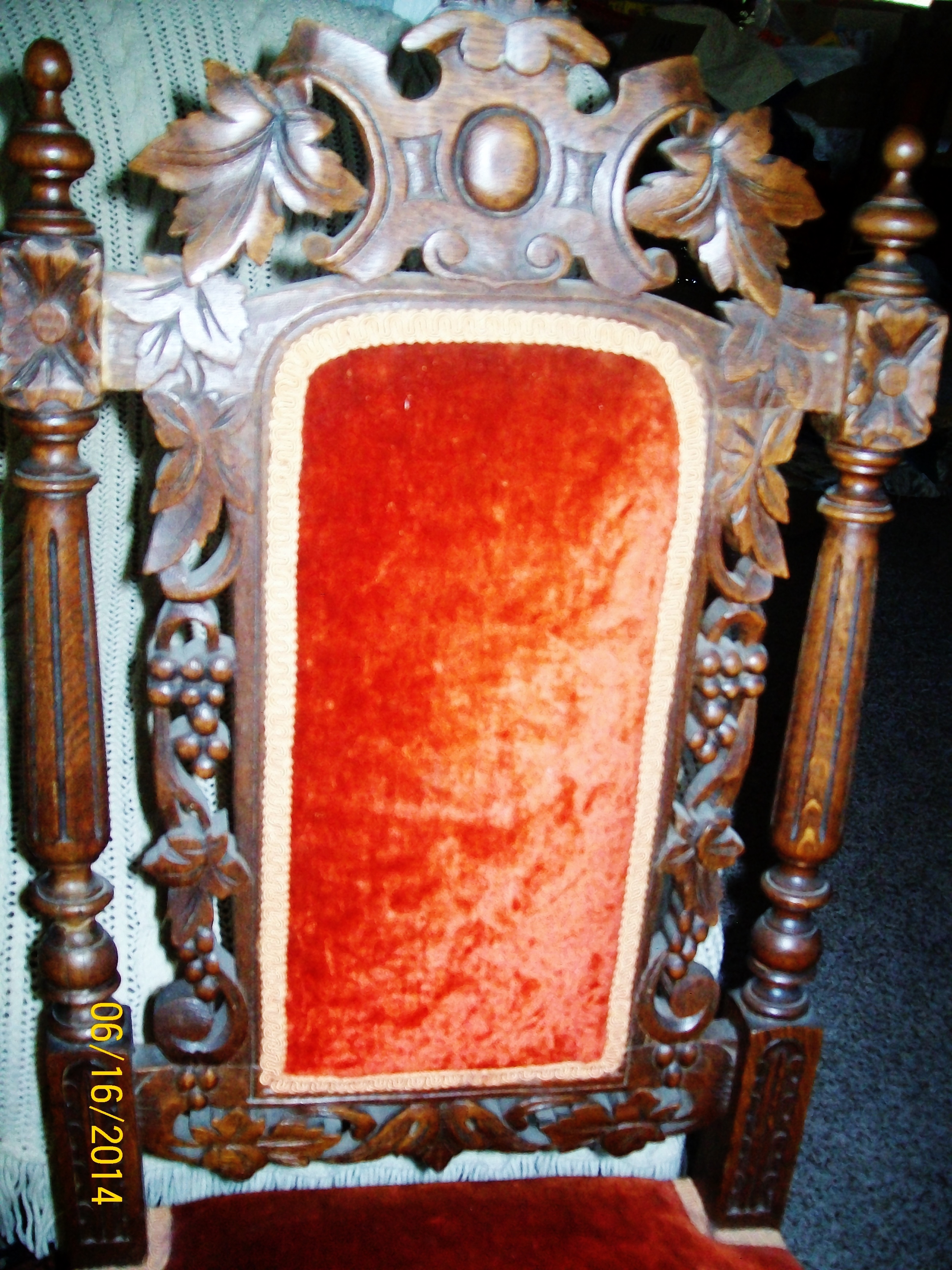 I have acquired 6 dining room chairs. They look to be handcarved with a grape & leaves theme. I believe it is oak. They are upholstered on the seat and back with a reddish orange crushed velvet type fabric. They are in good condition, there are a few areas where they look to have been glued/repaired and one "ball" on the top spindle is missing on one chair.