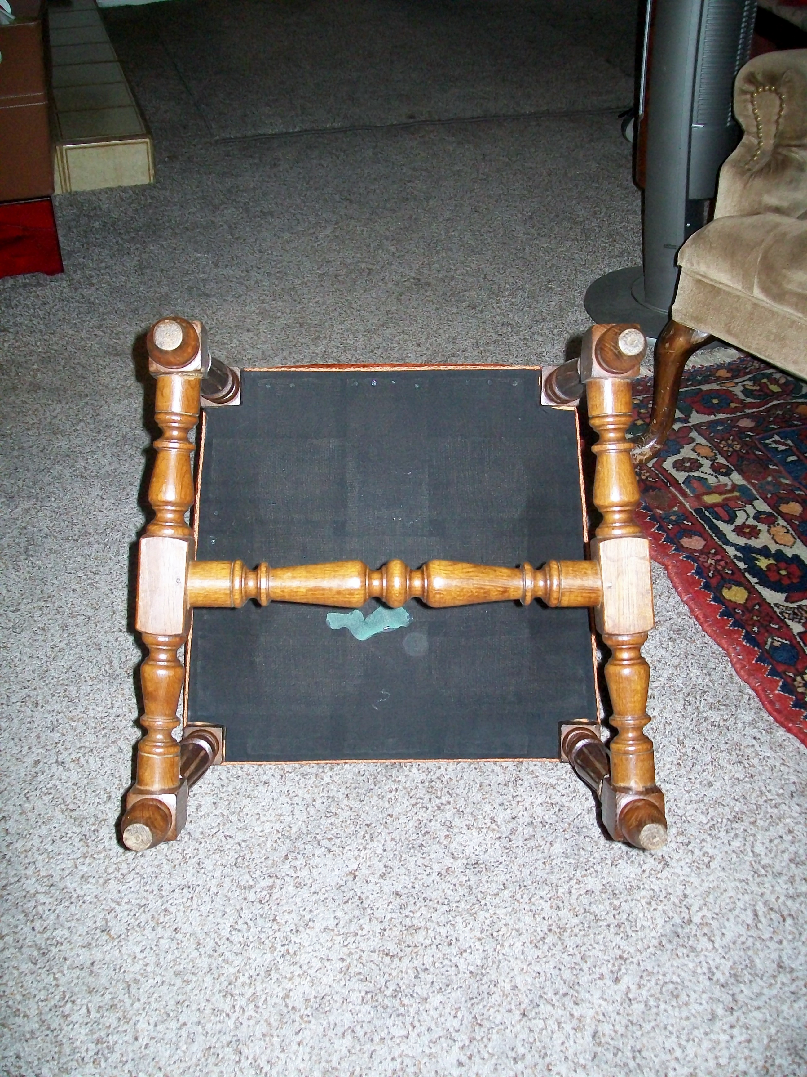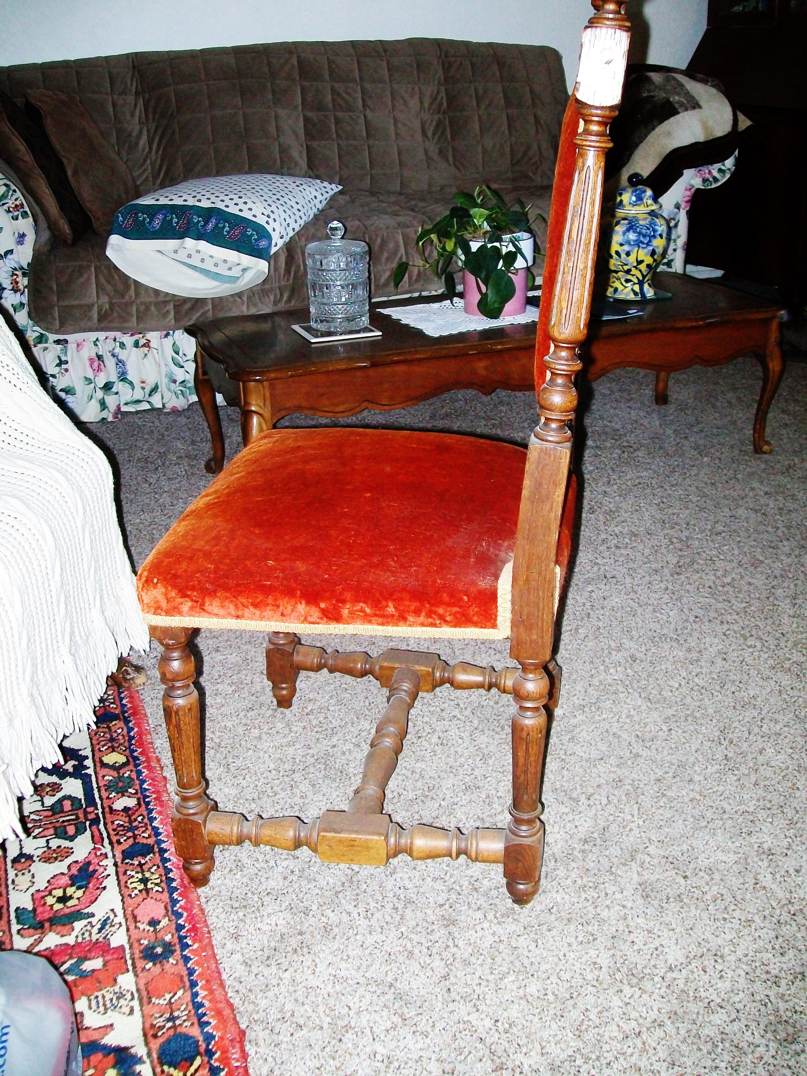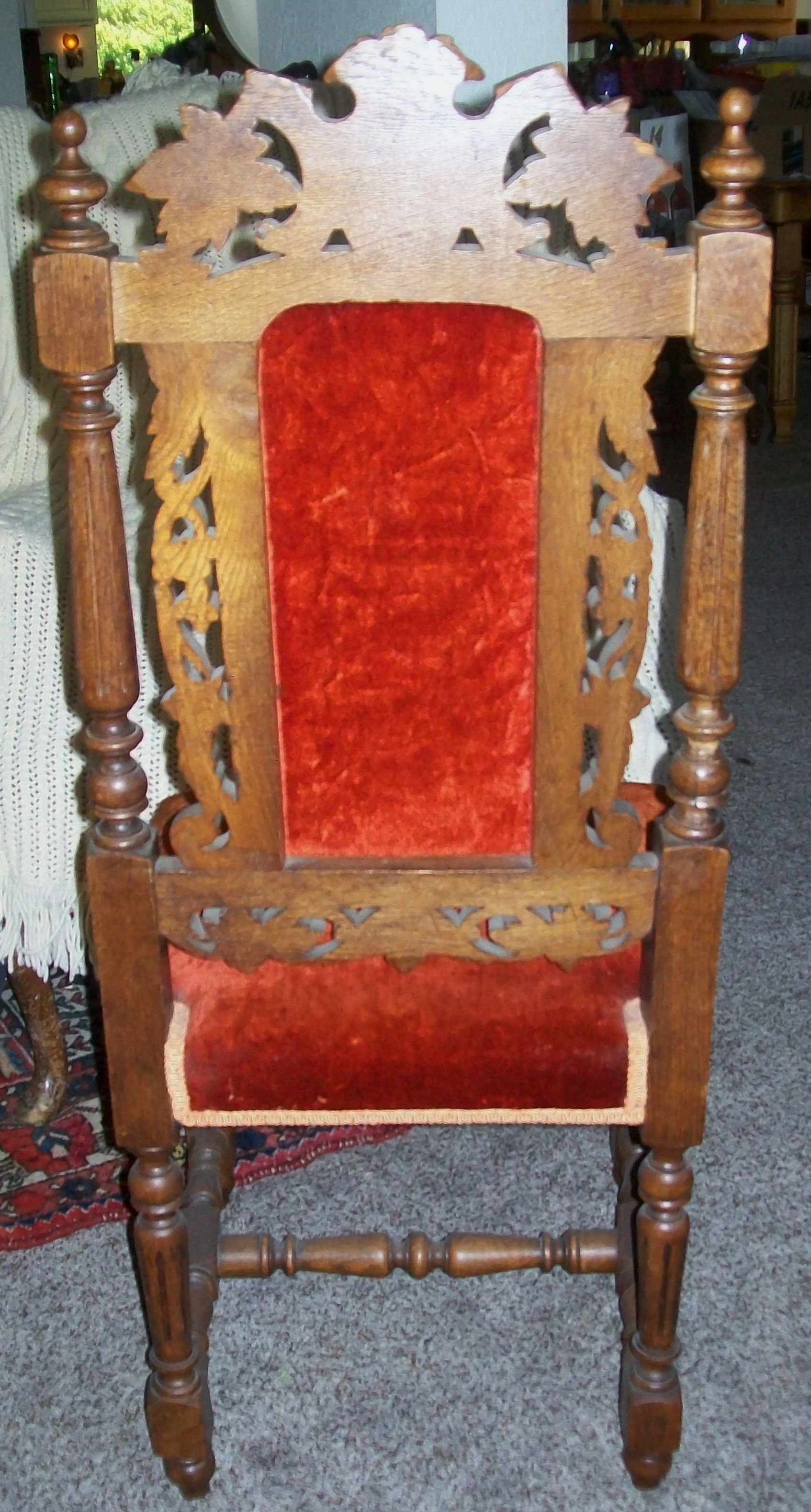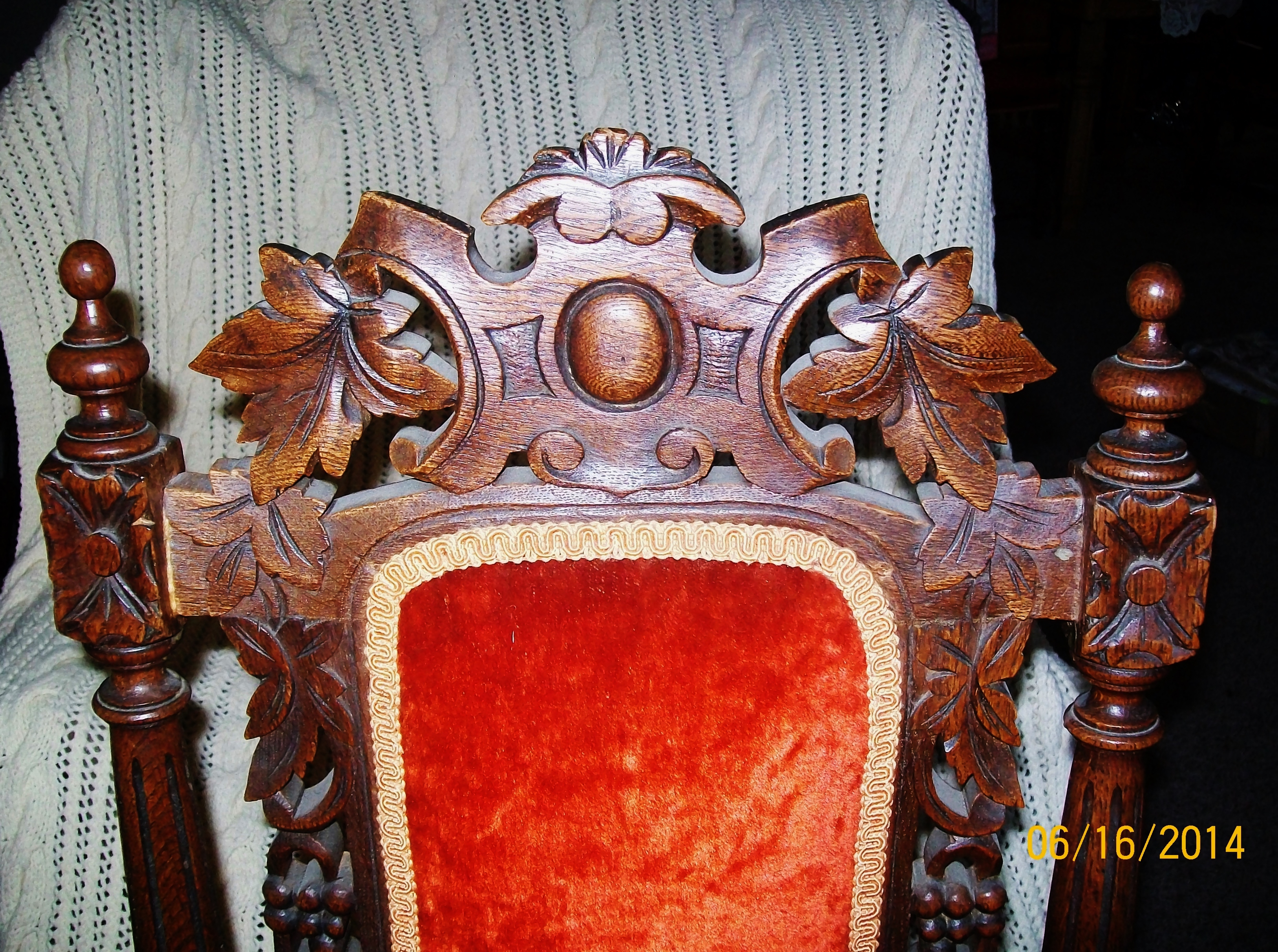 I have acquired 6 dining room chairs. They look to be handcarved with a grape & leaves theme. I believe it is oak. They are upholstered on the seat and back with a reddish orange crushed velvet type fabric. They are in good condition, there are a few areas where they look to have been glued/repaired and one "ball" on the top spindle is missing on one chair.