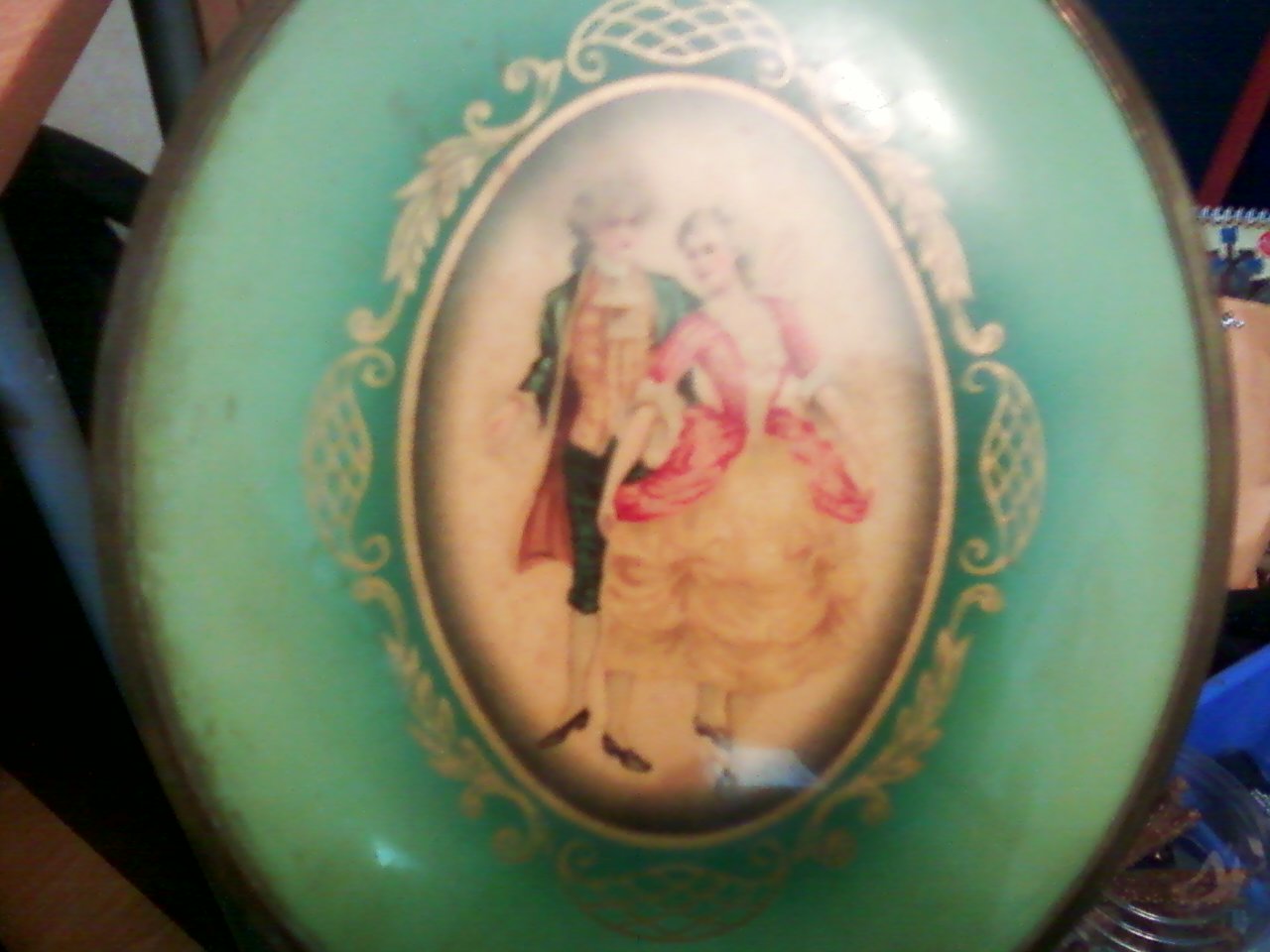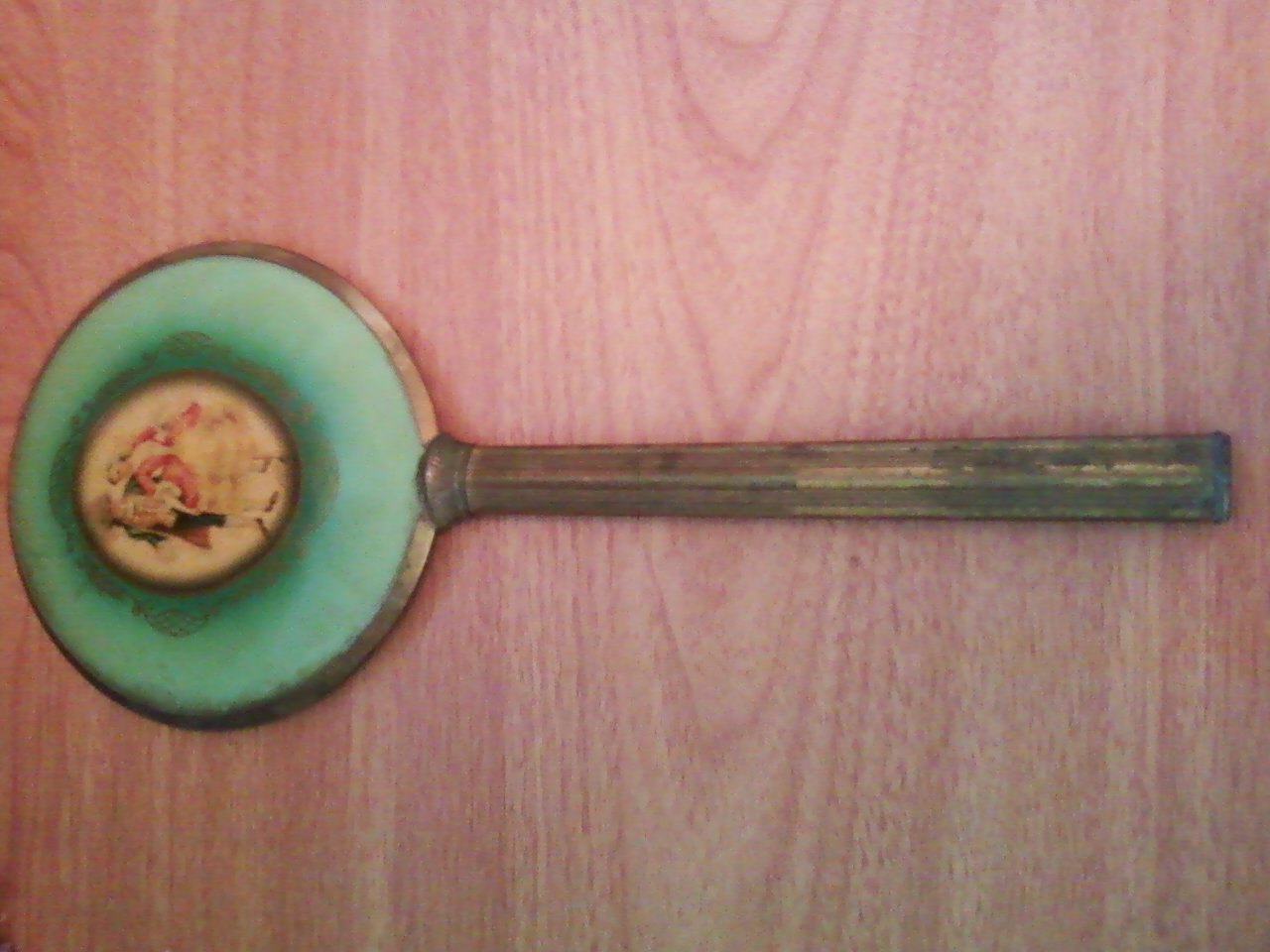 An old hand mirror with a copper frame and fine artwork on the reverse side. Material that the artwork is on is unknown. Artwork appears to be of a late18th century high class couple. Any insight as to this item's worth and background would be nice.