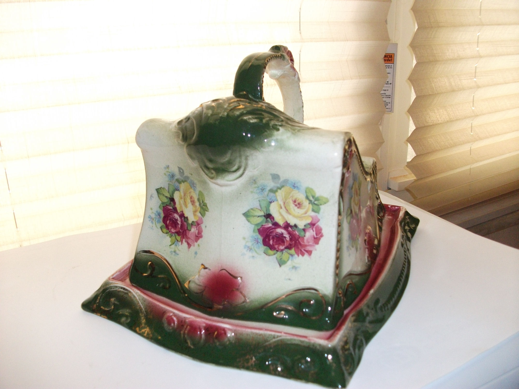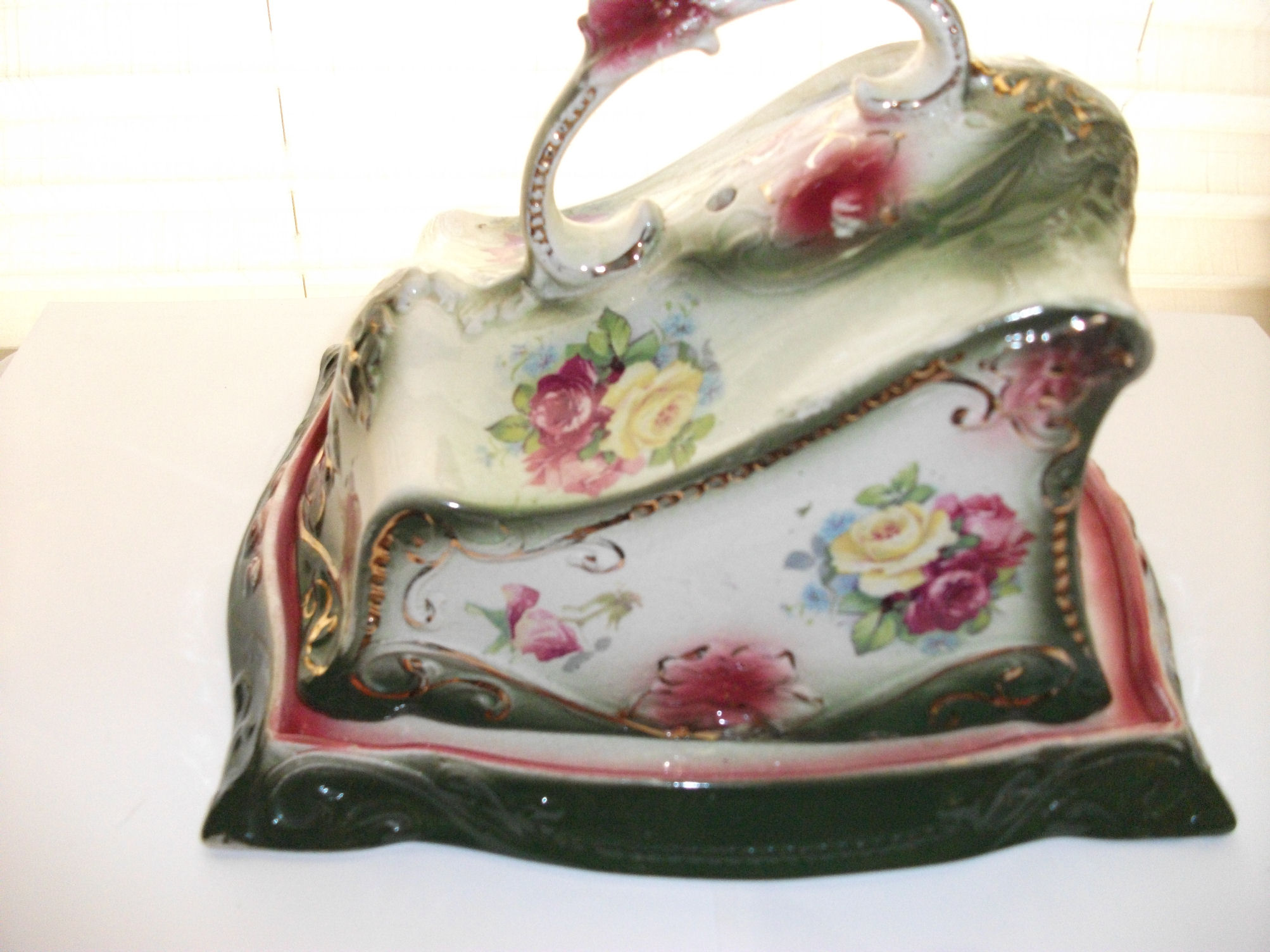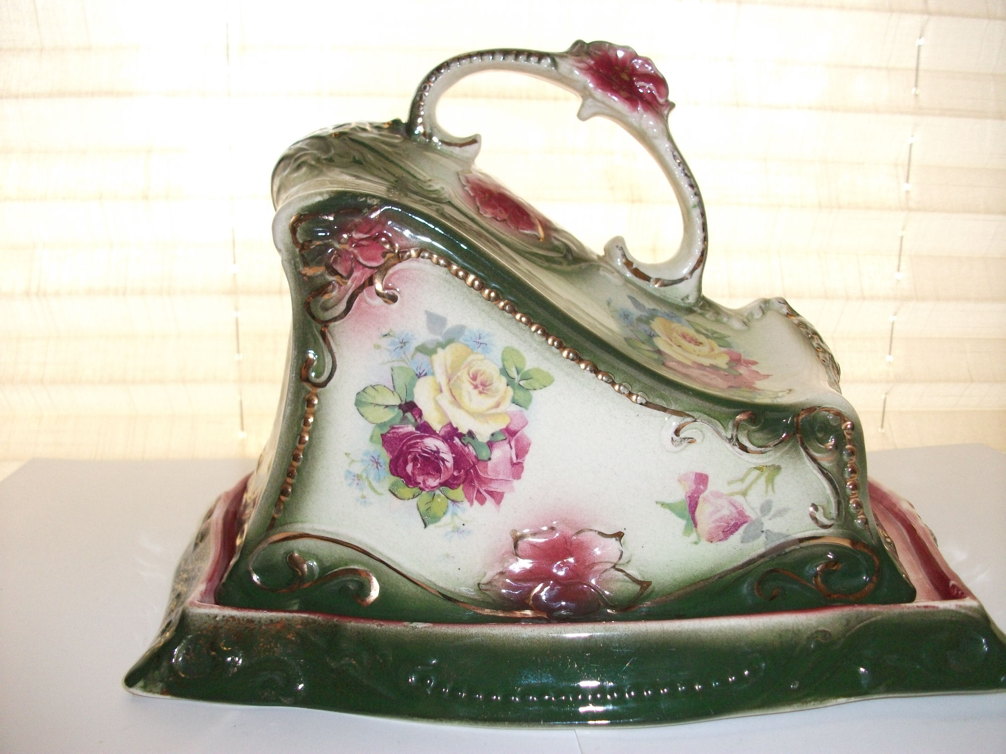 This is an antique cheese dish with cover lid. It was left to me by my Mother. It has no makers mark or stamp. It is variations of green with hand painted pink and yellow roses and gold gild. It measures 7" high to handle x 8 3/4" wide from front to back 7" and 7"deep. Condition is excellent for age. No cracks, chips or breaks. Minor paint worn and some crazing.