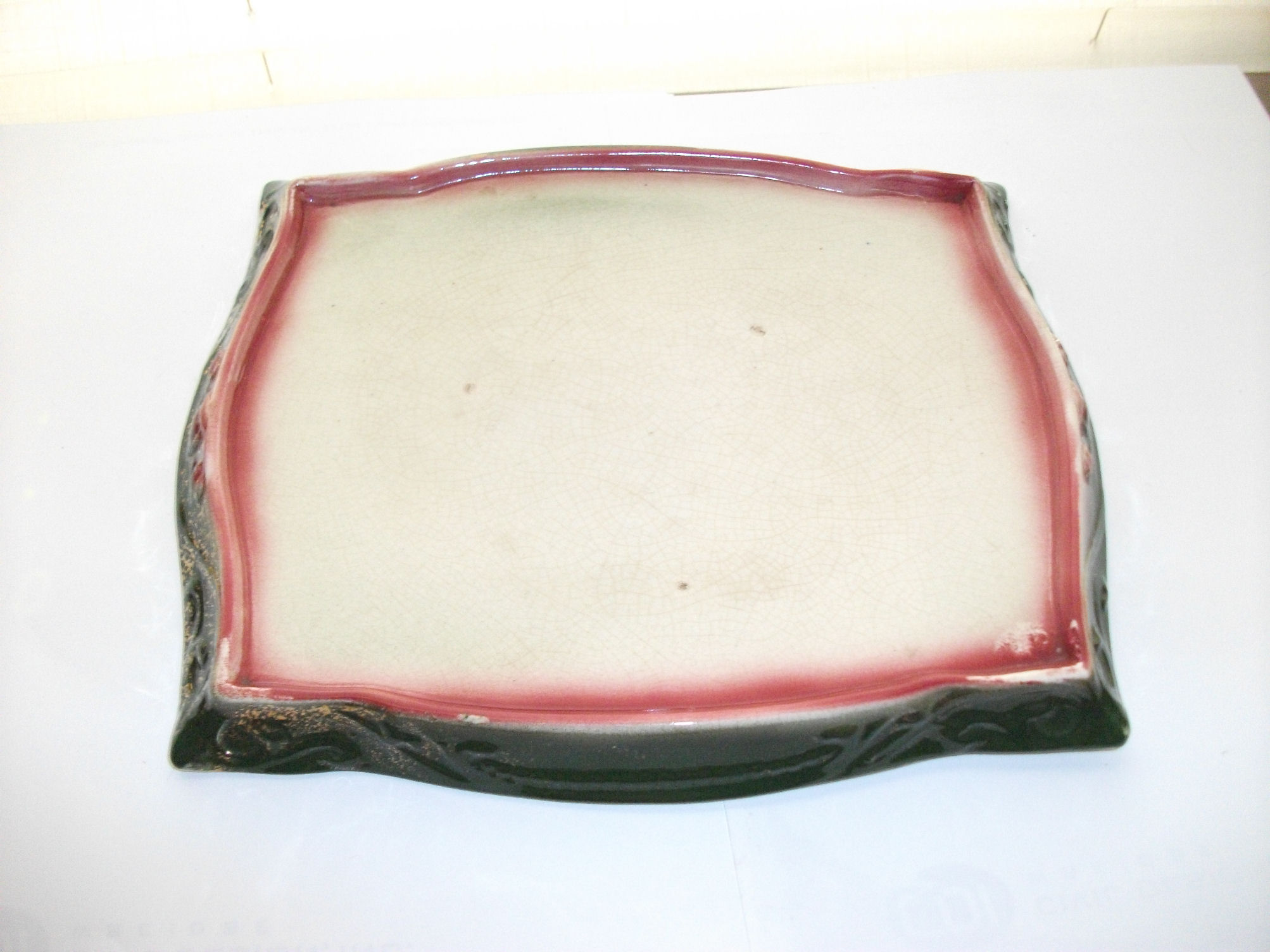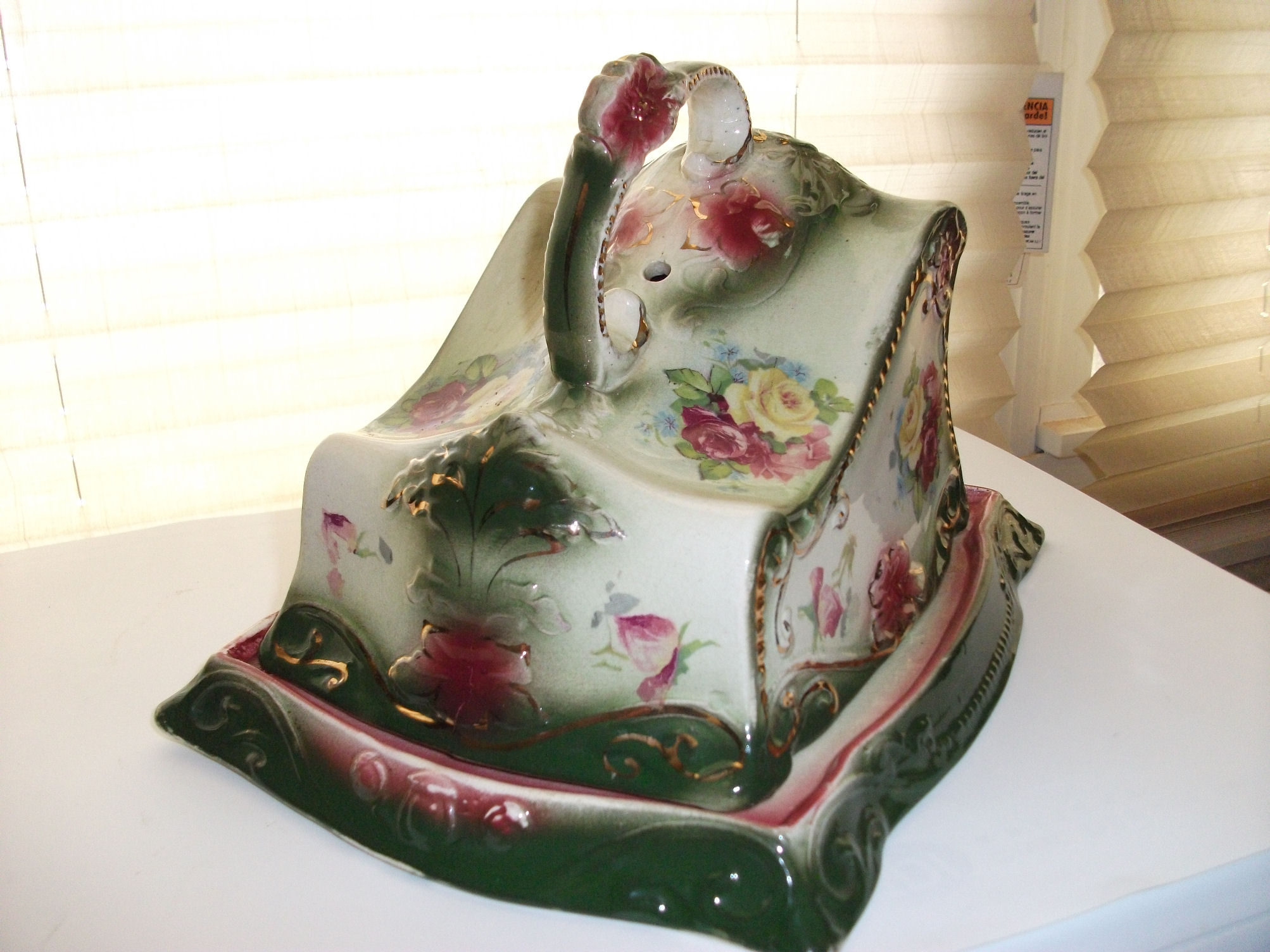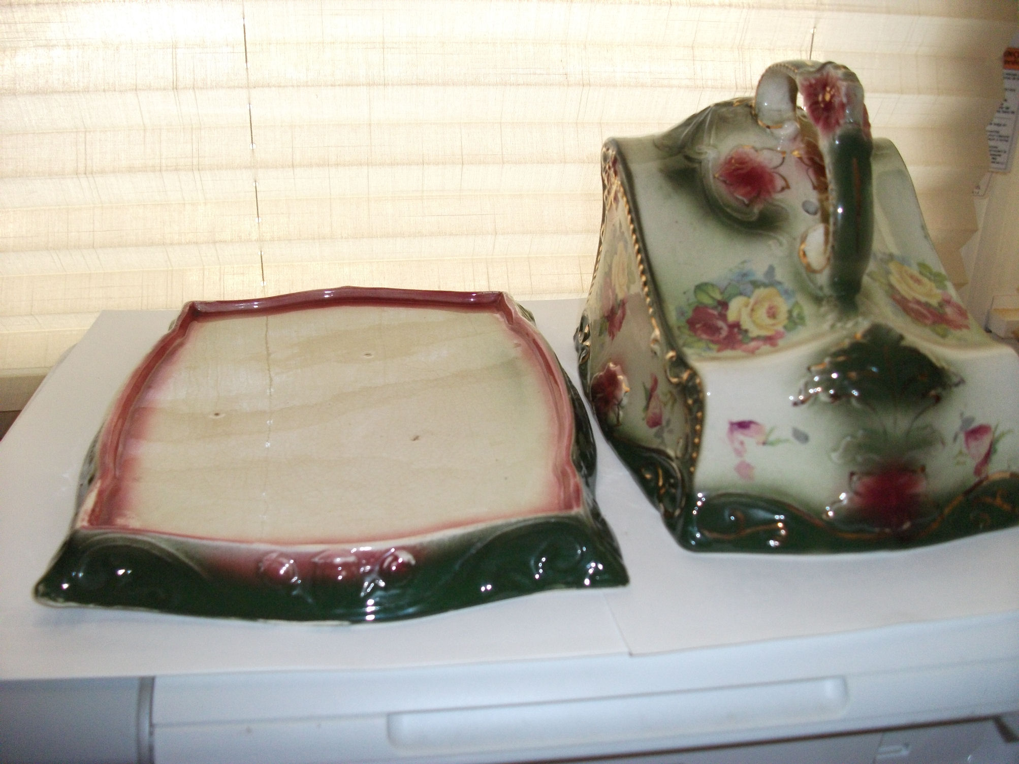 This is an antique cheese dish with cover lid. It was left to me by my Mother. It has no makers mark or stamp. It is variations of green with hand painted pink and yellow roses and gold gild. It measures 7" high to handle x 8 3/4" wide from front to back 7" and 7"deep. Condition is excellent for age. No cracks, chips or breaks. Minor paint worn and some crazing.